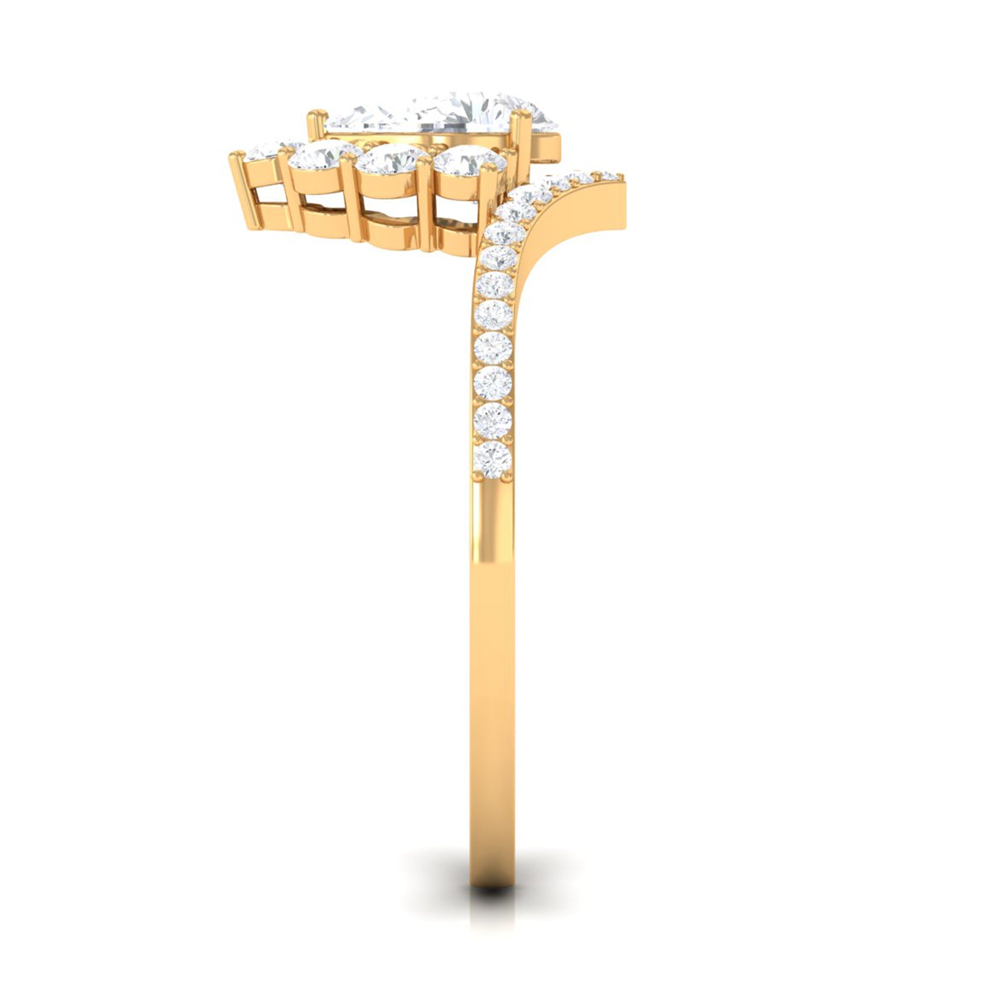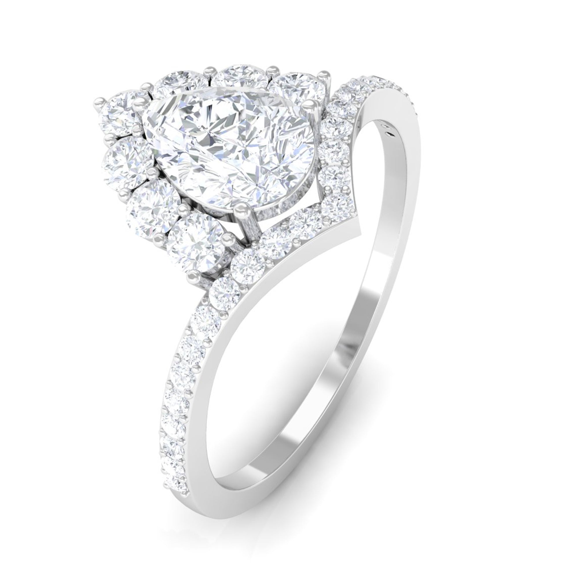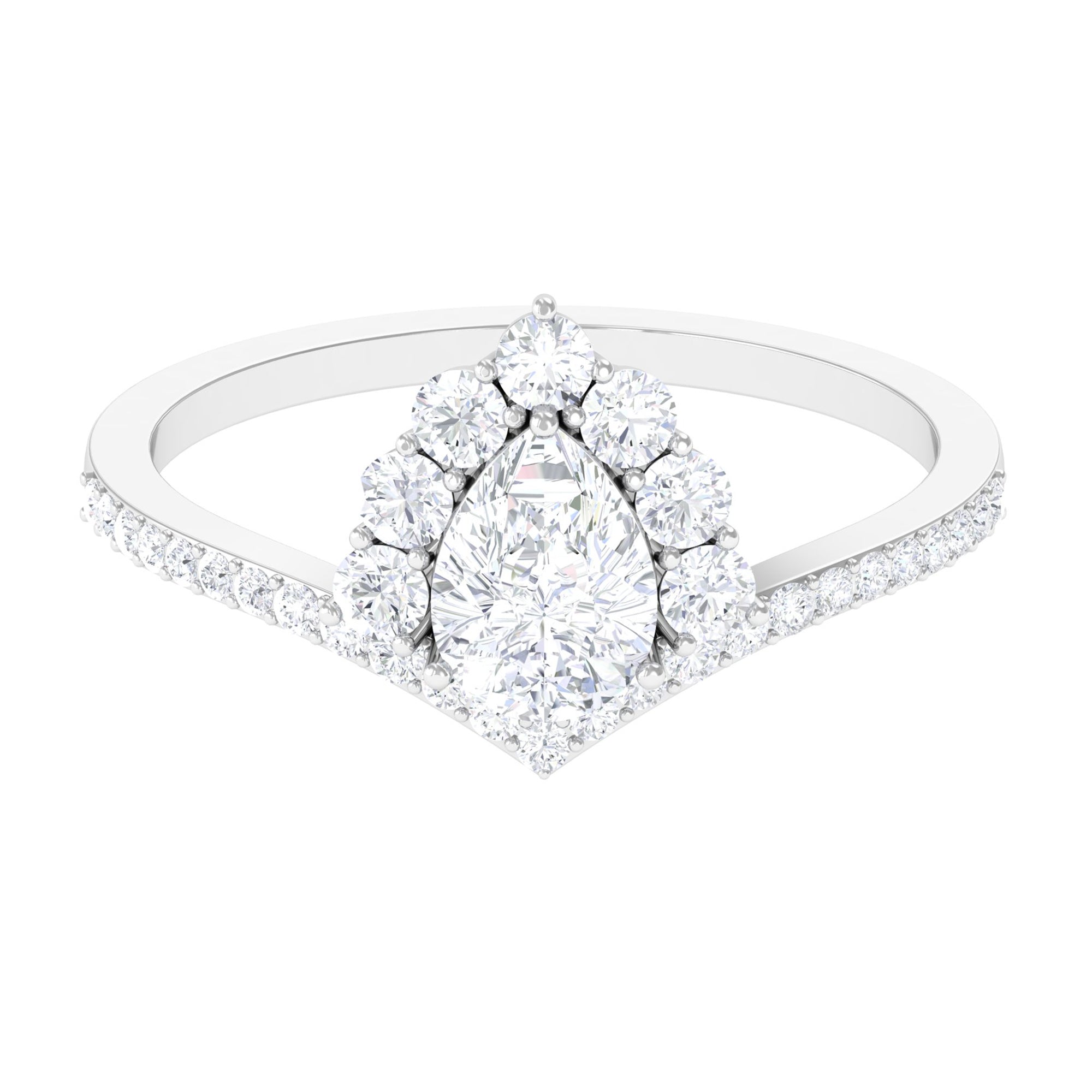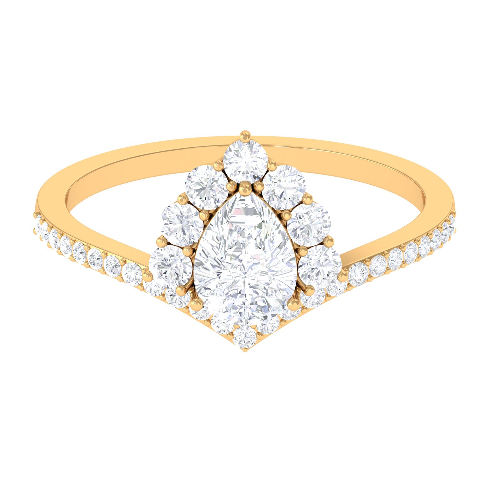 Crown Engagement Ring is embellished with Pear Cut Zircon which is placed as a main stone to captivate all the attention. Round Petite Zircon are forming beautiful halo around the main stone and also set as Side Stones to accentuate the look of this Ring. This Zircon Engagement Ring is crafted in Gold for a sumptuous charm.