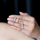 Showcase your romantic elegance with this beautiful matching set, which includes the Heart Pendant and Earrings. Crafted to capture the essence of love, these pieces are ideal for infusing a bit of sparkle and refinement into any outfit. The pendant features two round-cut and one heart-shaped zirconia, elegantly arranged in a delicate prong setting, hanging one after another, making it a perfect emblem of love and beauty. Made from luxurious 14k white gold plated silver, the pendant is attached to a matching chain that connects with a lobster clasp, ensuring both style and security. The heart zirconia dangle earrings complement the pendant with a matching design and fit comfortably on the ears with screw-back closures. Together, this Dangle Pendant and Earring Set creates a harmonious and romantic appearance, ideal for special events or as a meaningful gift. Whether worn together for a coordinated and elegant look or separately to enhance any outfit with sophistication, this Matching Earrings and Necklace Set is a stunning tribute to the timeless allure of cubic zirconia stones and the everlasting symbol of love. Presented in a signature velvet pouch, this set is destined to become a treasured part of any fine jewelry collection.