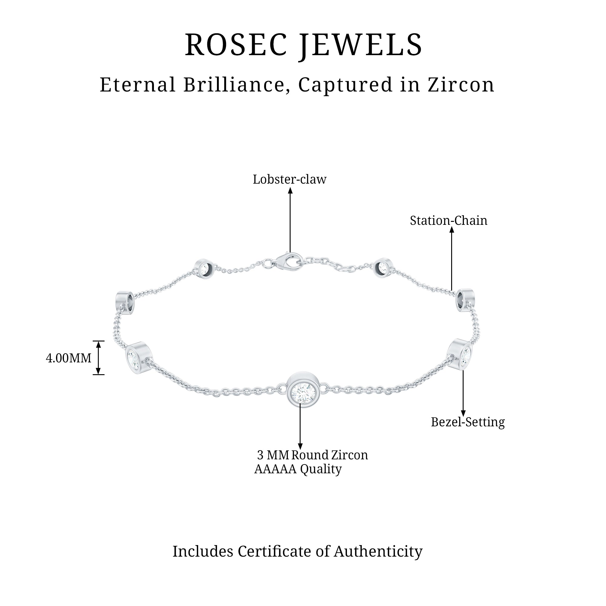 Welcome to a realm where your individuality shines through the beauty of stones. Our Cubic Zirconia Bracelet serves as a delicate tribute to your uniqueness and grace. It features 3 MM round cut cubic zirconia stones securely set in bezel setting, evenly spaced along a cable chain that radiates sophistication, casting a dance of light with every gesture. Each simulated diamond is carefully handpicked for its outstanding AAAAA quality, guaranteeing a flawless exhibition of brilliance. This remarkable Bezel Set Bracelet is handcrafted in 14k white gold plated silver, creating a timeless heirloom jewelry piece. Designed to complement all wrist sizes, it is ideal for both professional gatherings and outings with friends. This Silver Chain Bracelet will become your essential accessory for any event. Embrace elegance and sophistication with this Minimalist Stackable Bracelet, a classic item that transcends fleeting trends.