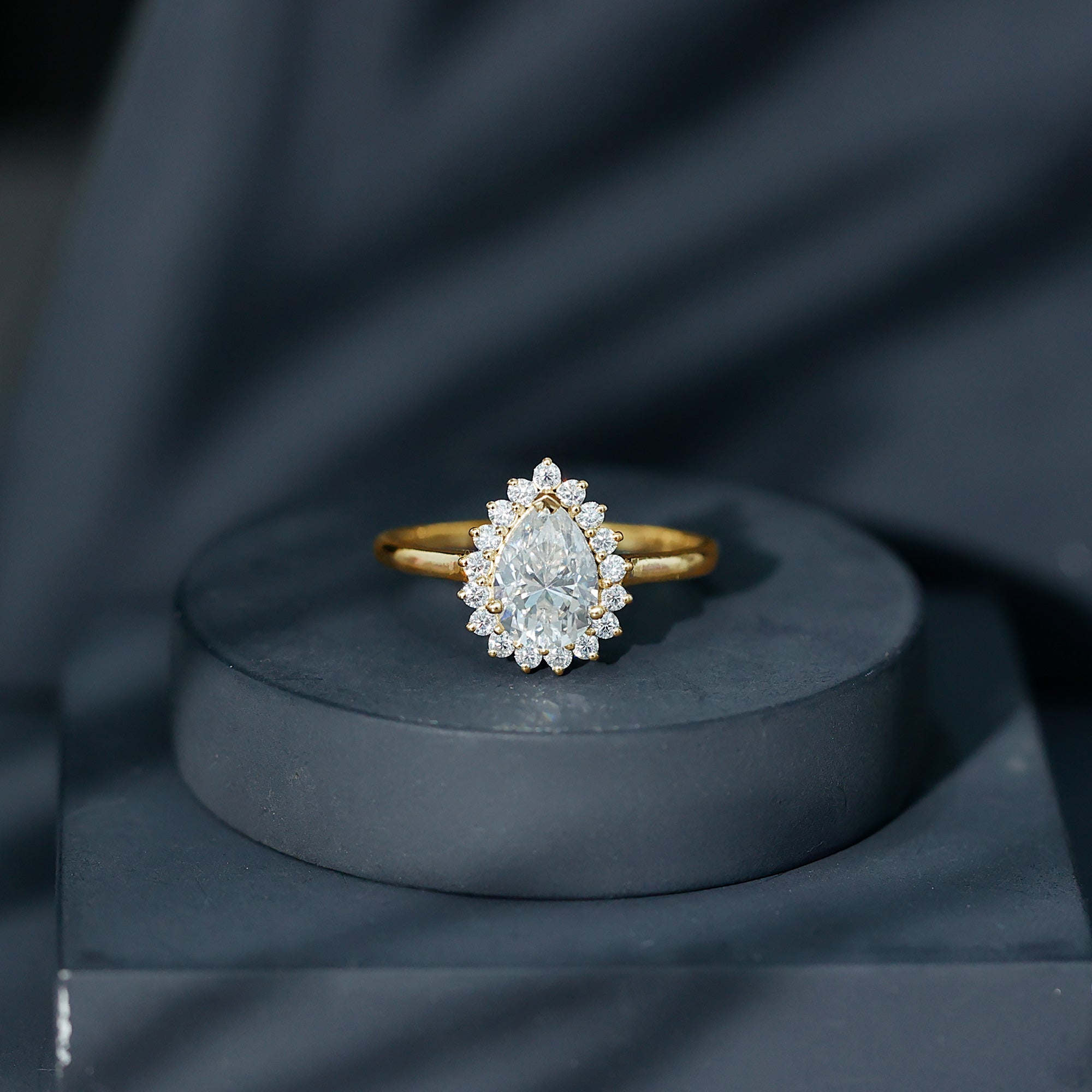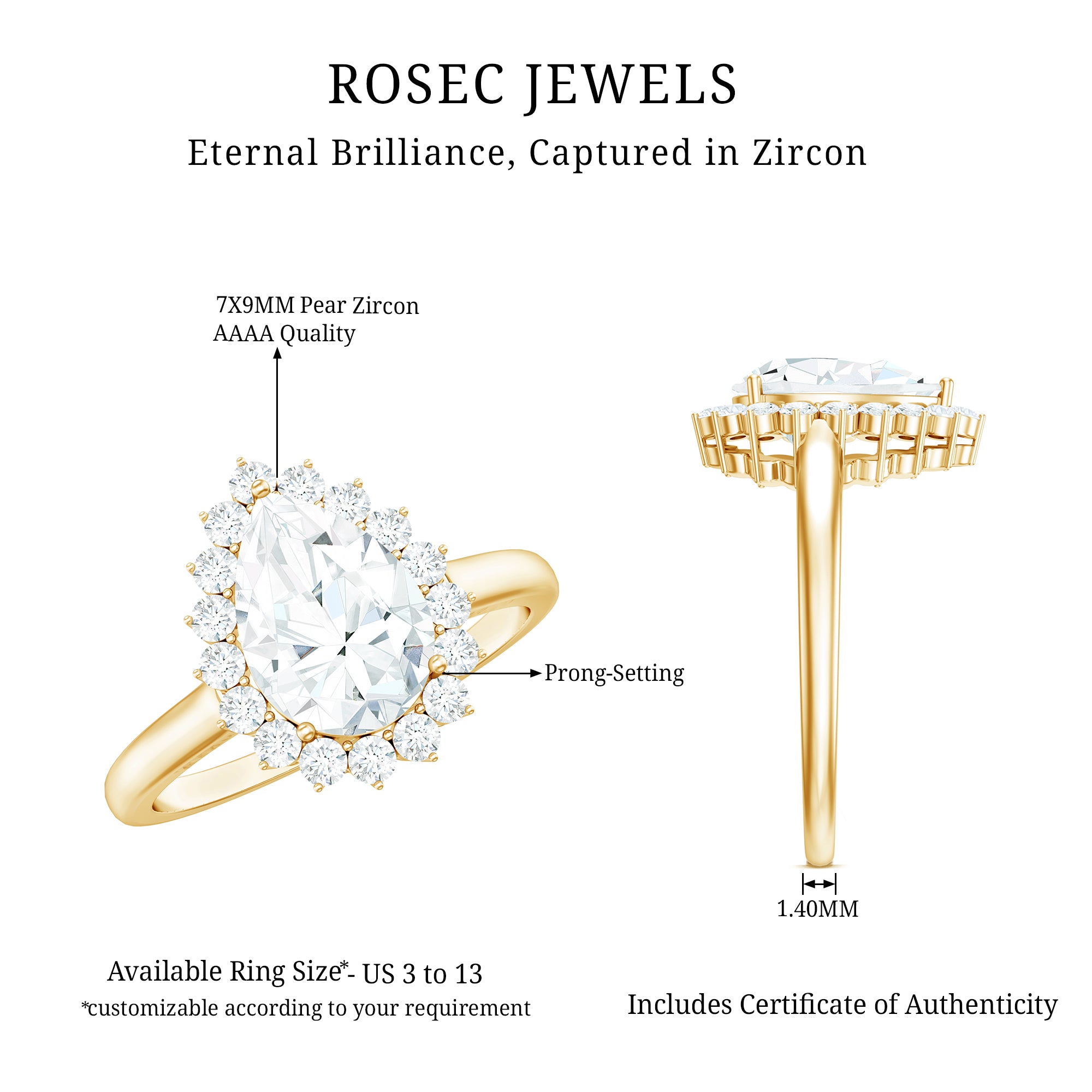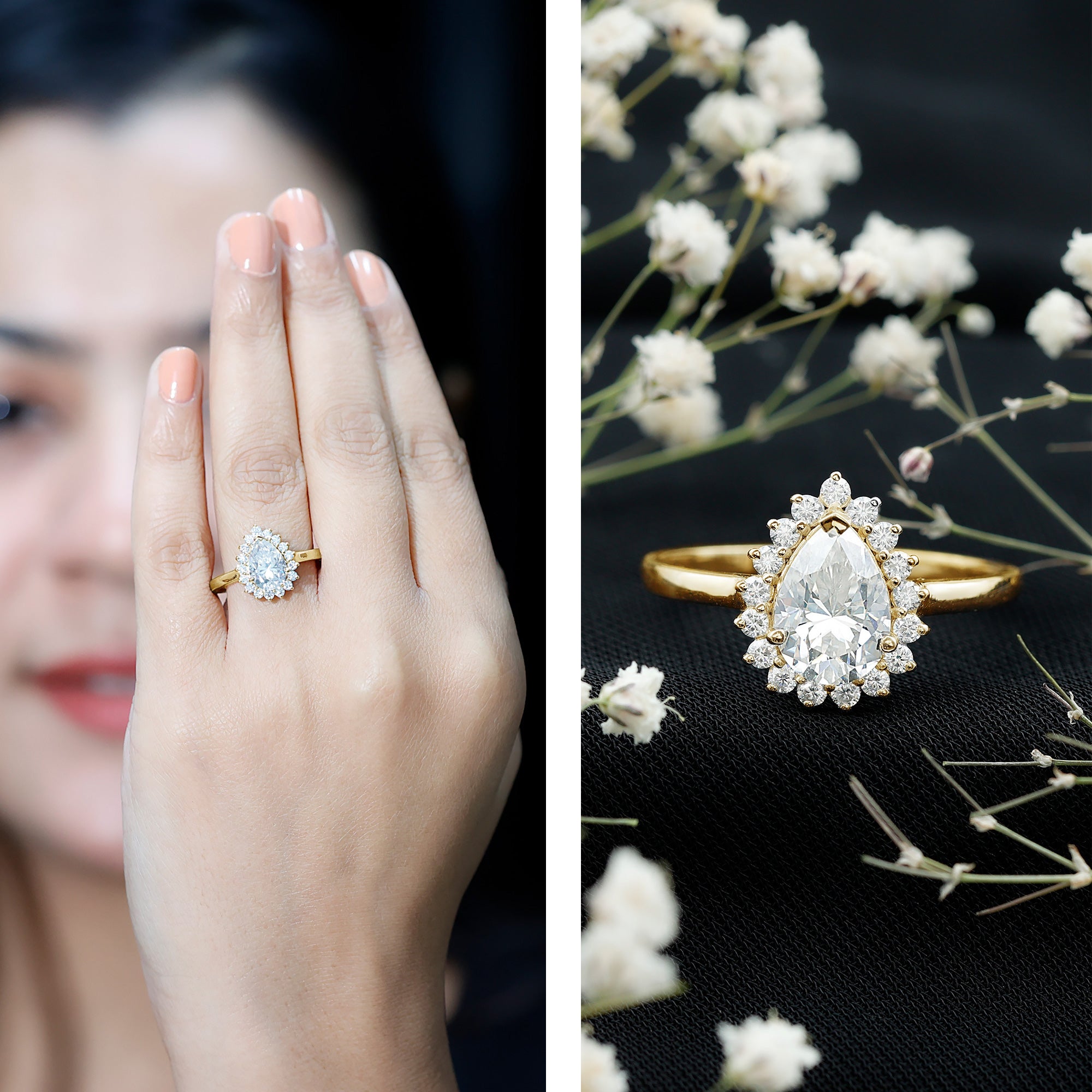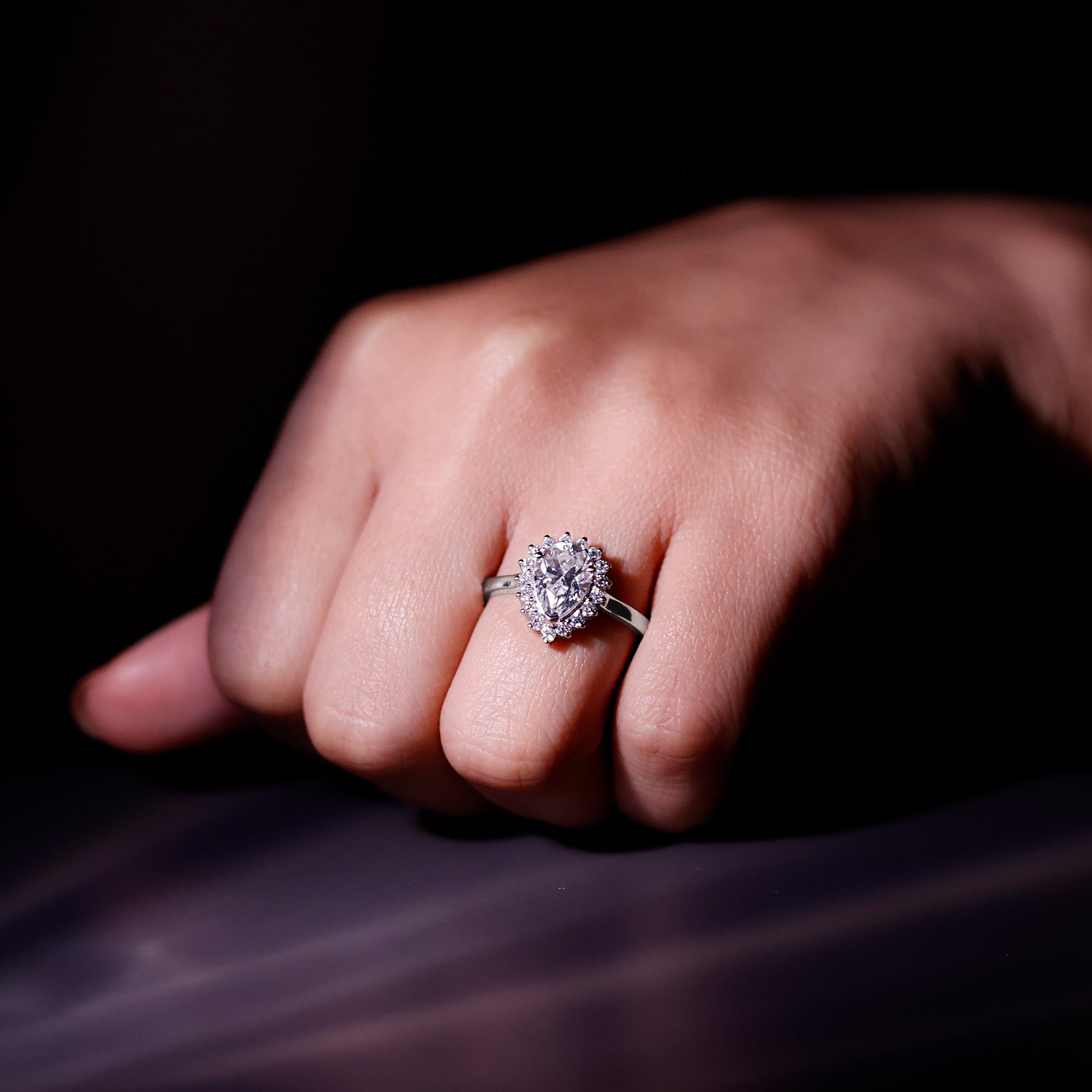 This stunning Engagement Ring for Women showcases a mesmerizing combination of a pear cut and round cut zircon stones in a halo setting. It is the perfect choice for expressing your love and devotion to your significant other. Dont miss the opportunity to make her feel truly happy by gifting her this exquisite ring.