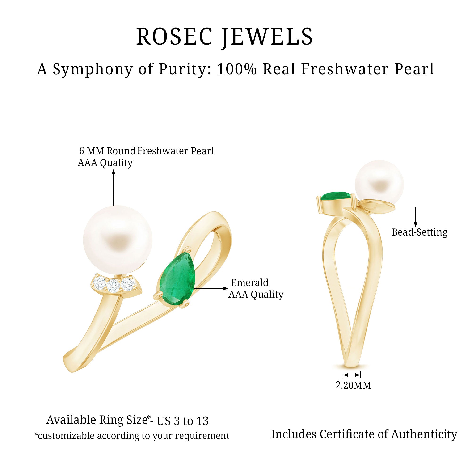 Whispered promises and timeless elegance come together in this exquisite Toi Et Moi Ring, where a luminous 6 mm Freshwater Pearl meets a vibrant 3X5 mm Pear Shaped Emerald in a delicate dance of love. Tiny, sparkling Moissanite stones flank the Pearl, adding just the right hint of shimmer to catch every ray of light and every stolen glance. Designed to wrap gently around the finger, this Pearl Promise Ring embodies connection, making it the perfect symbol of a bond that is uniquely yours. Each glance at this delicate Pearl Emerald Ring evokes romance, devotion and the kind of beauty that never fades. Whether gifted as a promise, an engagement or a meaningful token of affection, this Wrap Ring tells a story of shared dreams and endless devotion. The combination of soft Pearl, vibrant Emerald, and sparkling Moissanite captures the essence of a love that is both gentle and extraordinary. Let this Proposal Ring be the sparkling token to your story of love, a piece as radiant as your feelings.