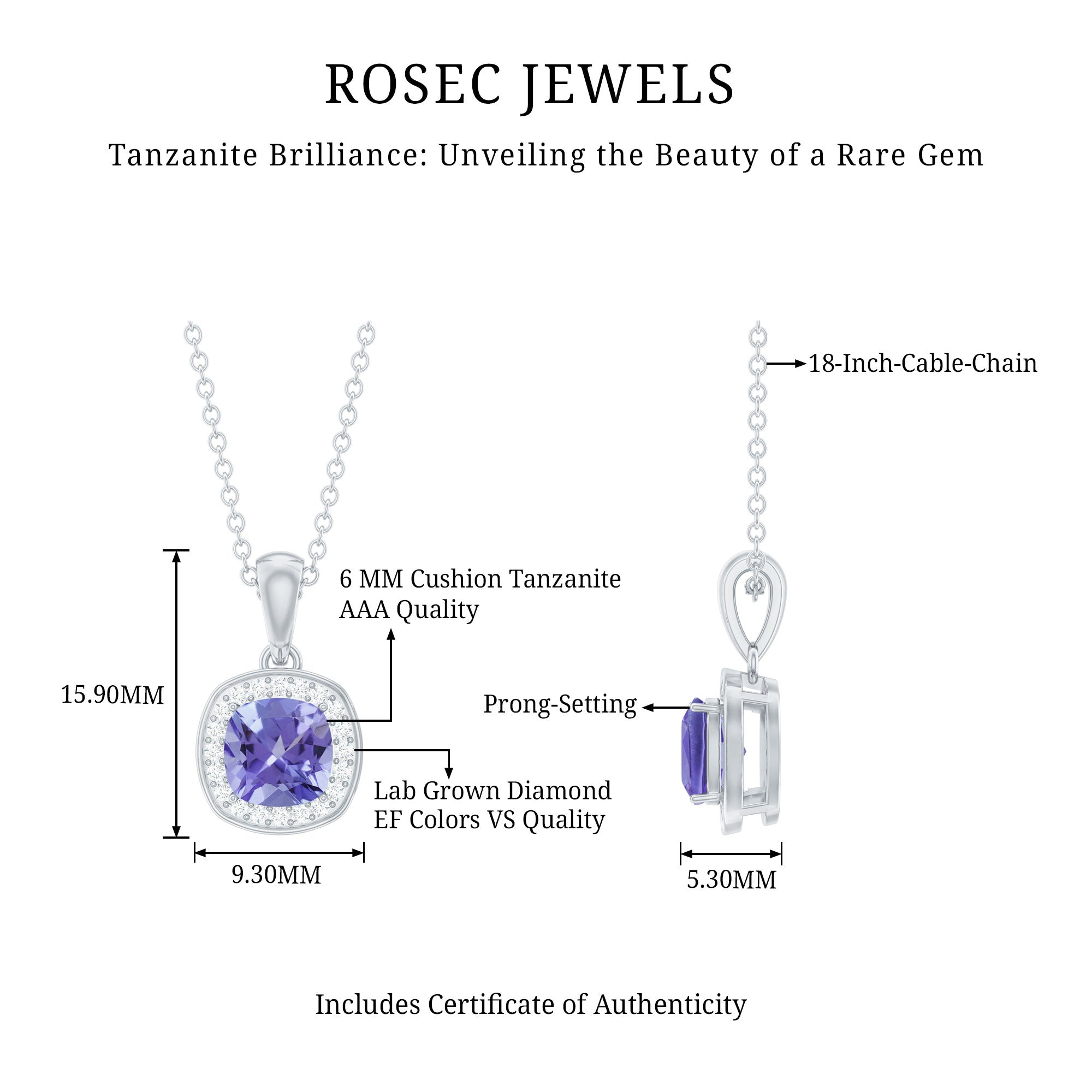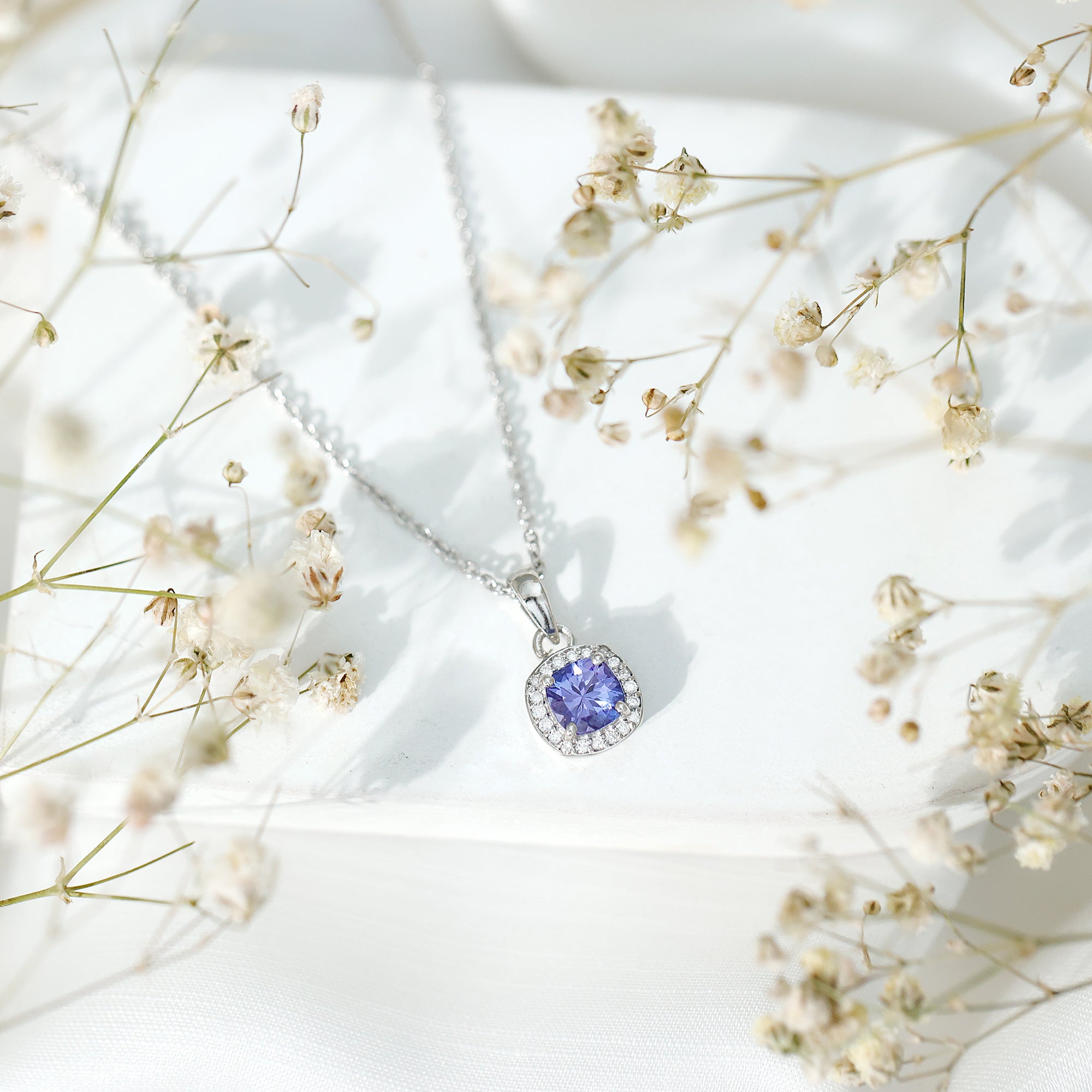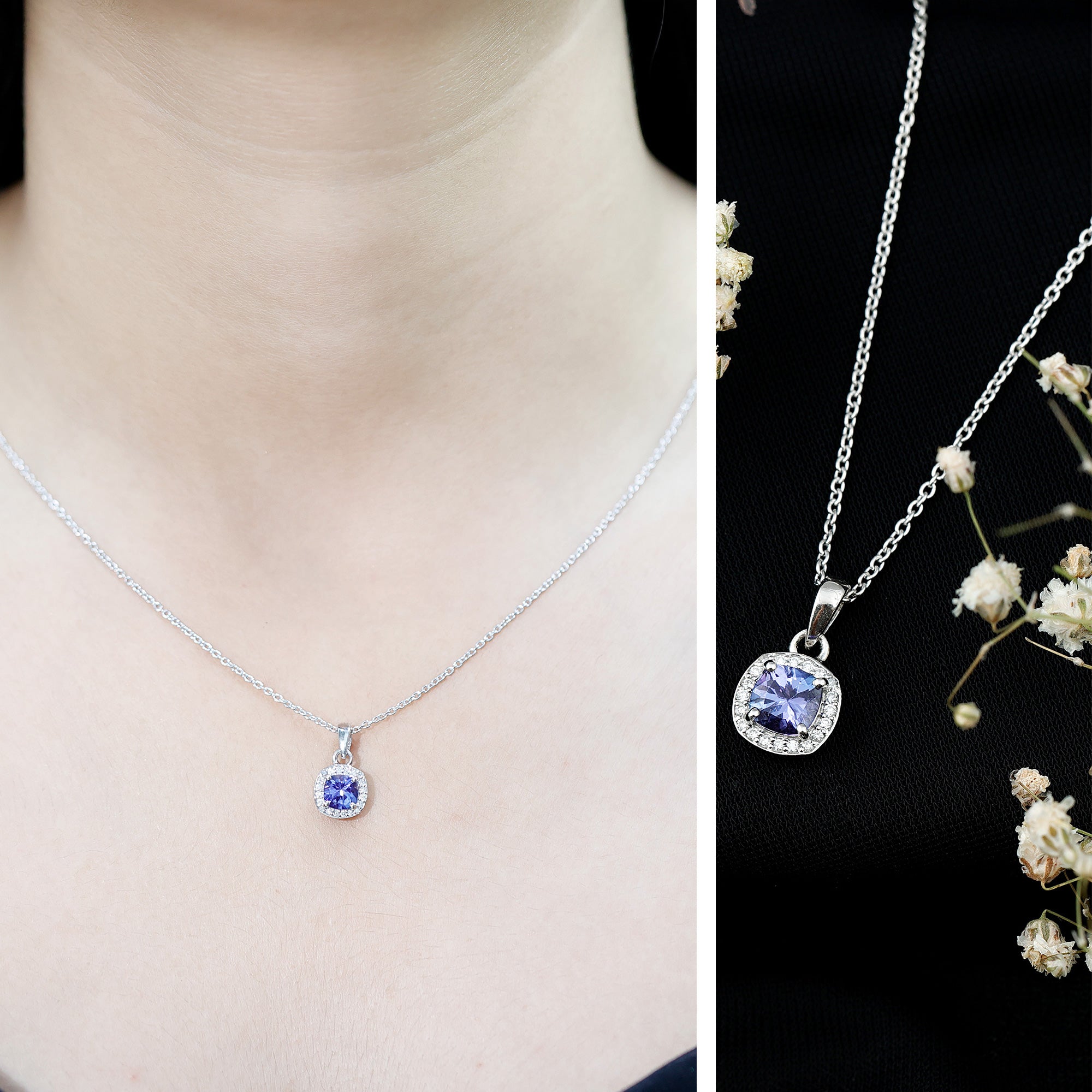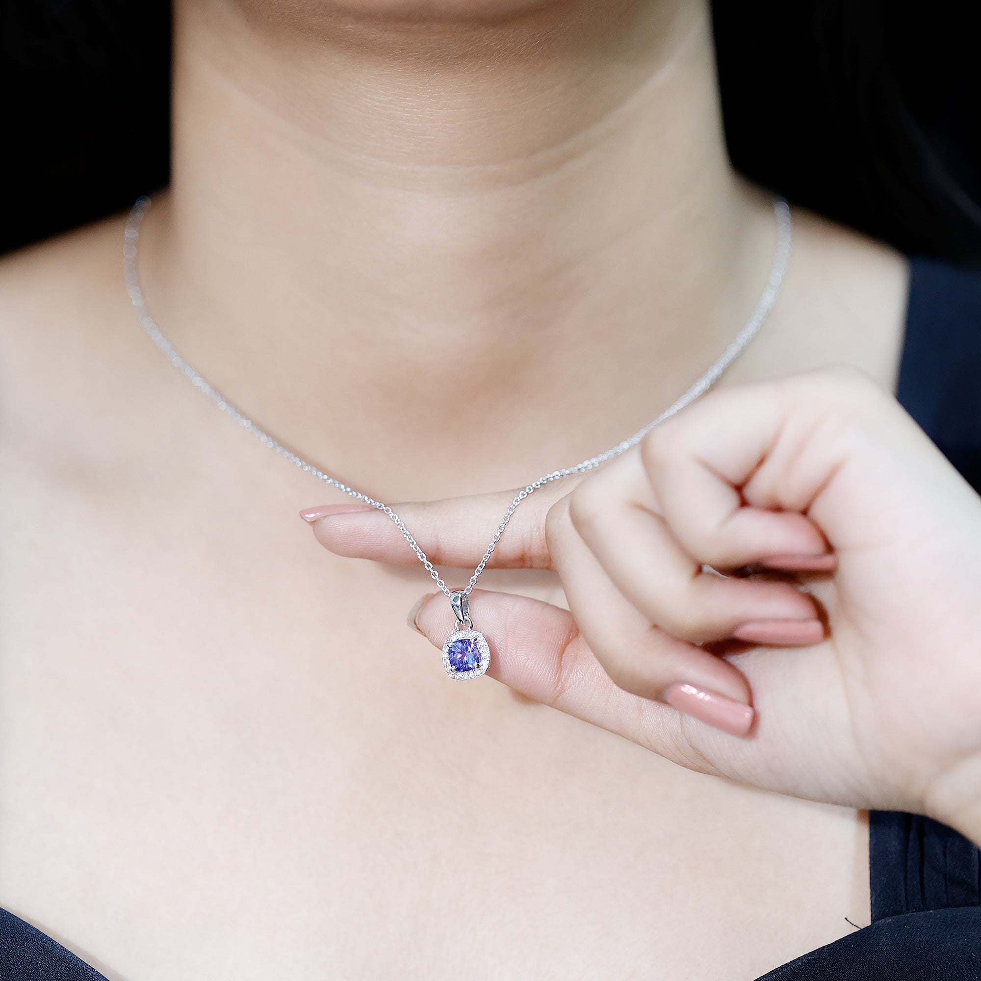 Understated yet captivating, this Tanzanite Pendant Necklace blends timeless elegance with modern charm. Expertly crafted from white gold plated silver, this refined piece showcases a luminous 6 MM cushion cut Tanzanite, held securely in prong setting. The rich blue hue of the Tanzanite is beautifully complemented by a halo of round brilliant cut lab grown diamonds, creating a dazzling frame that enhances the stone’s depth and brilliance. With its AAA quality Tanzanite and EF-VS quality lab grown diamonds, this Cushion Cut Necklace offers both exceptional quality and thoughtful design. Dangling from a delicate chain, the Halo Necklace moves gracefully with you, making it the perfect accessory whether you are dressing for the office, a dinner date, or a special celebration. Tanzanite is also the birthstone of December, is treasured for its rarity and unique color. Symbolizing wisdom, transformation, and clarity, it is an especially meaningful gift for those born in December. This Tanzanite and Diamond Necklace is not just a piece of jewelry, it is a story waiting to be told. Whether worn daily for a touch of sophistication or saved for moments that call for extra sparkle, its elegance speaks volumes. A beautiful blend of simplicity and sparkle, this December Birthstone Necklace is a versatile treasure, perfect for birthdays, anniversaries, holidays, or simply celebrating your unique style.