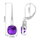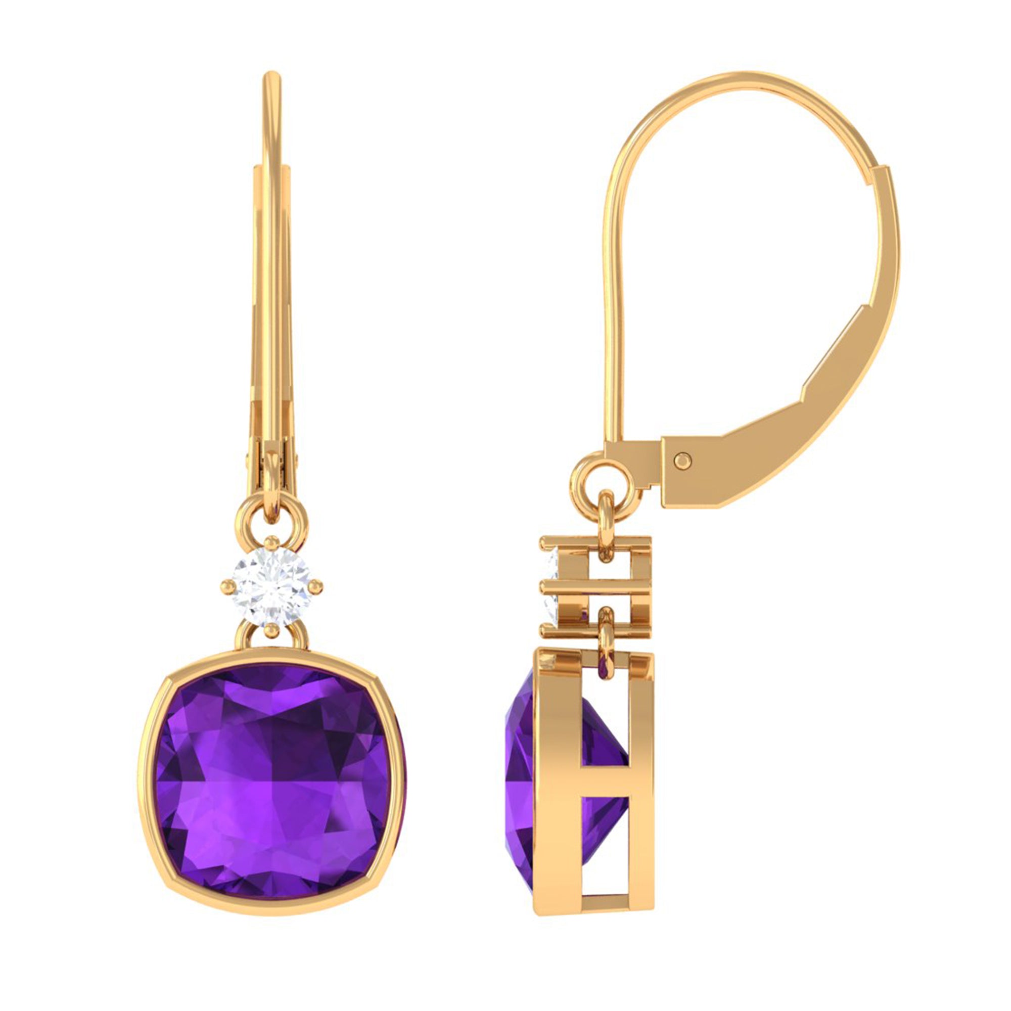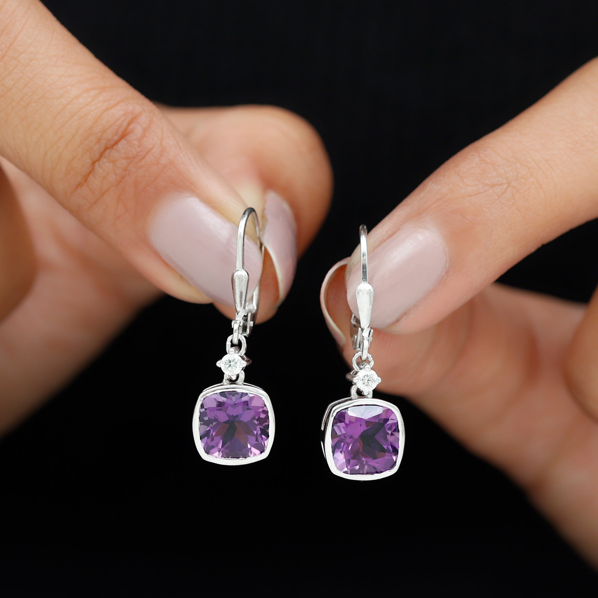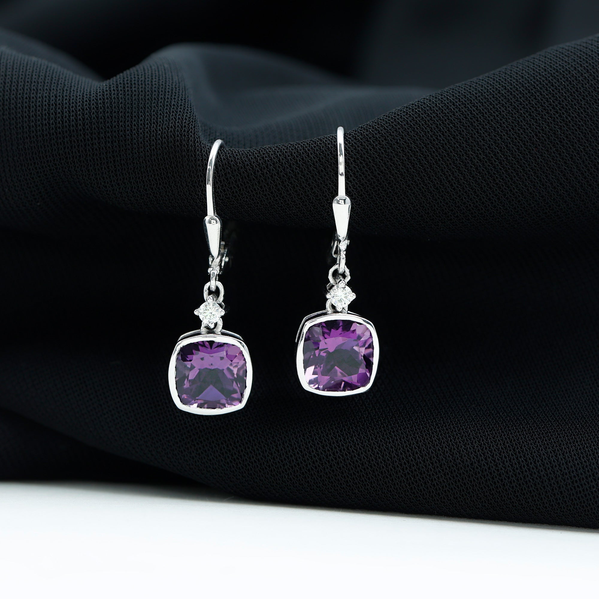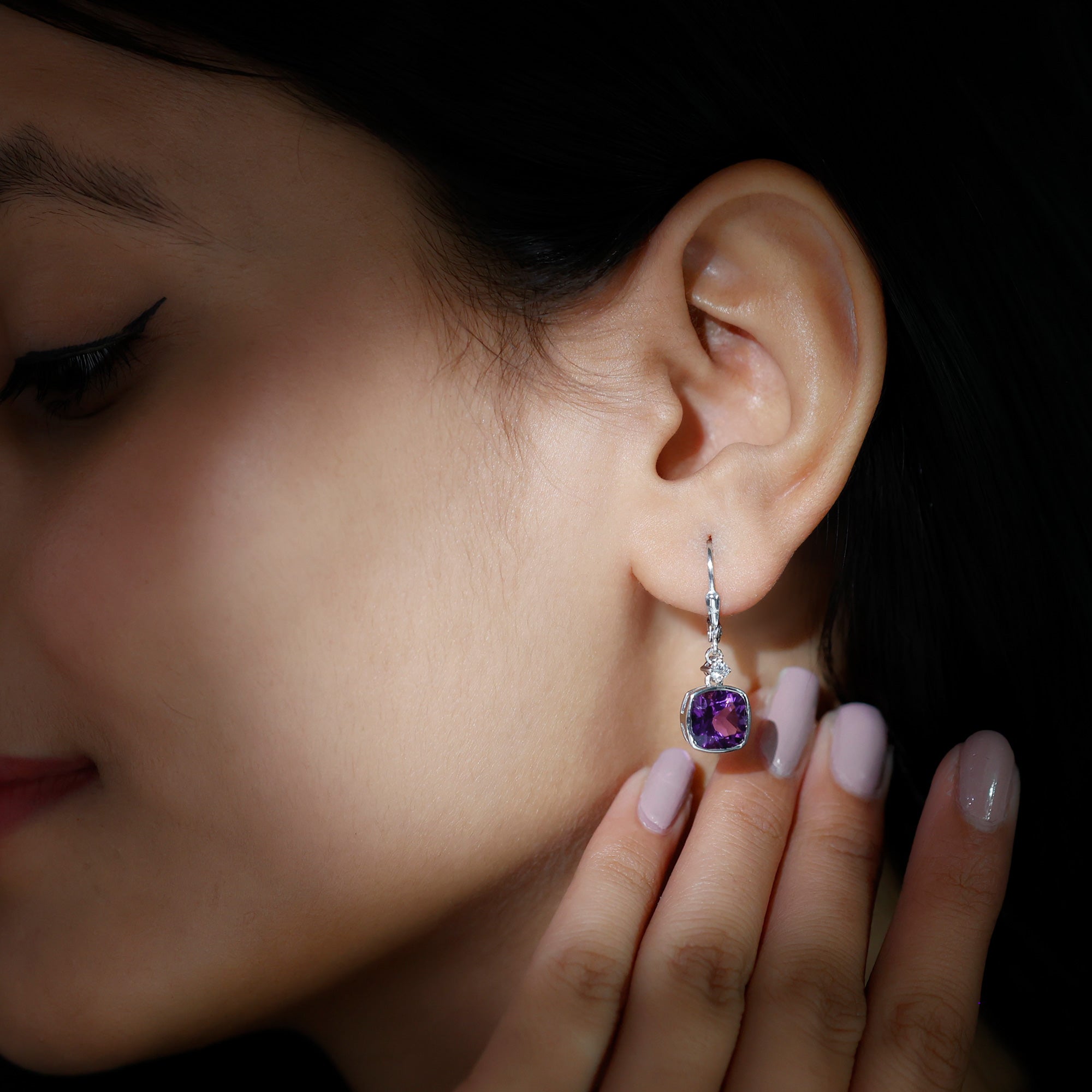 Indulge in the allure of these captivating Drop Earrings. Adorned with Cushion Cut Amethyst gems securely nestled in Bezel Settings, and Round Shape Diamond gems in Prong Settings, these Amethyst Earrings are available in various metal options. The Lever Back Closure ensures they stay in place, providing both style and security.