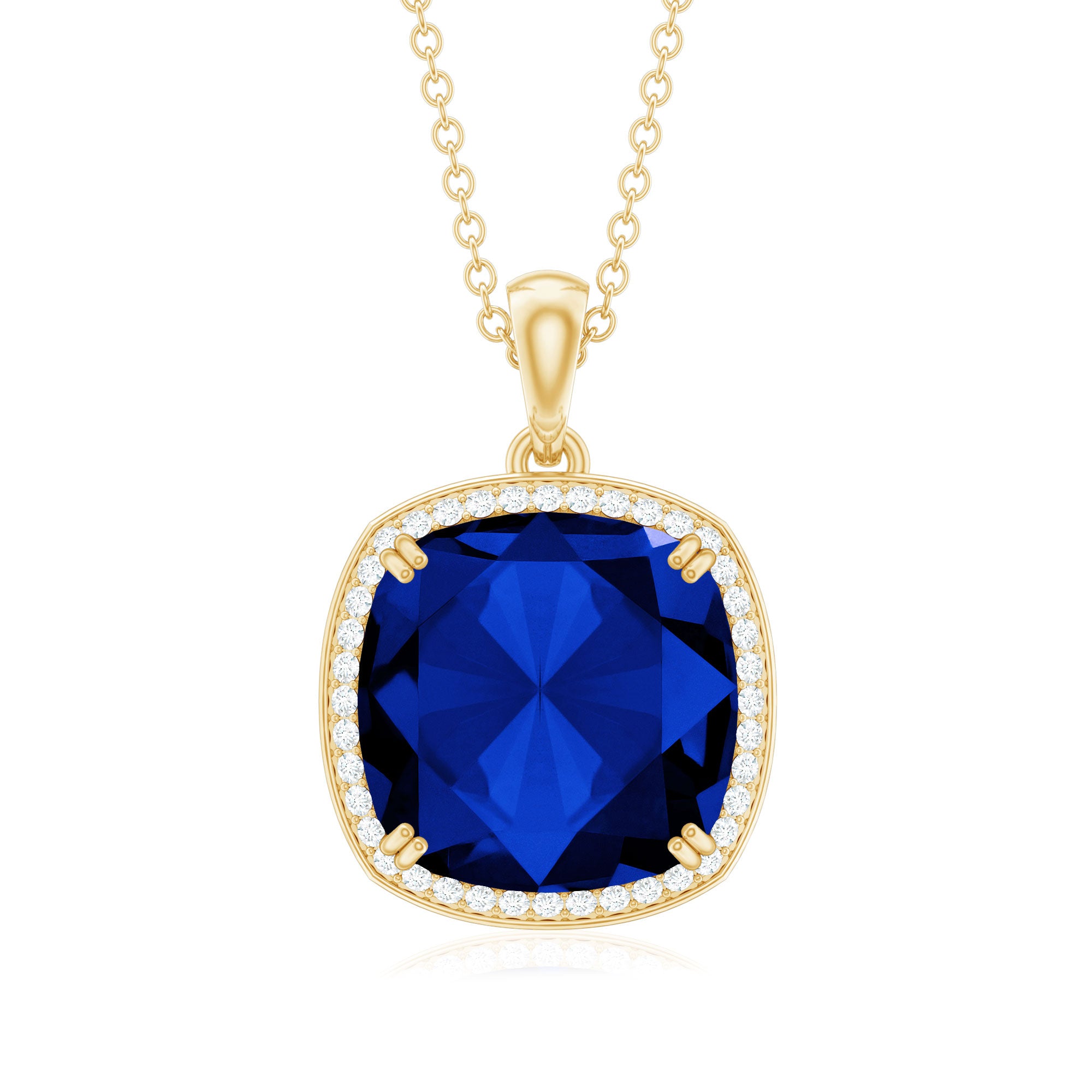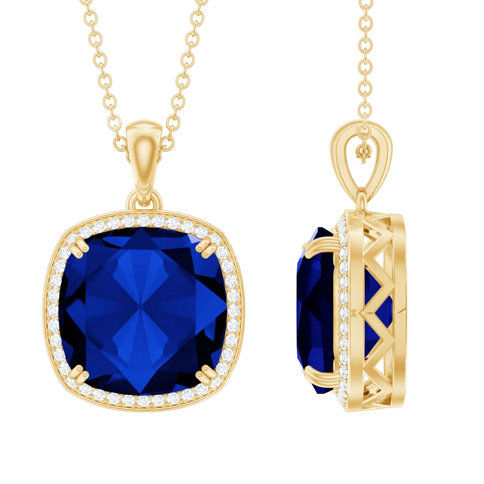 You will definitely steal the spotlight by wearing our Halo Pendant Necklace embellished with Cushion Cut Lab Created Blue Sapphire secured in 4 Prong Setting while dainty Round Diamond studded as Halo. This Created Blue Sapphire Pendant is crafted with Solid Metal. Our Pendant Necklace makes a beautiful present for your beloved wife.