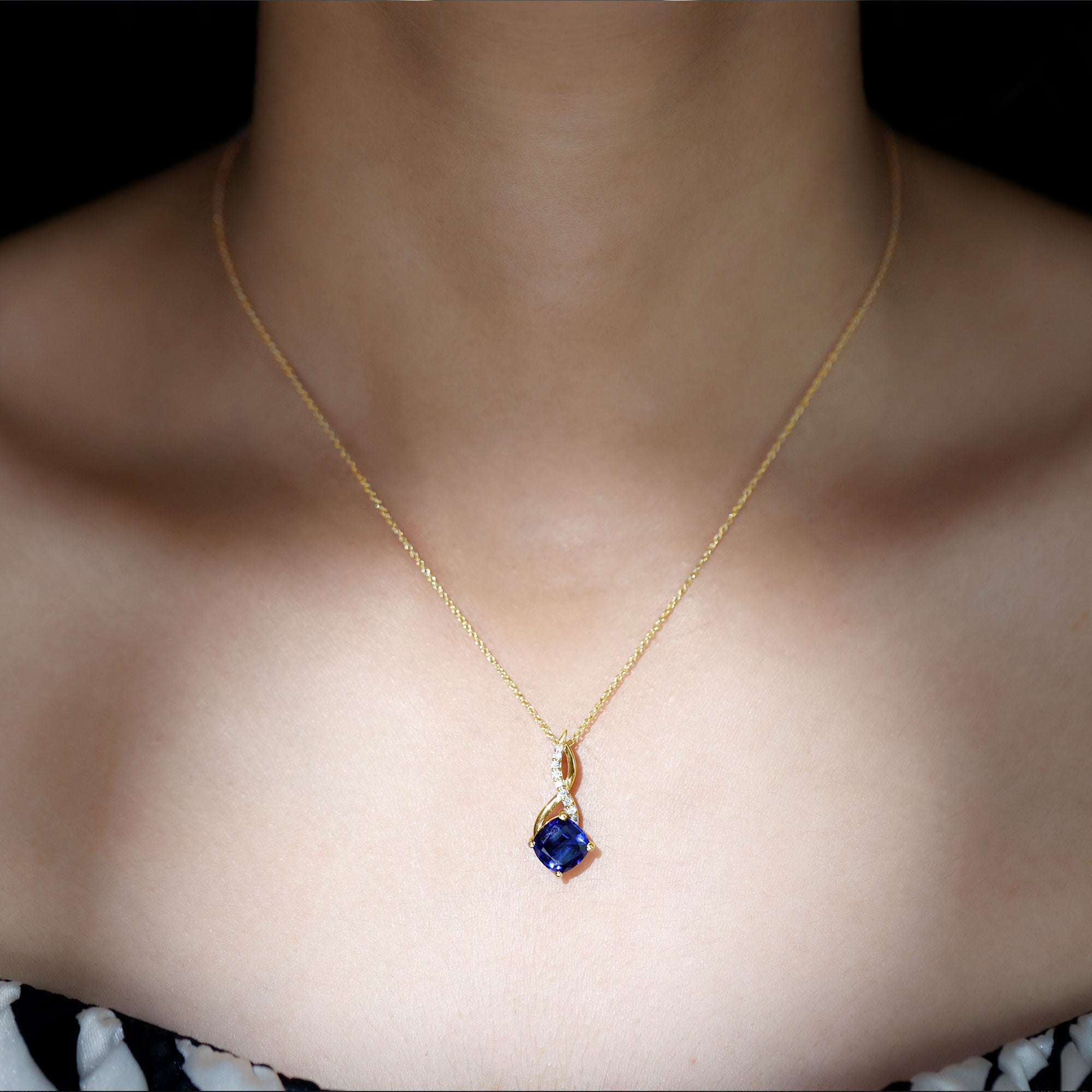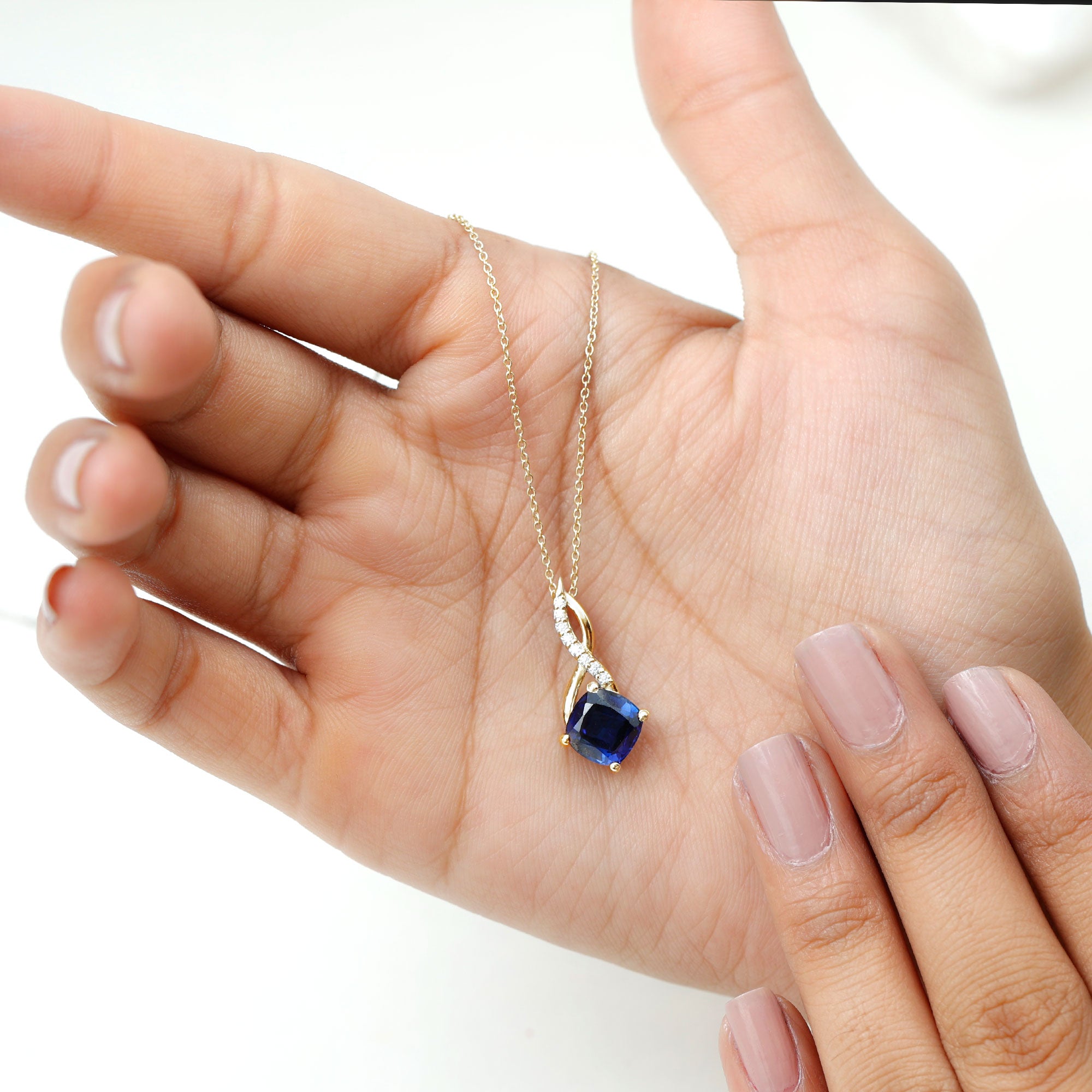Create a memorable moment with this Lovely Infinity Pendant, designed to captivate the heart of any woman. Made with Gold Metal, this Cushion Infinity Necklace features a stunning Cushion Cut Created Blue Sapphire in a Prong Setting, adorned with Round Brilliant Moissanite in a Pave Setting. This beautifully crafted Created Blue Sapphire Pendant Necklace makes an excellent choice for the special lady in your life, sure to make her heart melt with joy.