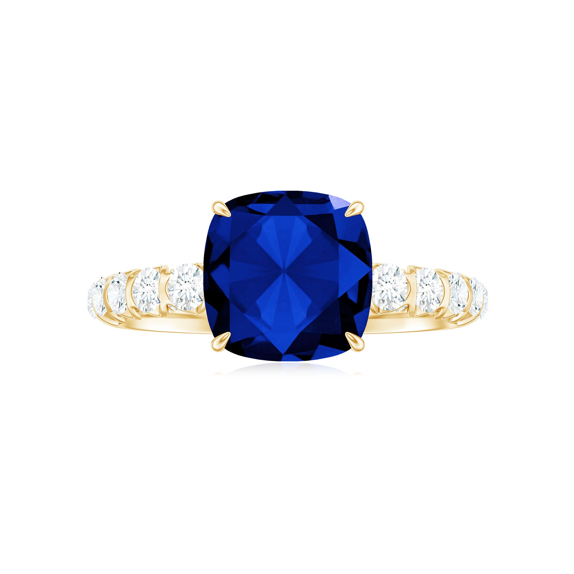 Cushion Cut Created Blue Sapphire Solitaire Ring with Diamond Side Stone