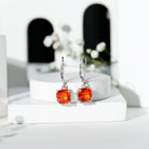 Enhance your style with stunning Drop Earrings featuring cushion-cut created orange sapphire and lever back for a perfect combination. Effortlessly infuse glamour into any outfit, making a vibrant statement that turns heads and garners compliments.
