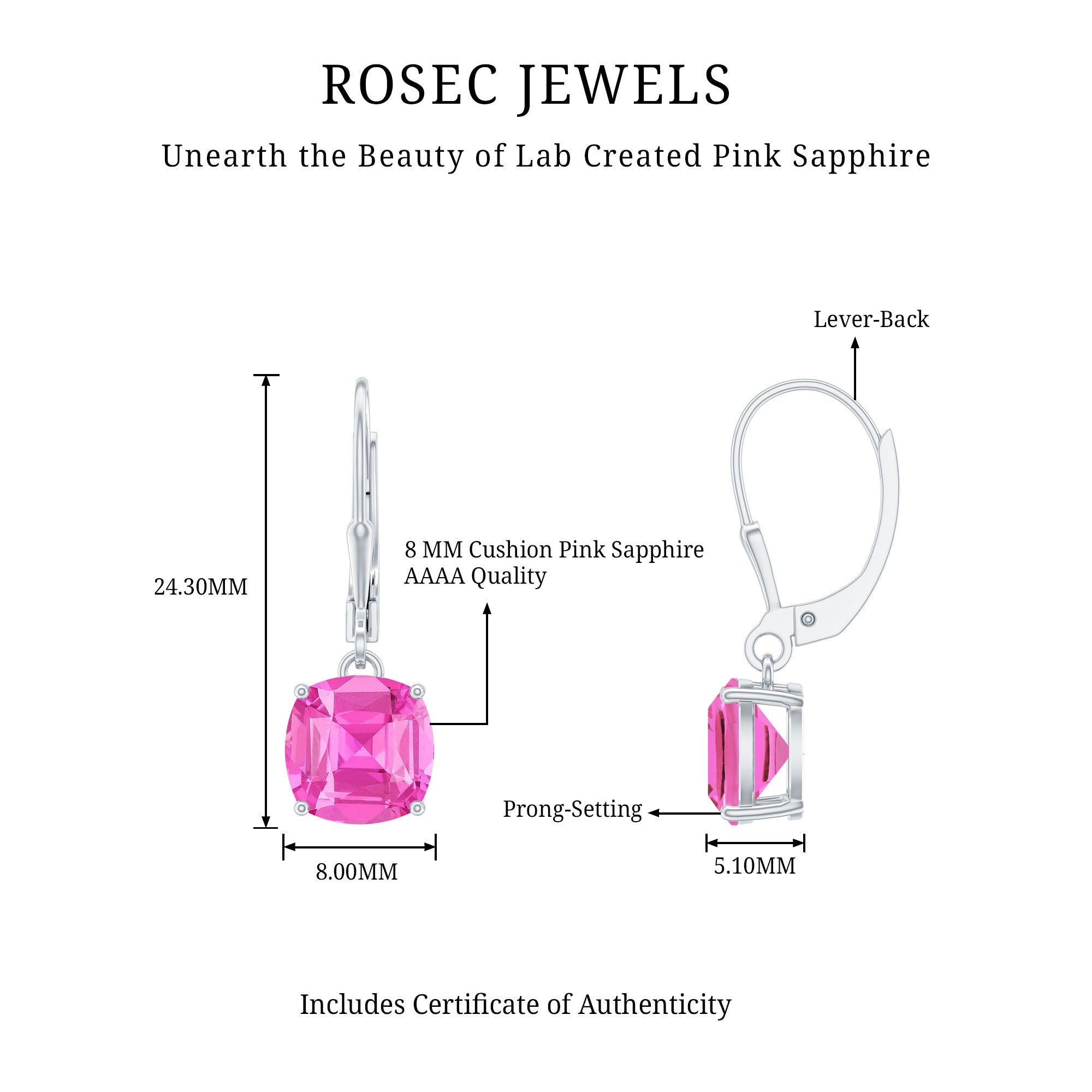 Meticulously designed, these Lab Grown Pink Sapphire Earrings are sure to attract attention and admiration. The deep pink color of each 8 MM Cushion Cut Lab Created Pink Sapphire shines with passion and strength, serving as a timeless emblem of love, power, and confidence. With AAAA Quality, these Pink Sapphire Drop Earrings radiate warmth and brilliance, enhancing any outfit. Hanging from a stylish Lever Back Closure, the Lab Created Pink Sapphire set in a 4 Prong Setting moves elegantly with you, adding a touch of drama and sophistication. Ideal for evening elegance or a bold daytime look, these Pink Sapphire Hoop Earrings are both versatile and memorable. Whether you are dressing up for a special event or giving a heartfelt gift, they offer classic beauty with a contemporary flair. Presented in a lovely signature jewelry box, these Cushion Cut Earrings are ready to impress. Perfect for birthdays, anniversaries, romantic gestures, or simply to treat yourself to something beautiful. These Sapphire Solitaire Earrings are a striking representation of style, confidence, and enduring love.