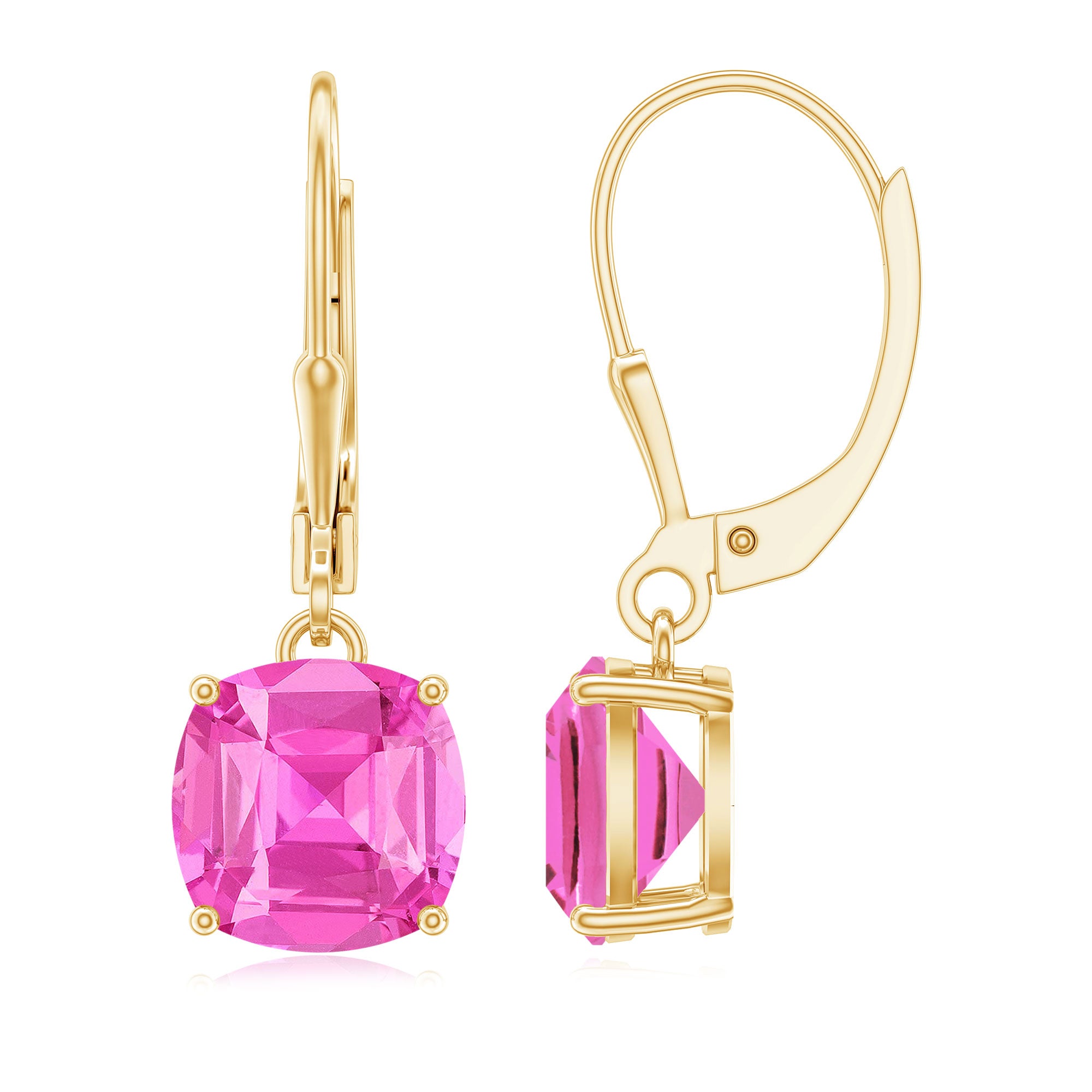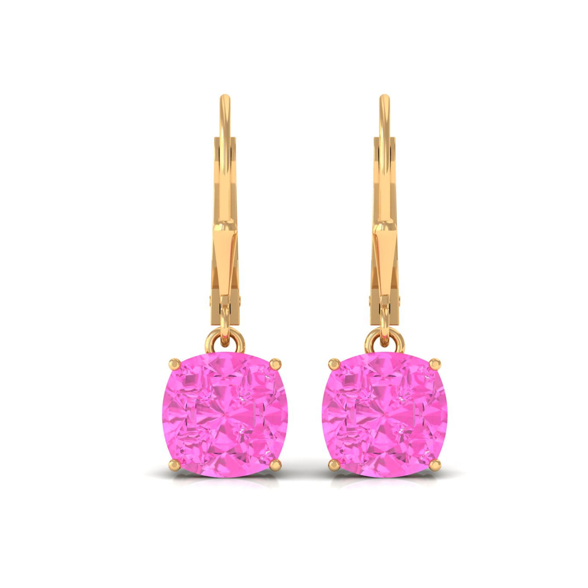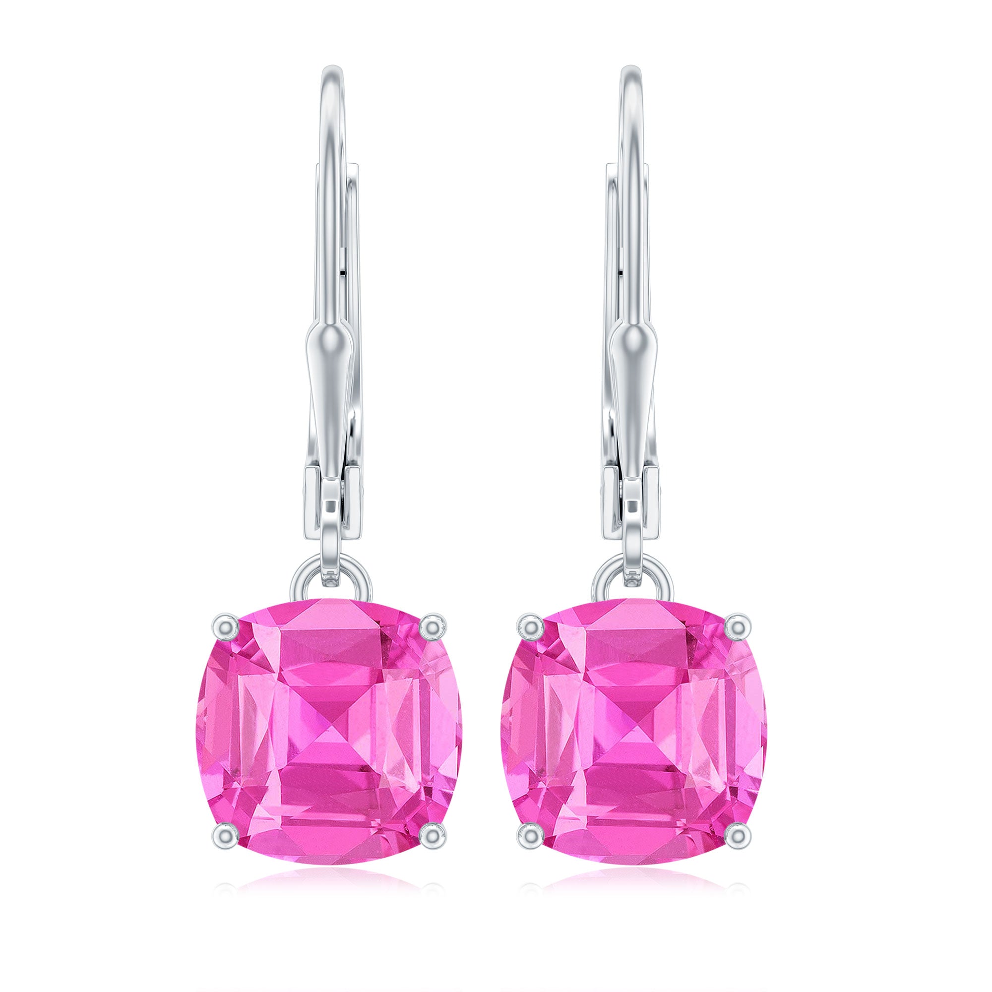 Cushion Cut Lab Created Pink Sapphire Solitaire Drop Earrings with Leverback