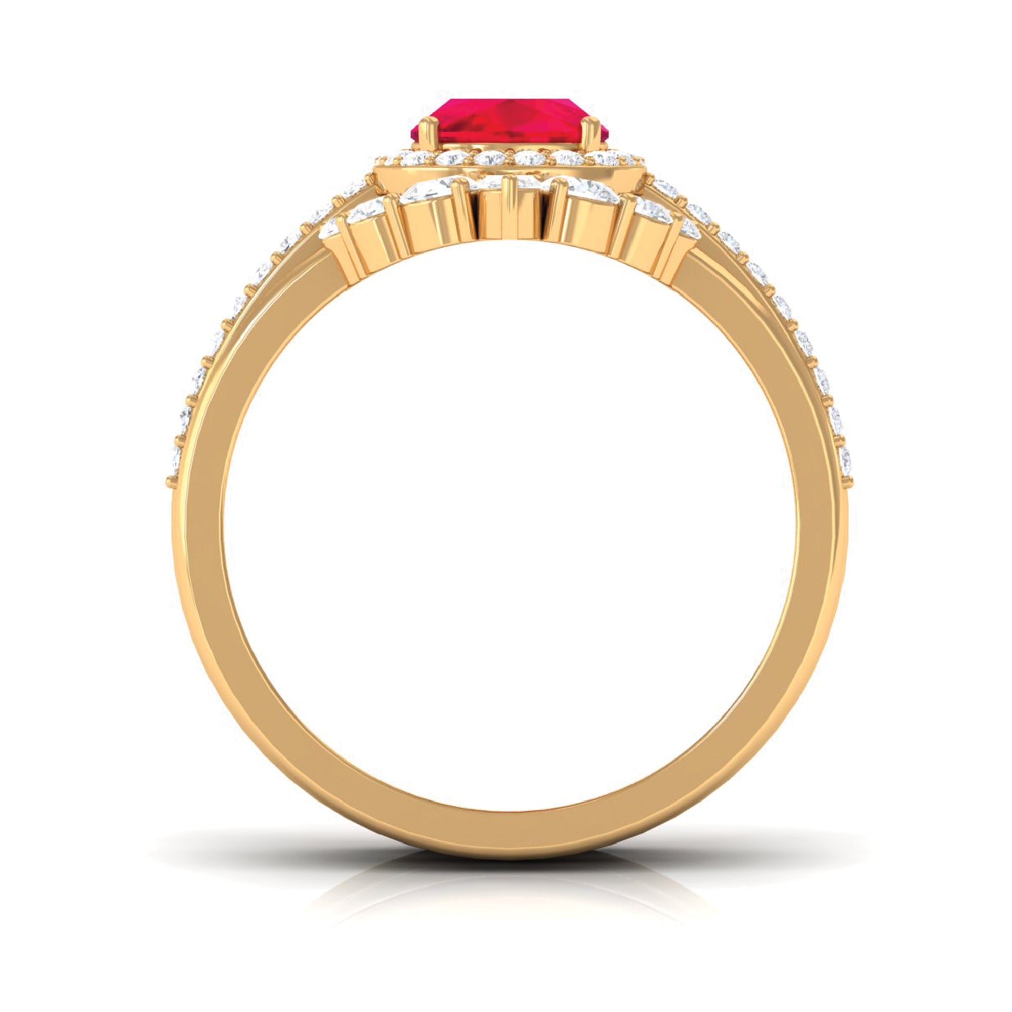 Celebrate loves richness with this Wedding Ring Set of 3 featuring a Cushion Shape Lab Created Ruby gemstone set in Prong Setting with Sparkling Moissanite gemstones. Two Moissanite Enhancer Rings are used to increase the brilliance of the Ring Set. A captivating choice to cherish forever.