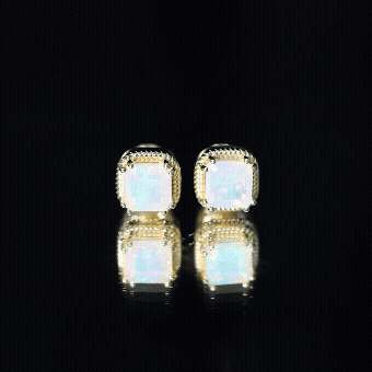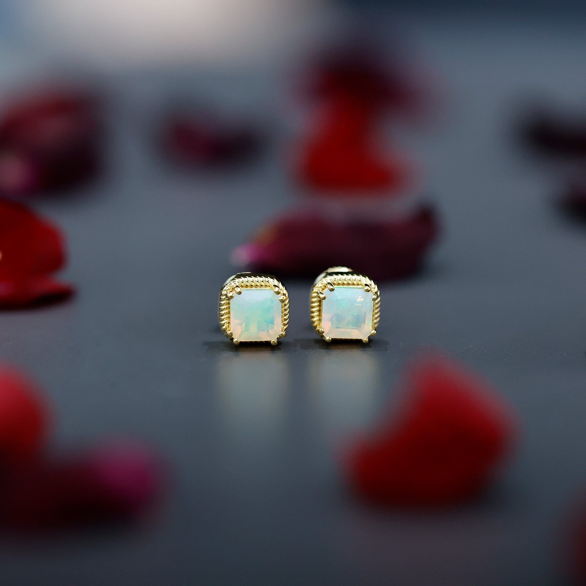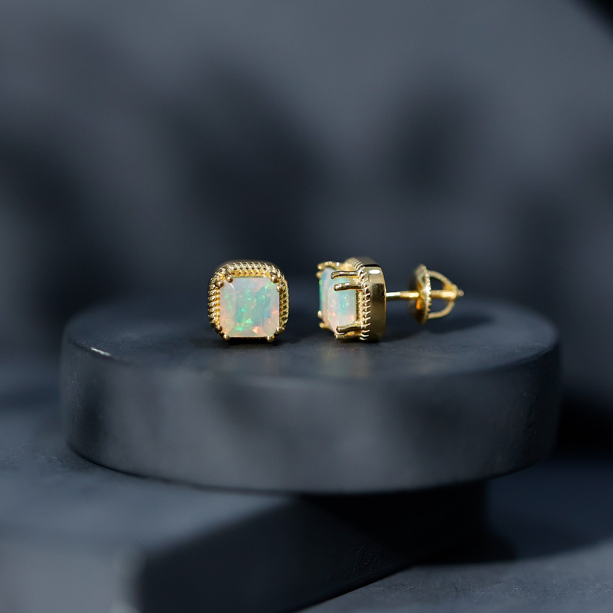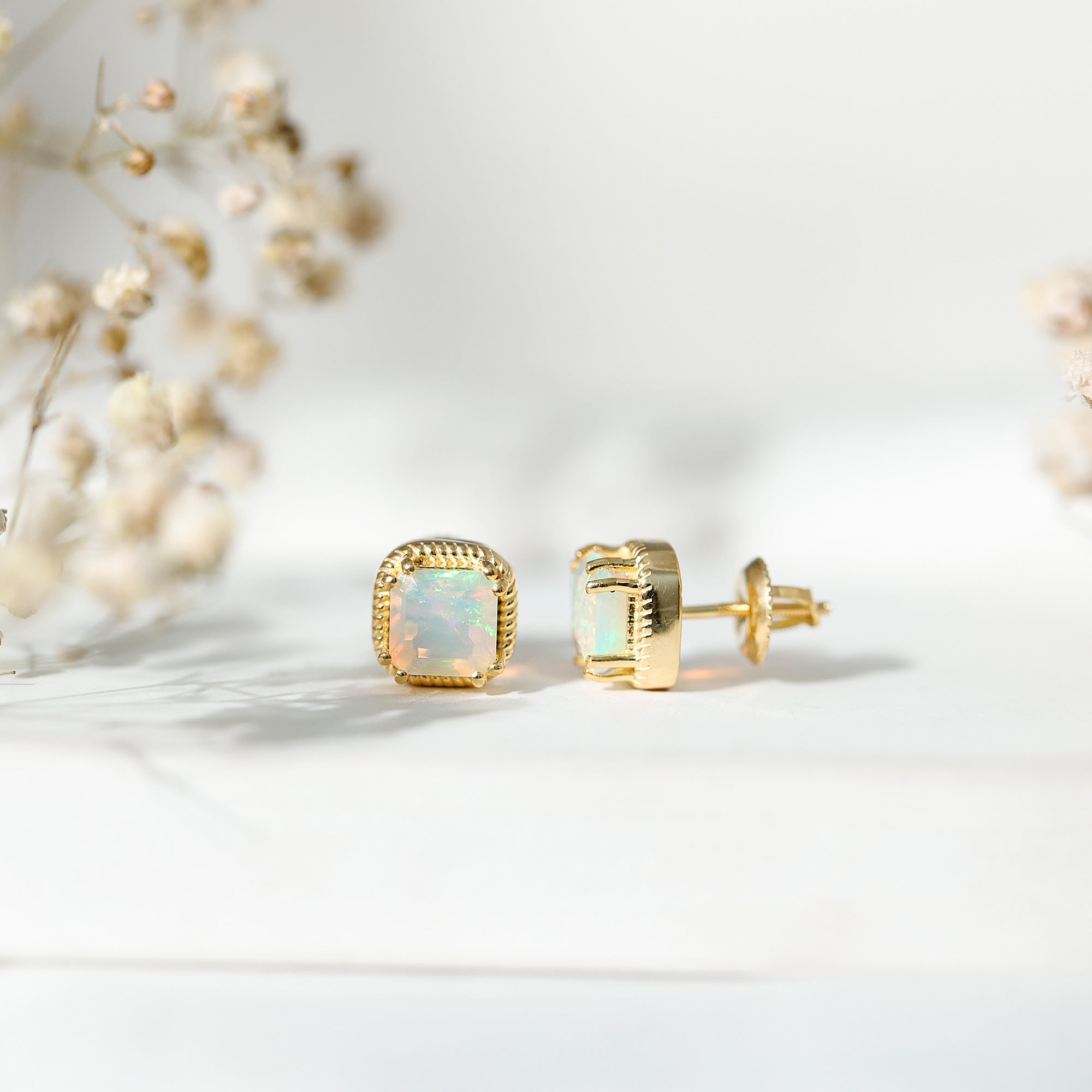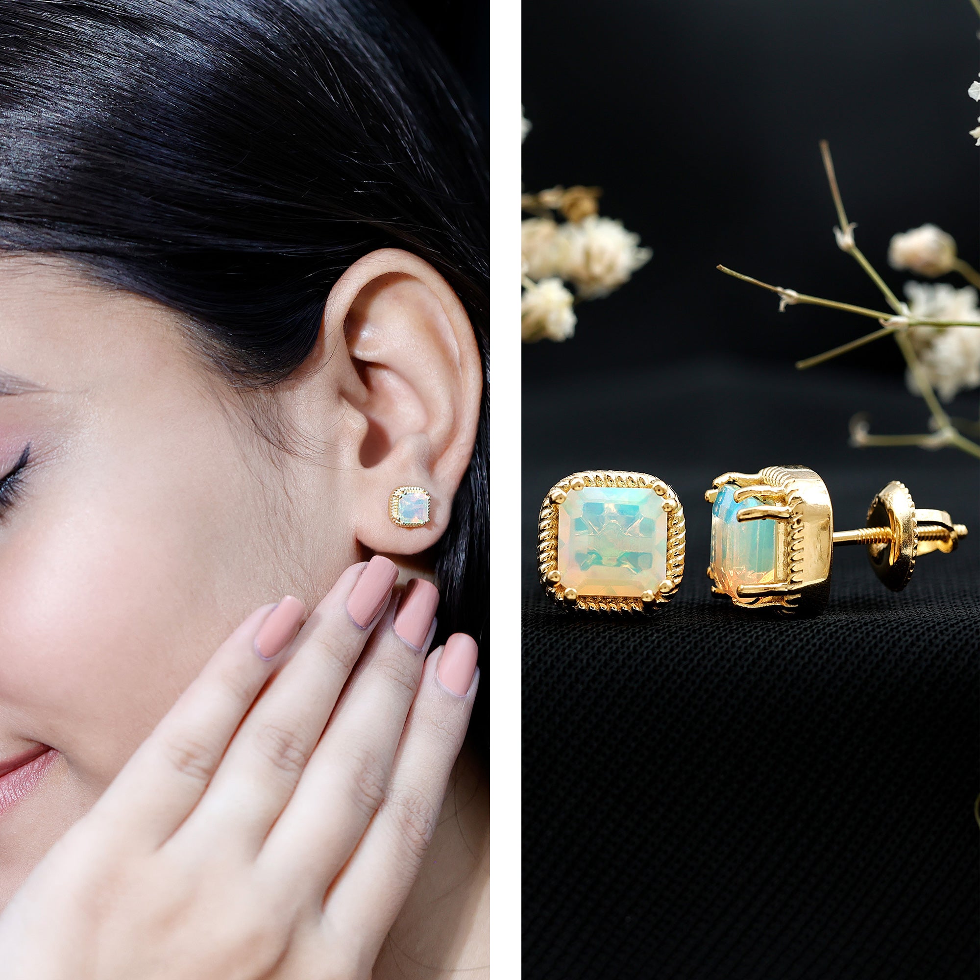 Turn heads with the vibrant beauty of these striking Ethiopian Opal Stud Earrings - a statement of sophistication and bold elegance. Each earring showcases a mesmerizing 6 MM cushion cut Ethiopian opal, totaling an impressive 6 CT (3 Carat Stud each) of ethereal brilliance. Set securely in a safe double-prong setting, the center stones are framed by a distinctive twisted rope border, giving these Solitaire Studs a refined vintage charm with a contemporary edge. The screw back design ensures a snug and comfortable fit, making them perfect for daily wear or special occasions where elegance matters most. Whether you are dressing up for a candlelit dinner or adding a splash of brilliance to a casual outfit, these Real Opal Earrings never miss the mark. Crafted in 14k yellow gold plated silver with attention to detail, the twisted rope frame adds texture and dimension, wrapping the opals like a halo of elegance, enhancing their glow while offering a unique, artisanal look. Feminine yet fierce, these Cushion Cut Earrings are ideal for an October born woman as a Birthstone Stud Earrings or the one who appreciates timeless beauty with a modern twist. These October Birthstone Earrings are conversation starters, symbols of individuality, and radiant tokens of self-expression. Presented in a premium jewelry box, they make a wonderful gift or a cherished addition to your own collection. Celebrate your unique glow with every flicker of light.