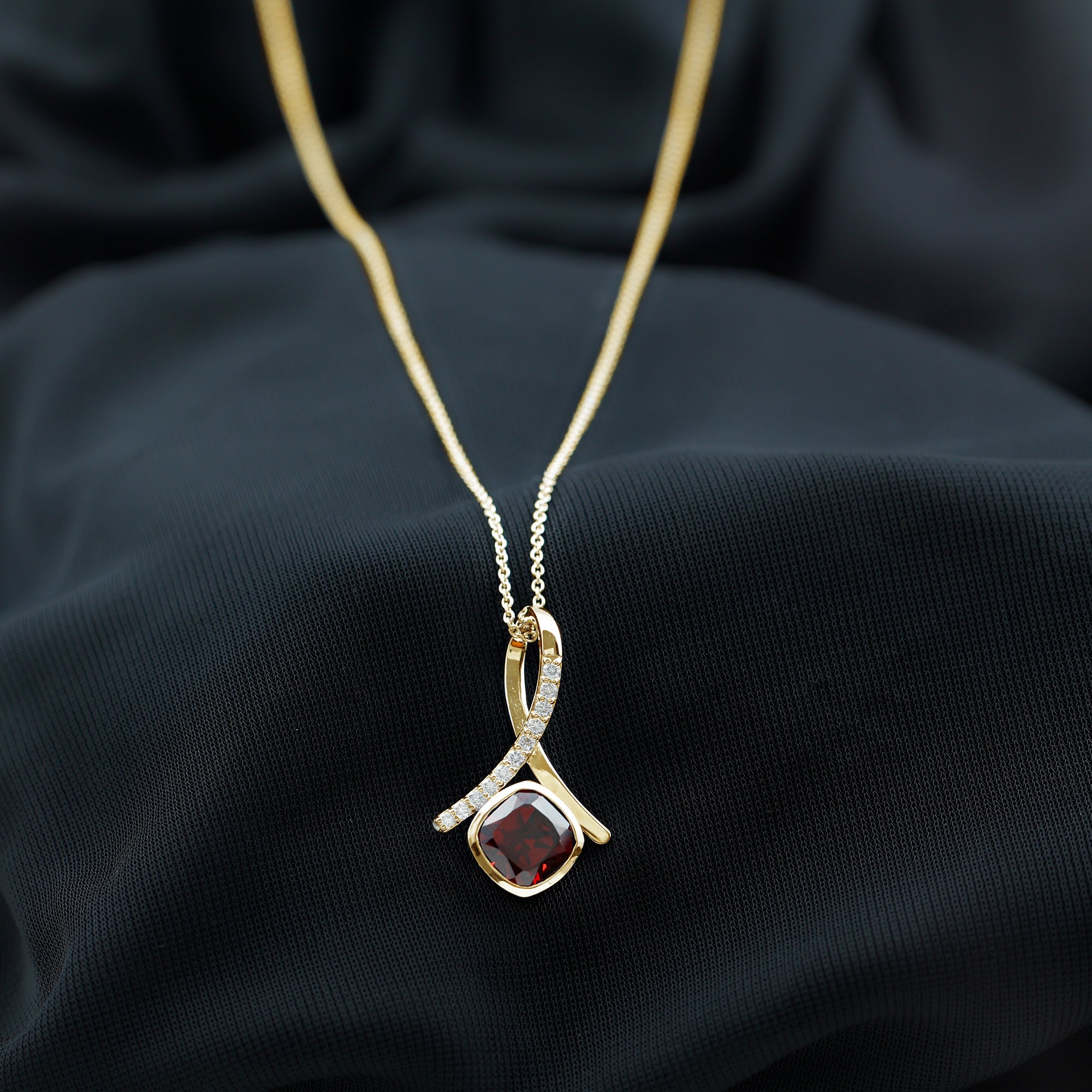 Express your feelings to your lady with this Twisted Pendant adorned with a Cushion Cut Garnet as a solitaire in a Bezel Setting and Round Shape Diamond in a Twisted Bail. This Solitaire Pendant is an opulent choice for different occasions.