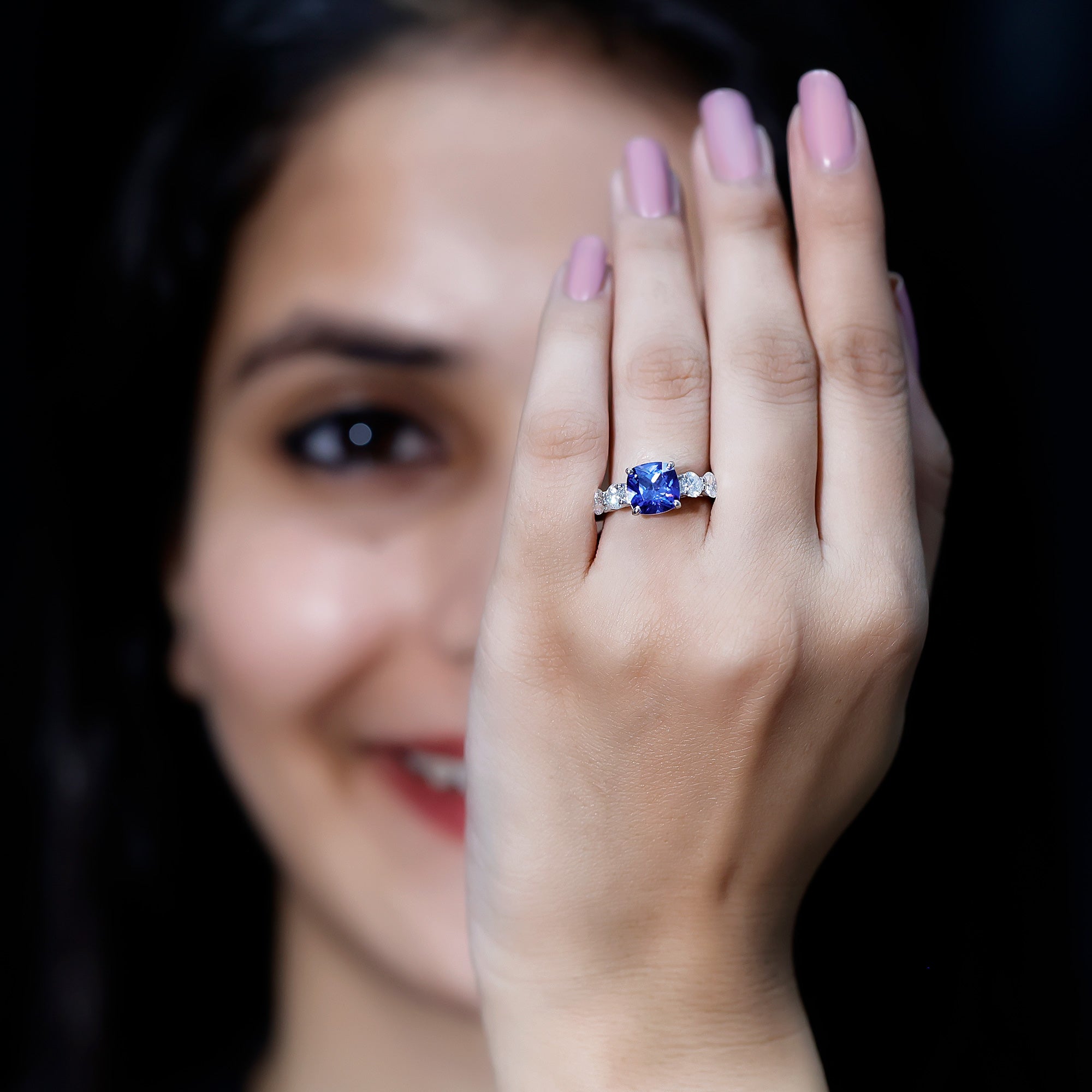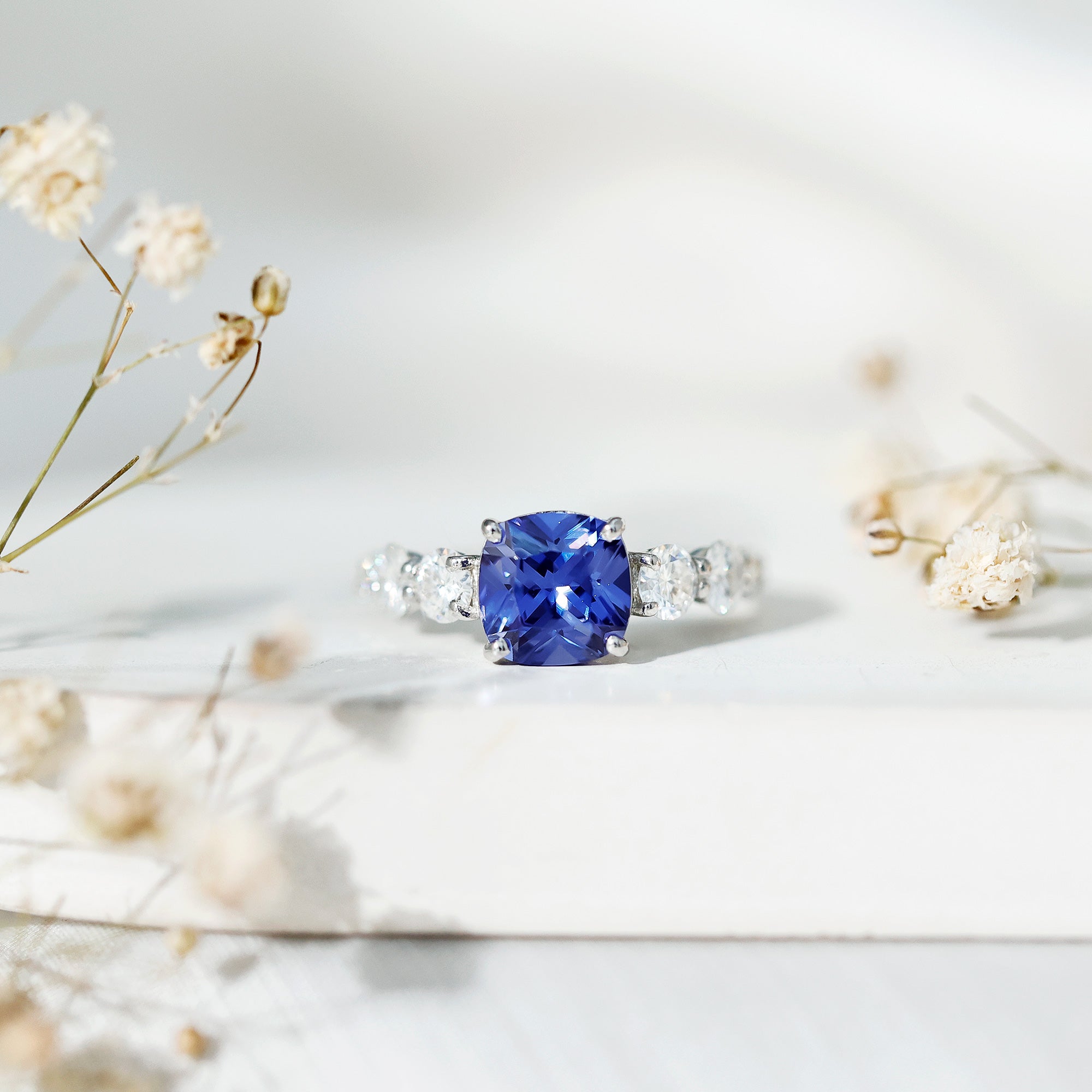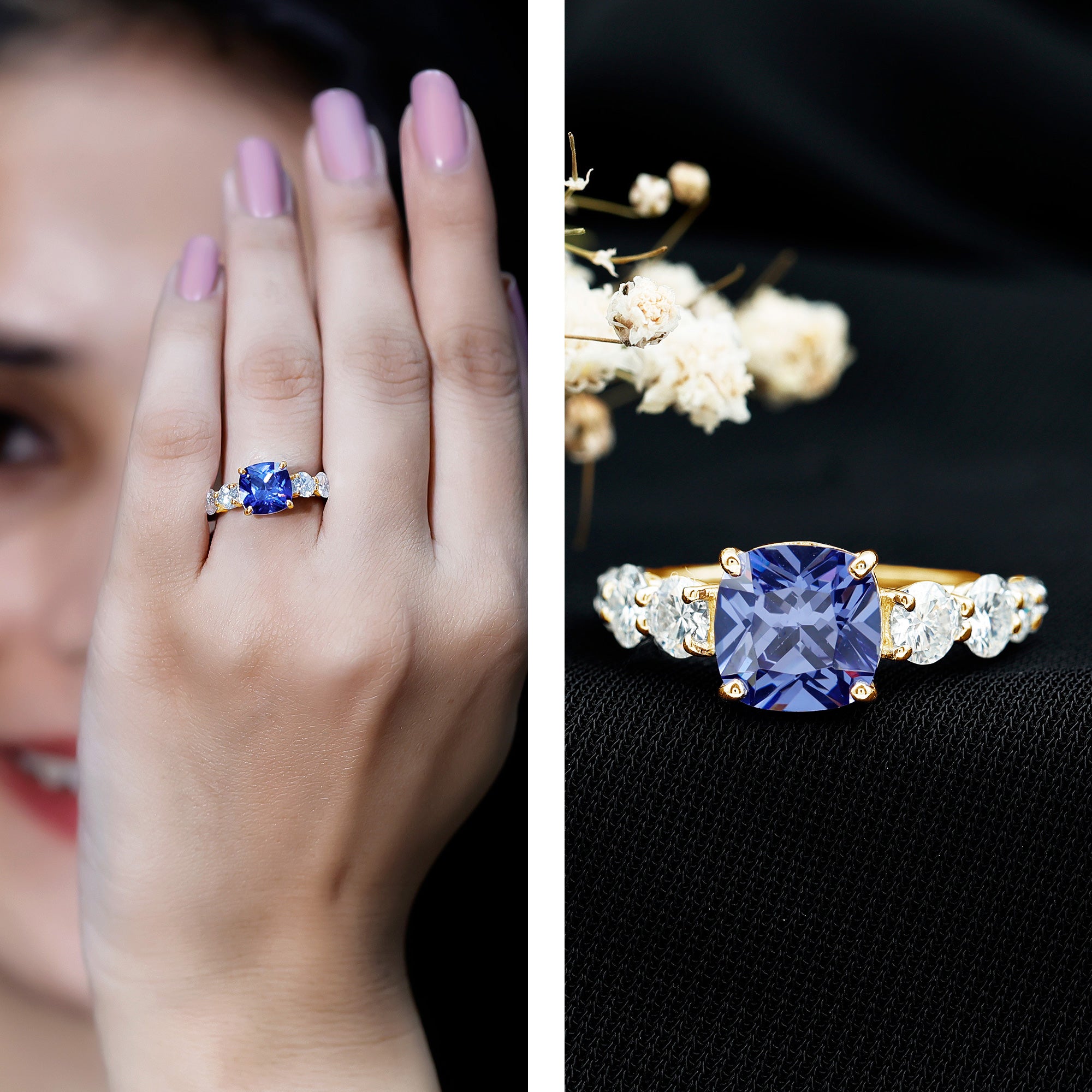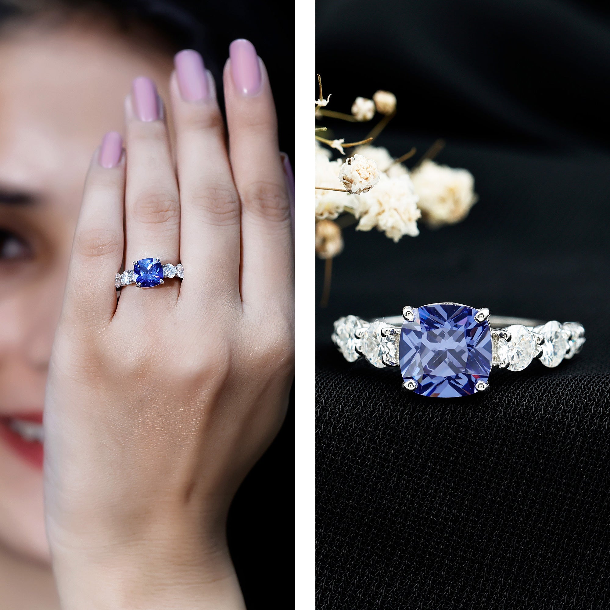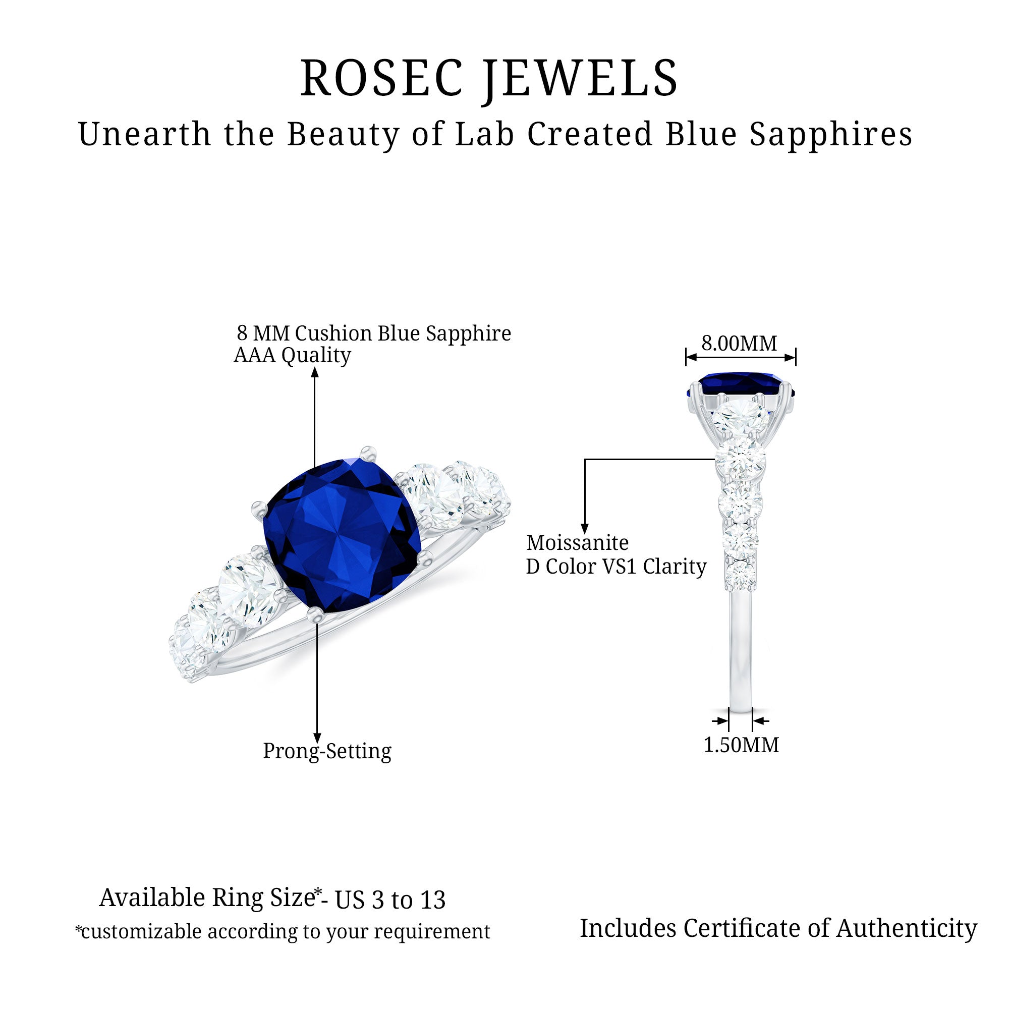 Cushion Cut Lab Grown Blue Sapphire Solitaire Ring with Moissanite