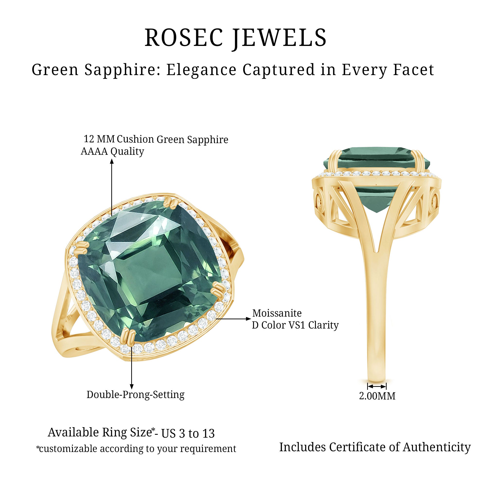 An enchanting Engagement Ring showcasing a perfect Cushion Cut Lab Grown Green Sapphire secured by Double Prong Setting more, Round Moissanite studded as Halo. Why settle for anything less than the gorgeous beauty your partner deserves? Grab this Lab Grown Sapphire Ring for your special one.