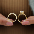 Celebrate your love story with a radiant symbol of forever - this exquisite Moissanite Bridal Ring Set. Designed to make every moment unforgettable, this 2 Piece Ring Set blends timeless elegance with thoughtful craftsmanship. The centerpiece of the set is a Cathedral Solitaire Engagement Ring, showcasing a breathtaking 8 MM cushion cut moissanite in basket setting, allowing the gem to rise gracefully from the finger and catch the light from every angle. A hidden surprise stone add subtle charm and proves that tiny touches make a big impact. Paired perfectly with the engagement ring is a Half Eternity Wedding Band, adorned with shimmering round moissanite stones that complement the brilliance of the center gem while adding their own soft sparkle. Together, the rings create a harmonious Solitaire Wedding Ring Set that is just as stunning when worn together as they are individually. Crafted to perfection, this Moissanite Engagement and Wedding Ring Set brings together durability, beauty, and eco-conscious elegance. Delivered in a luxurious signature jewelry box, it is ready to be gifted, treasured, and admired.