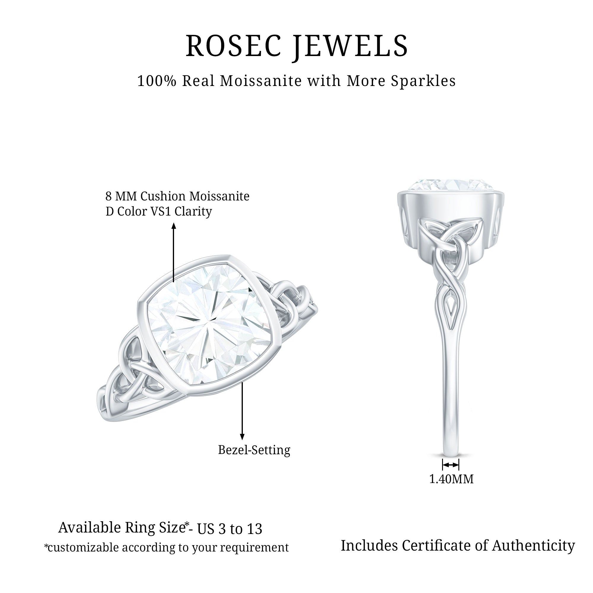 Elevate your love story with this mesmerizing Cushion Cut Engagement Ring, a stunning testament to your love and commitment. Our Solitaire Moissanite Engagement Ring is a stunning mix of sparkle and tradition. At its center lies a dazzling 8 MM cushion cut moissanite of D-VS1 quality, radiating sparkle and shine, celebrated for its beauty and durability. The cushion cut gem is securely set in bezel setting, making it perfect for everyday wear. The band showcases a charming Celtic knot design on either side of the center stone. These knots are not just for looks, they represent everlasting love, unity, and trust. The combination of the bright moissanite and the intricate band gives this Celtic Design Engagement Ring a feel that is both classic and one-of-a-kind. The Celtic motif adds a unique touch of tradition, while the simple stone ensures it remains timeless and easy to wear daily. This 3 Carat Moissanite Ring is ideal for someone who appreciates meaningful designs with a hint of elegance. It is a thoughtful option for a proposal, an anniversary, or any special occasion in your love story. The Bezel Engagement Ring comes in US sizes 3 to 13 and is presented in a beautiful jewelry box, ready for gifting or safely storing until the big day.
