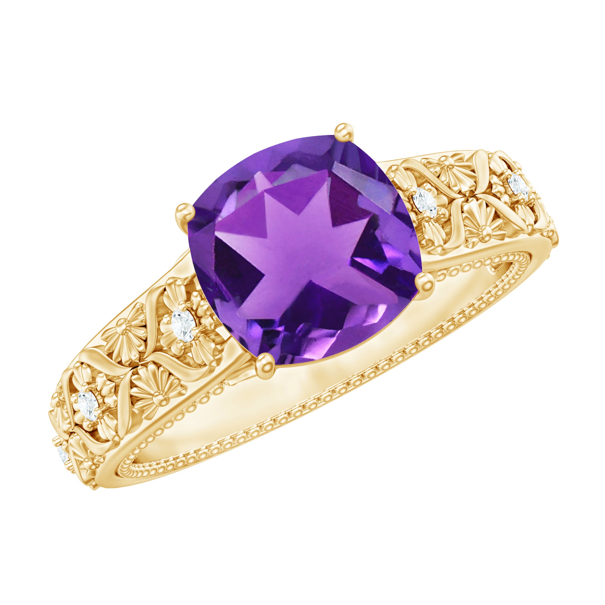 Cushion Cut Solitaire Amethyst Floral Engagement Ring with Diamond