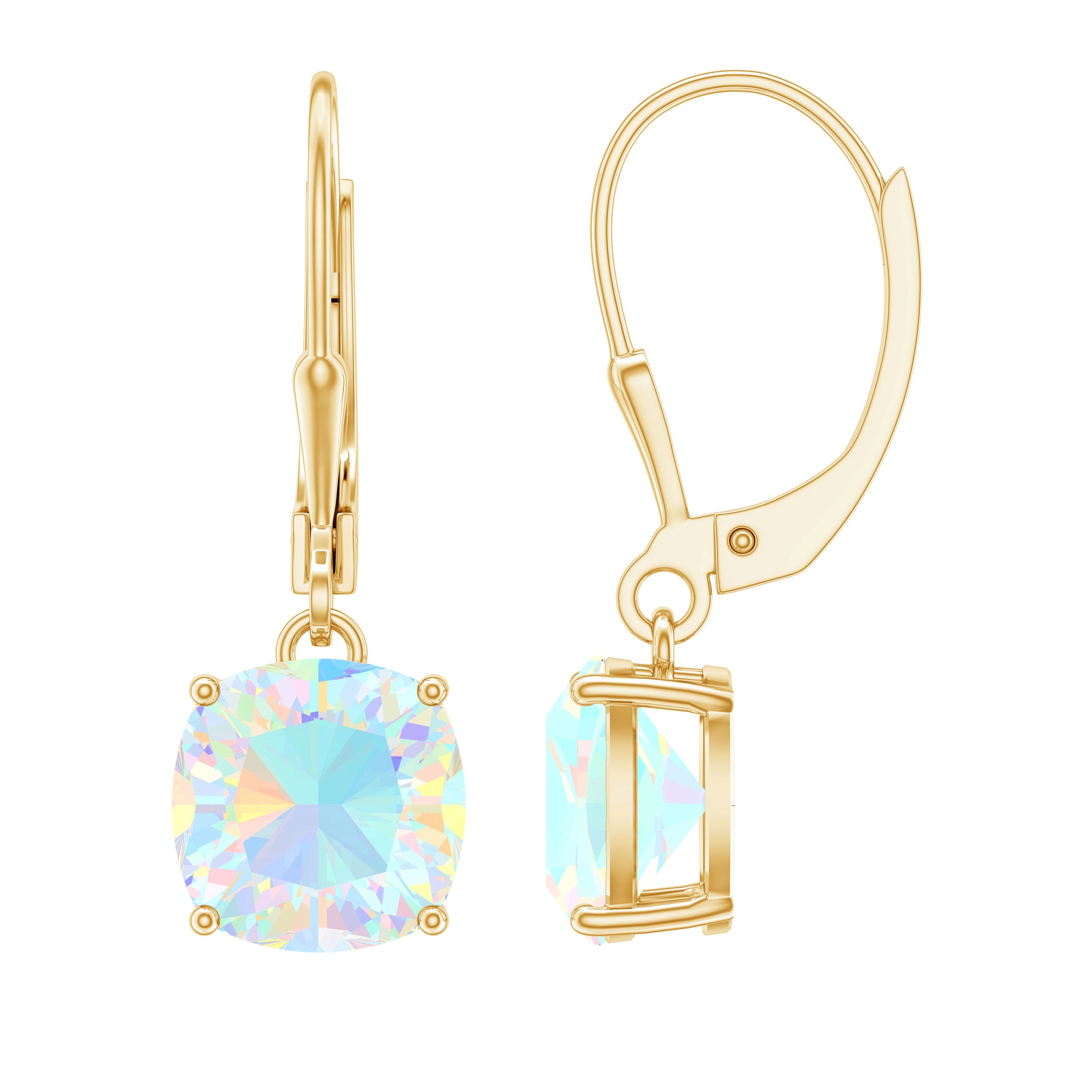 The Vibarance captured in these Opal Earrings makes them perfect to achieve a subtle style. The pair of earrings feature an 8 mm Cushion Cut Ethiopian Opal in the 4-prong setting. The Earring sparkles with AAA Quality Ethiopian Opal dangled with a Lever Back Closure. These Drop Earrings are best to achieve a minimal and subtle look for the formal gatherings. These Rainbow Opal Drop Earrings are the perfect option to be presented on the Birthday especially when she is an October born.