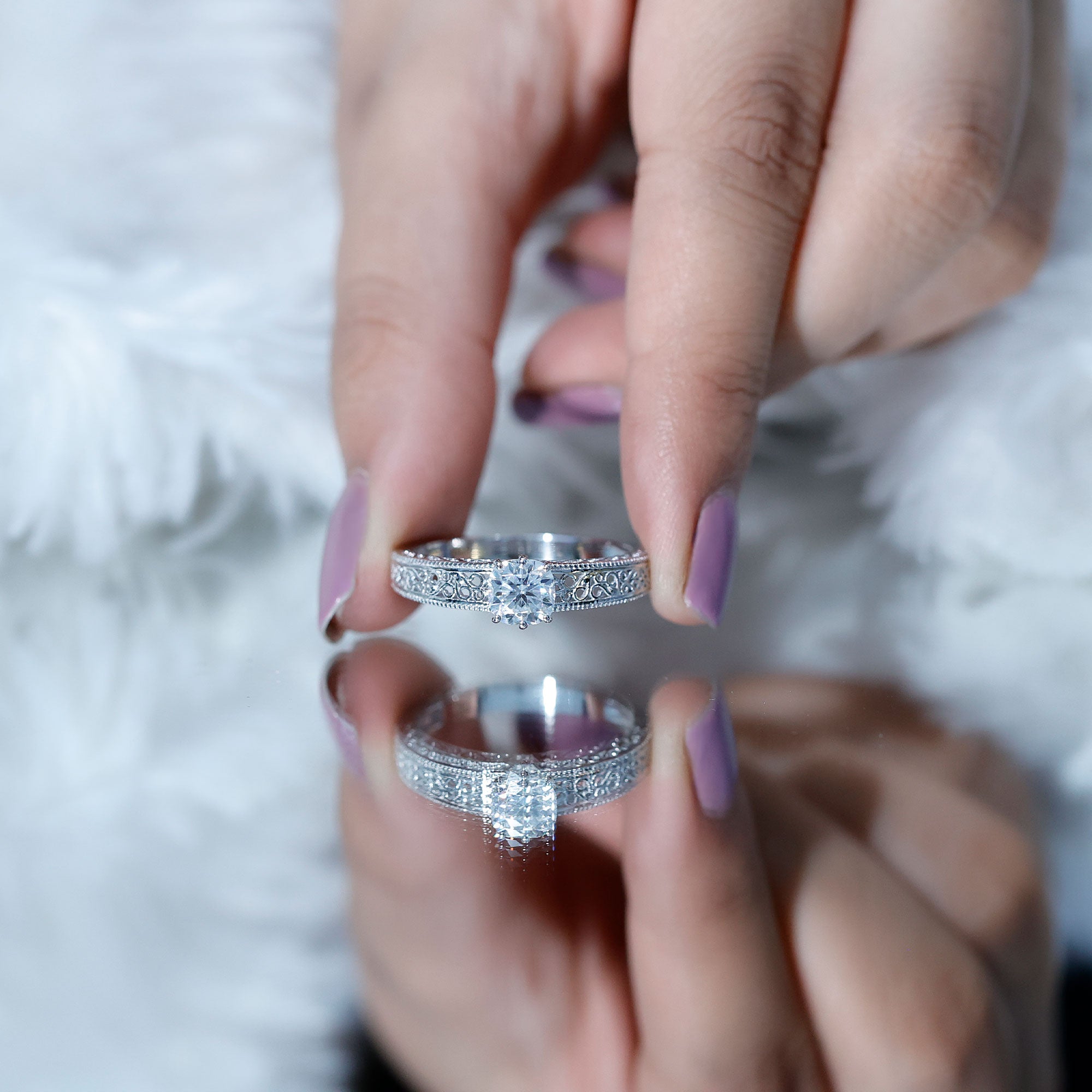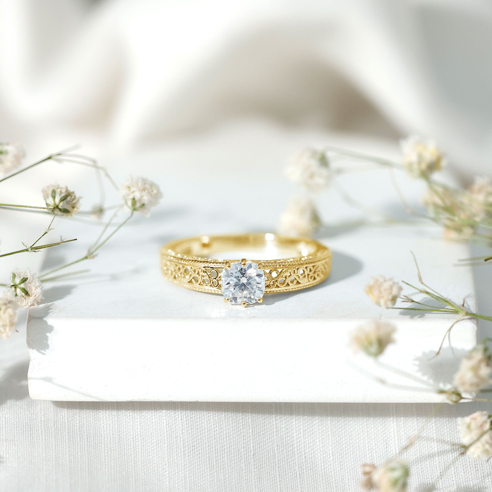 Pop the biggest question of your life with this gorgeous Solitaire Moissanite Engagement Ring, which perfectly combines romance, vintage allure, and everlasting sparkle. At the heart of this Vintage Style Engagement Ring lies a 6 MM cushion cut moissanite, expertly set in sturdy claw setting that showcases its shape and allows it to shine from every angle. The Moissanite boasts a D color and VS1 Clarity rating, sparkling with brilliance and clarity, ensuring your love story shines brighter than ever. The band is just as captivating as your love story. Made with care from high-quality metal, it features a detailed filigree design that gives the Cushion Cut Engagement Ring a genuine antique vibe, reminiscent of a cherished family heirloom. Delicate milgrain detailing runs along the shank, adding texture and sophistication that unifies the entire design. With its classic shape and traditional craftsmanship, this piece is perfect for someone who values timeless beauty with a modern twist. The complete design merges emotion, artistry, and sparkle to create a piece that conveys more than words ever could. Available in various metal types and colors, you can customize the look to suit her style. Every detail is crafted to reflect the love you both share.