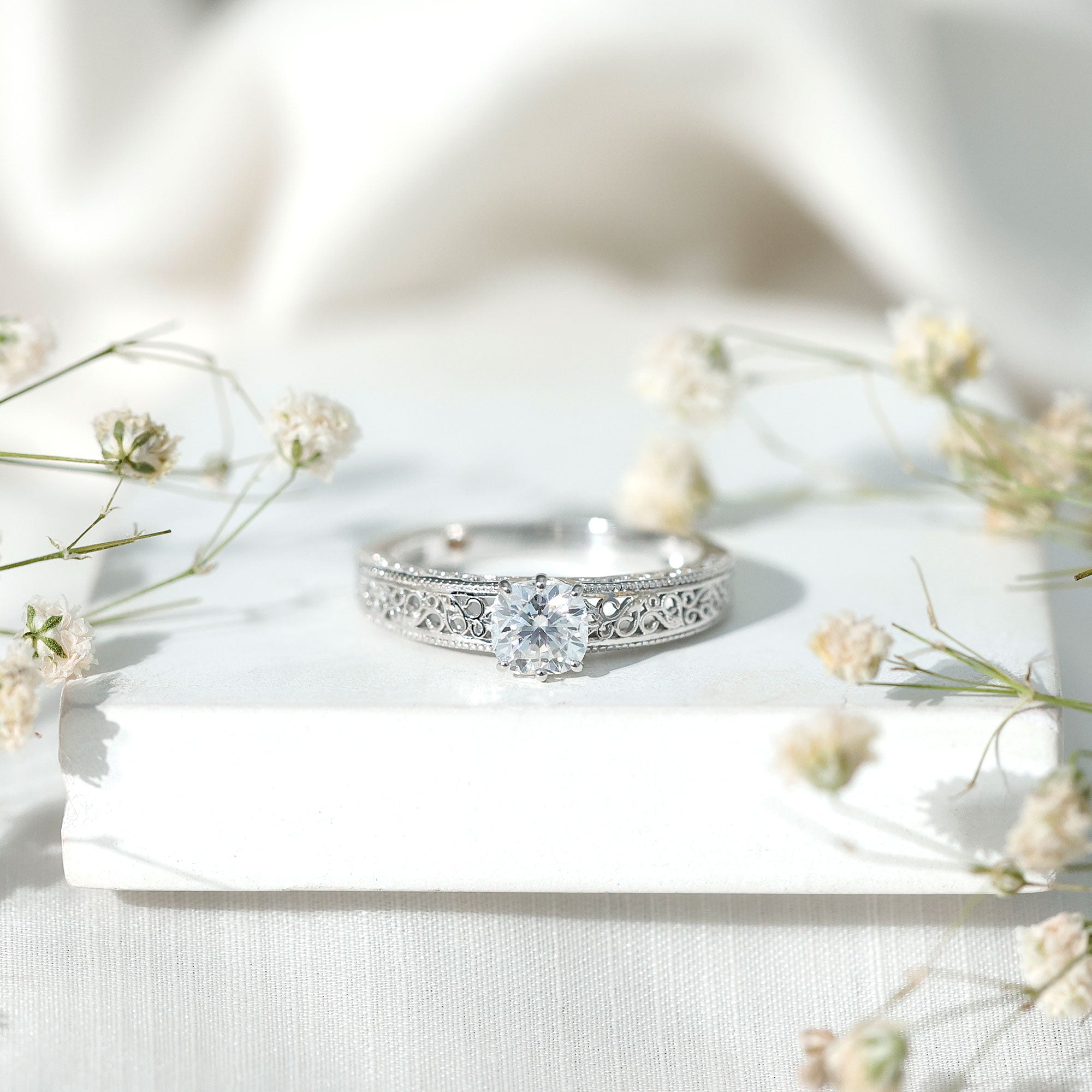 Cushion Cut Solitaire Moissanite Engagement Ring with Filigree Detail