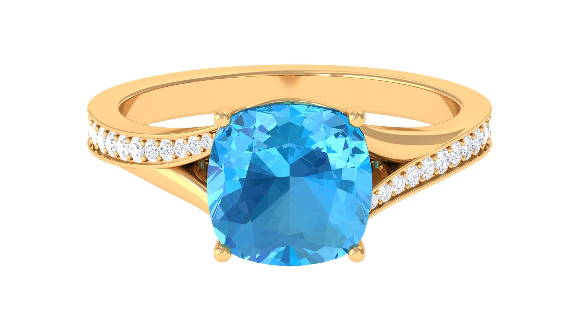 An enticing Engagement Ring featuring Cushion Cut Swiss Blue Topaz in 4 Prong Setting mounted in Solid Gold and adorned with Brilliant Cut Diamond as accent decorating the Split Shank of the ring.