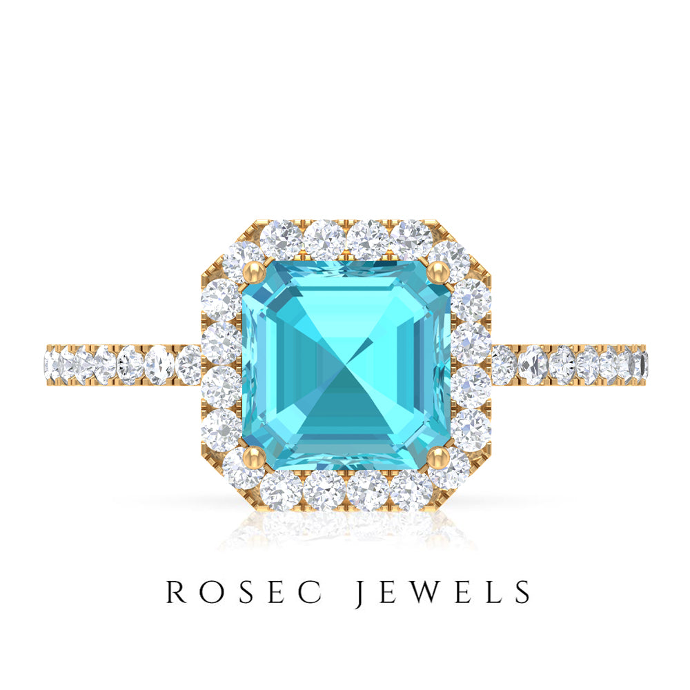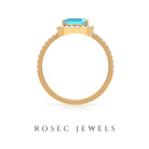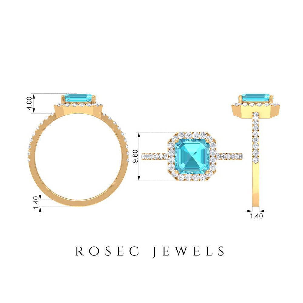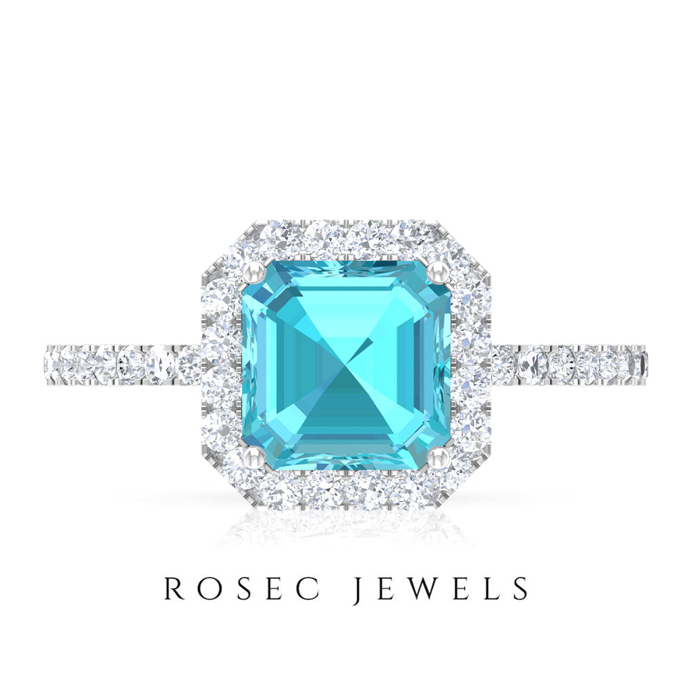 An Engagement Ring featuring Cushion Cut Swiss Blue Topaz in 4 Prong Setting and Diamond arranged in Halo style. The Shank of the Engagement Ring is embellished with Diamond Accent.