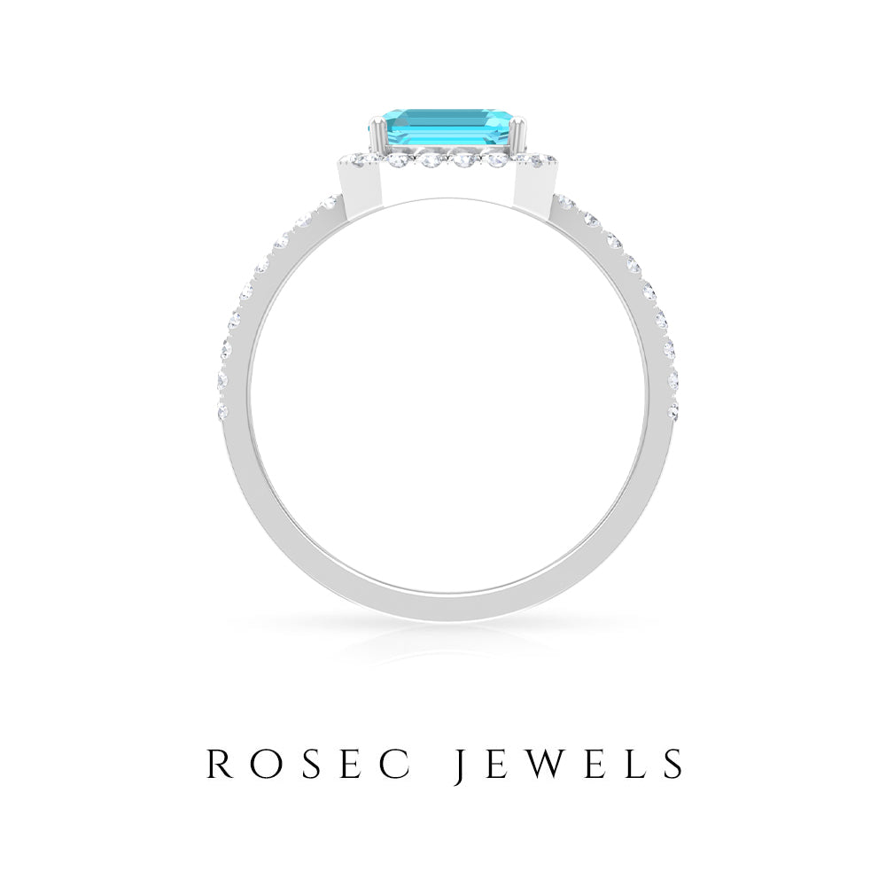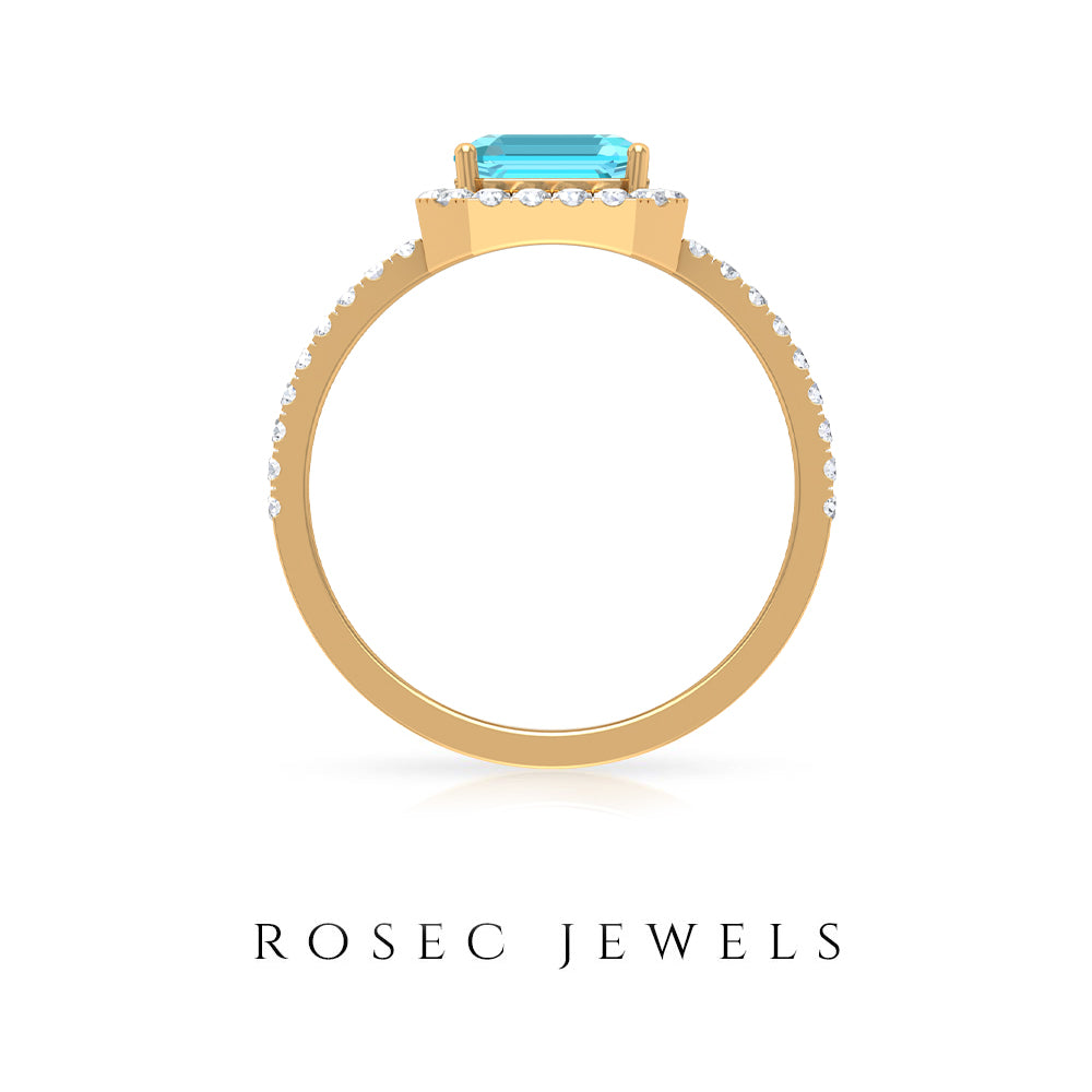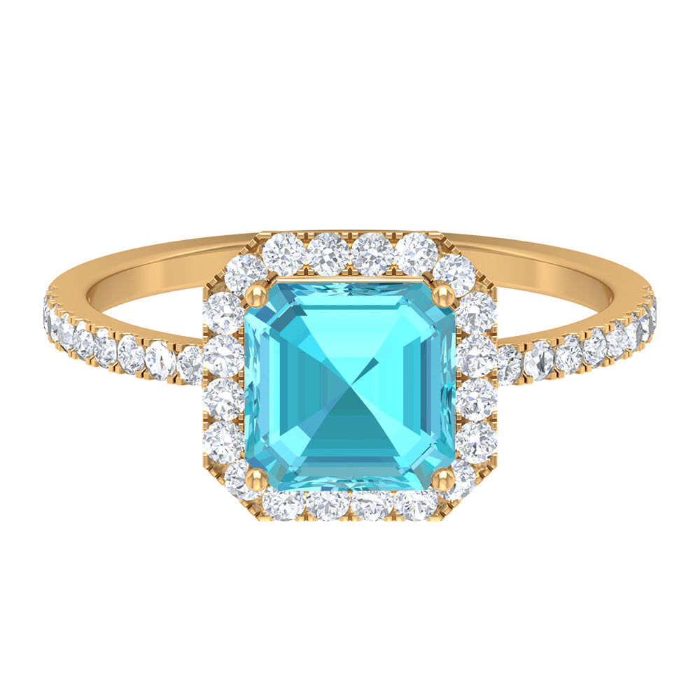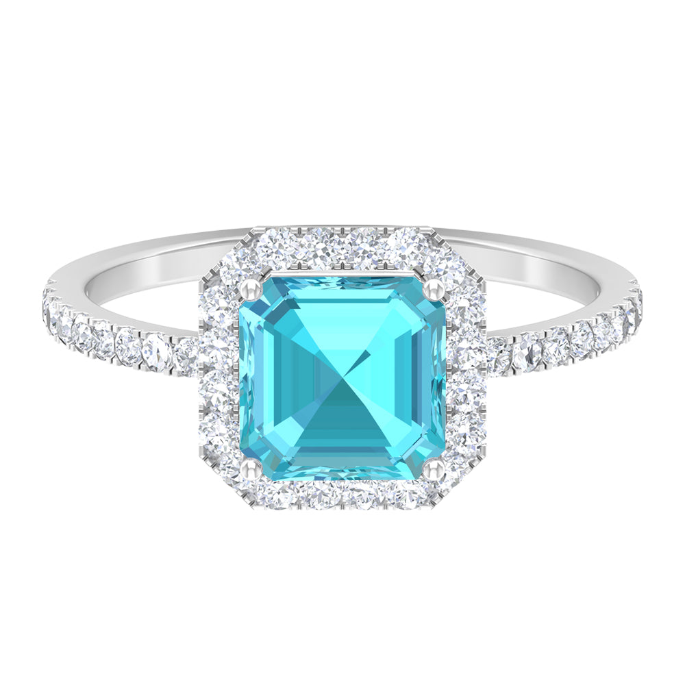 An Engagement Ring featuring Cushion Cut Swiss Blue Topaz in 4 Prong Setting and Diamond arranged in Halo style. The Shank of the Engagement Ring is embellished with Diamond Accent.