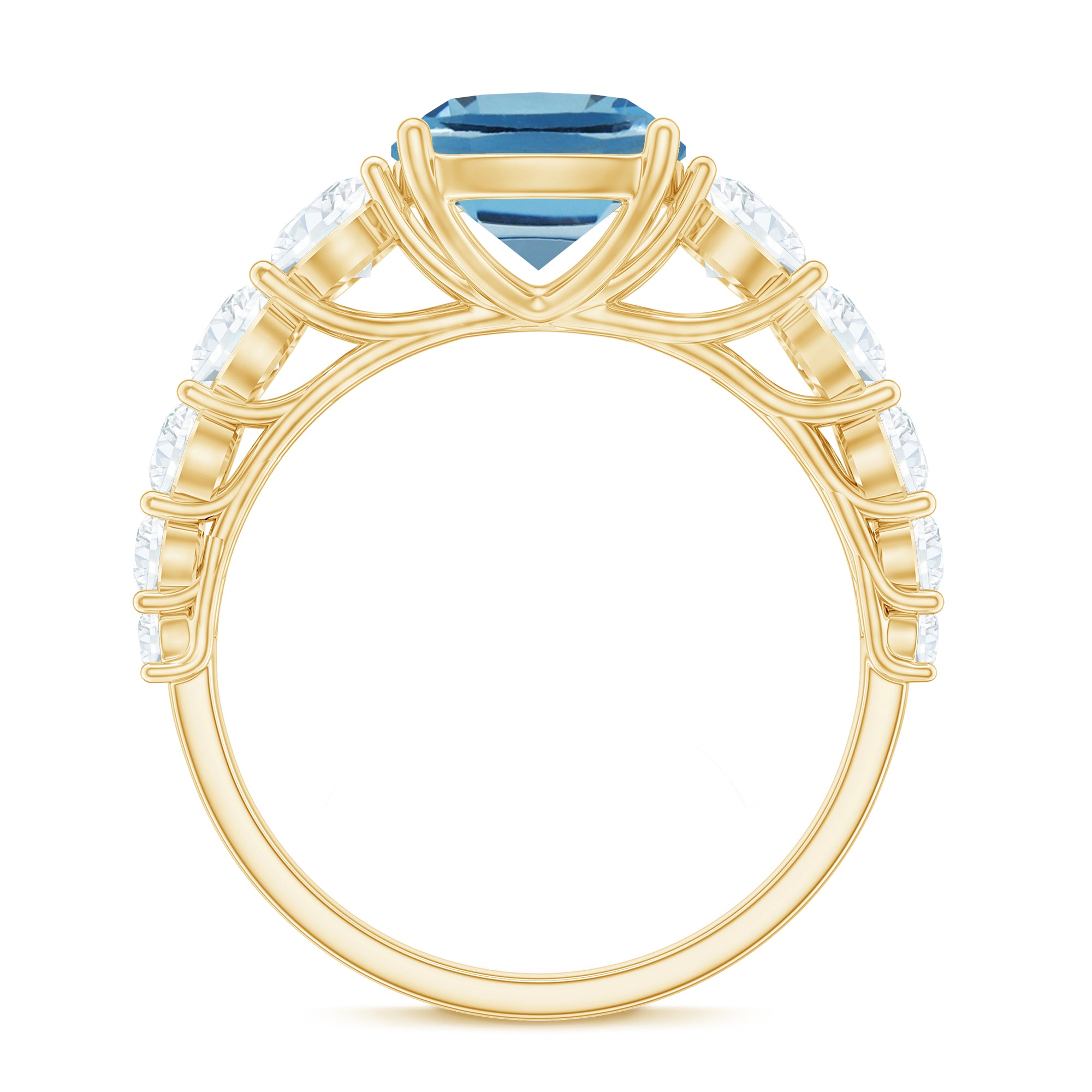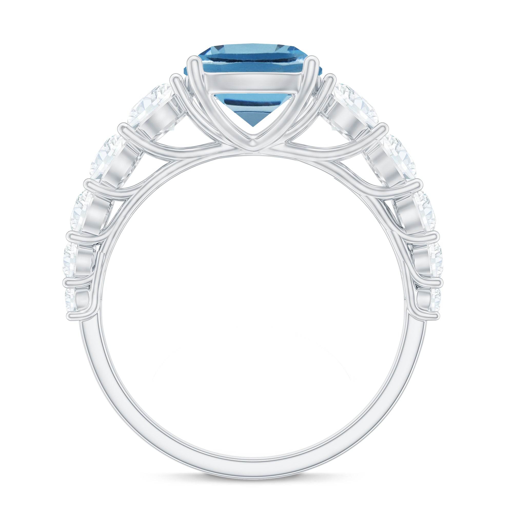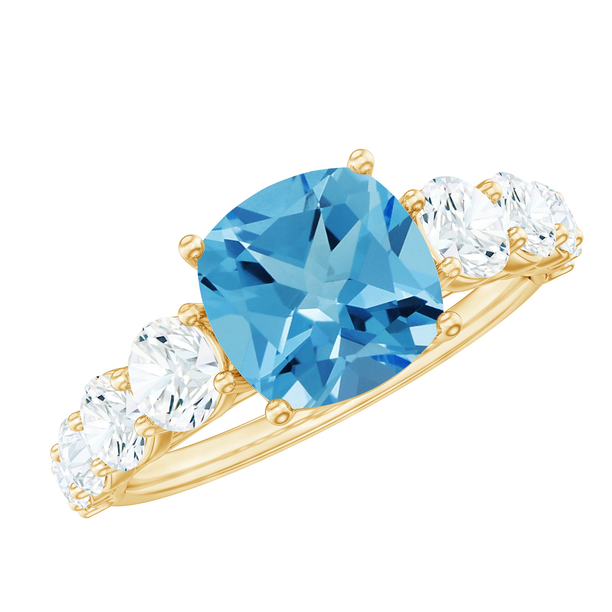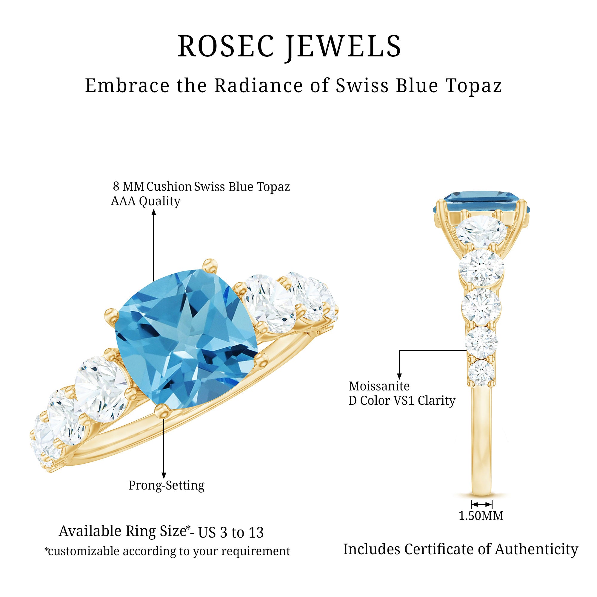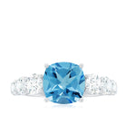 Cushion Cut Swiss Blue Topaz Solitaire and Moissanite Side Stone Engagement Ring