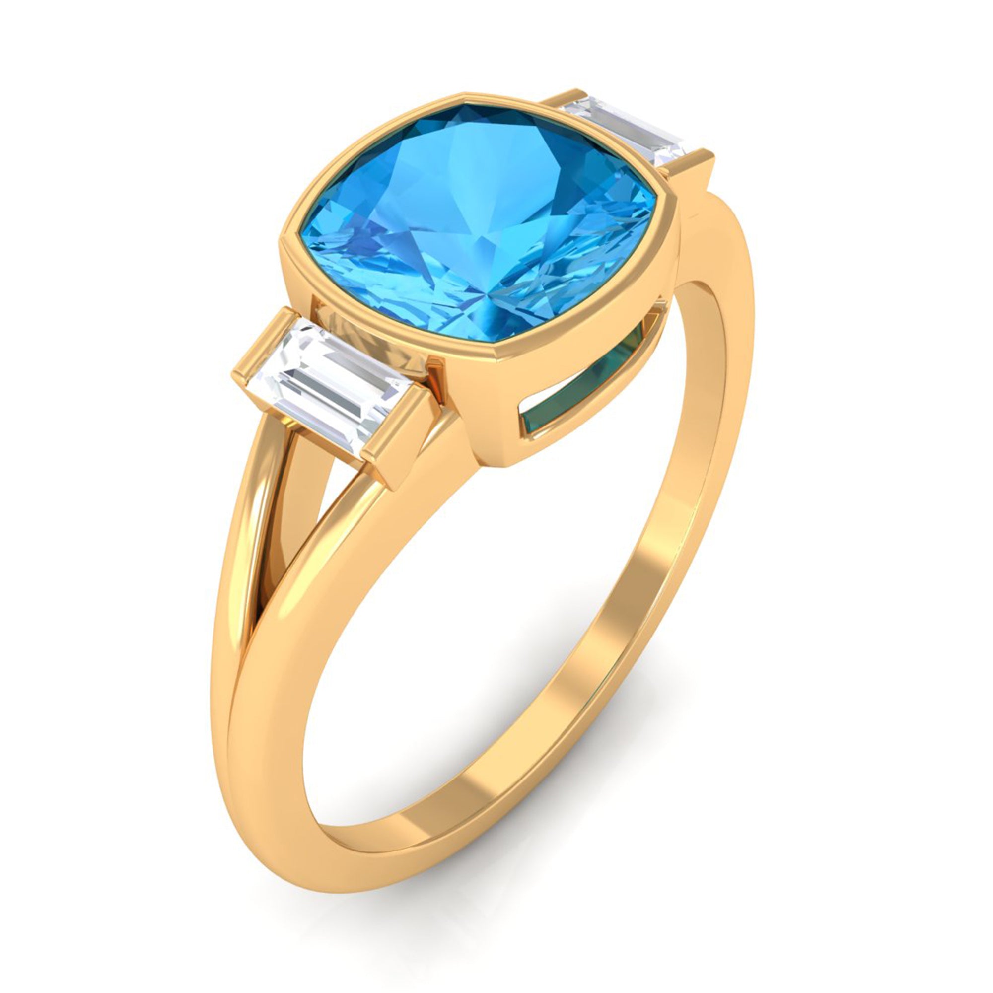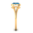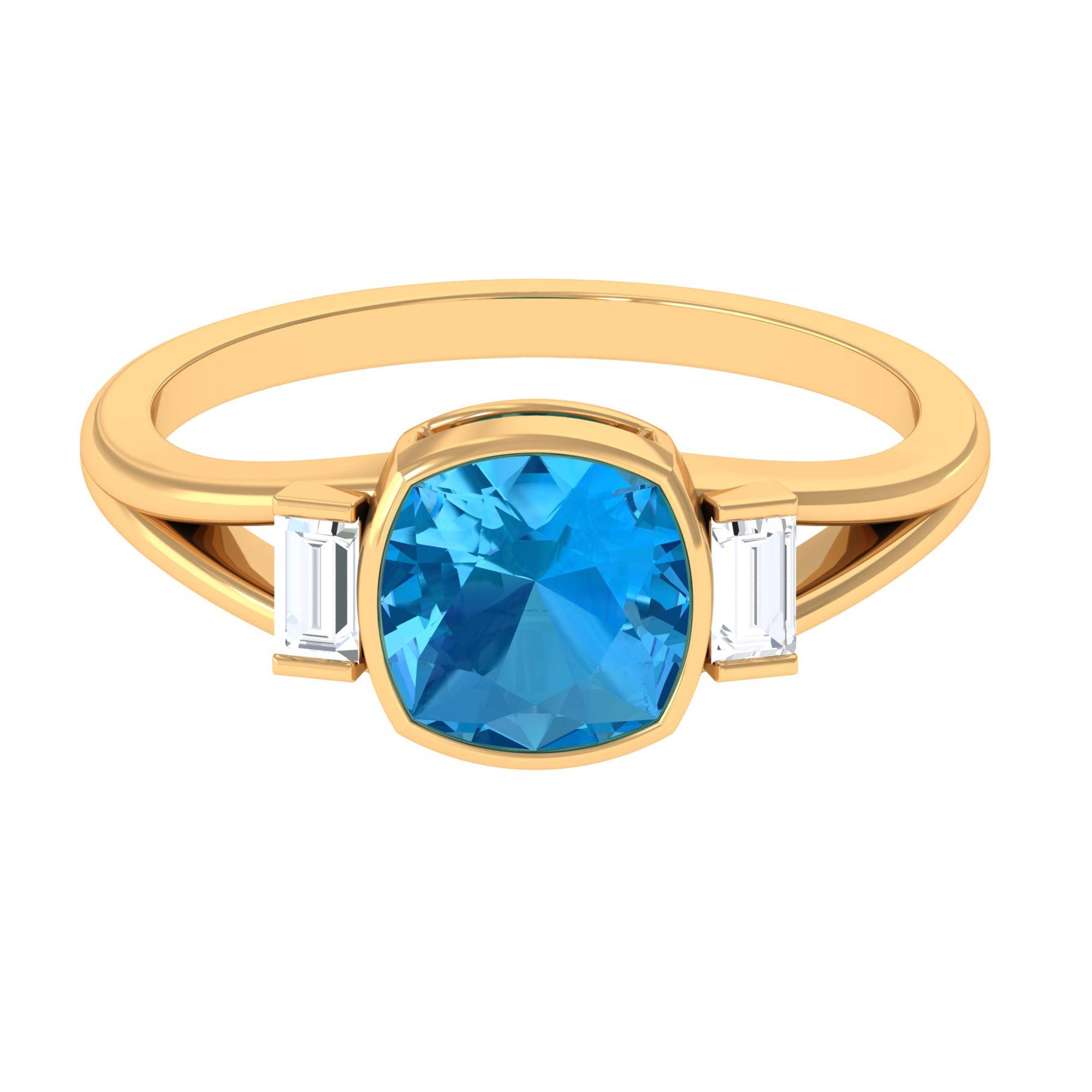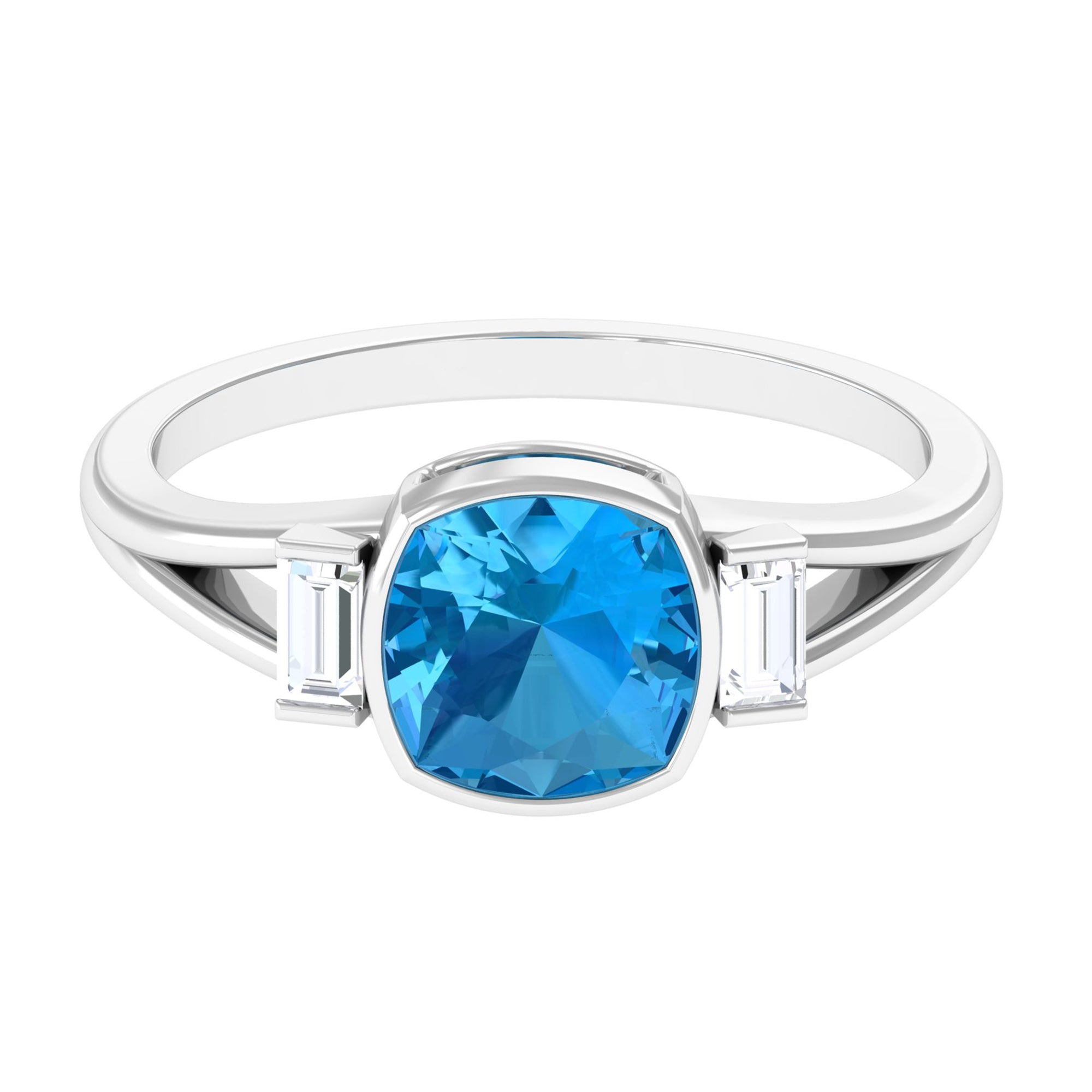 Experience the allure of this Solitaire Ring adorned with a Cushion Cut Swiss Blue Topaz in Bezel Setting over the Split Shank with Diamond on either side.