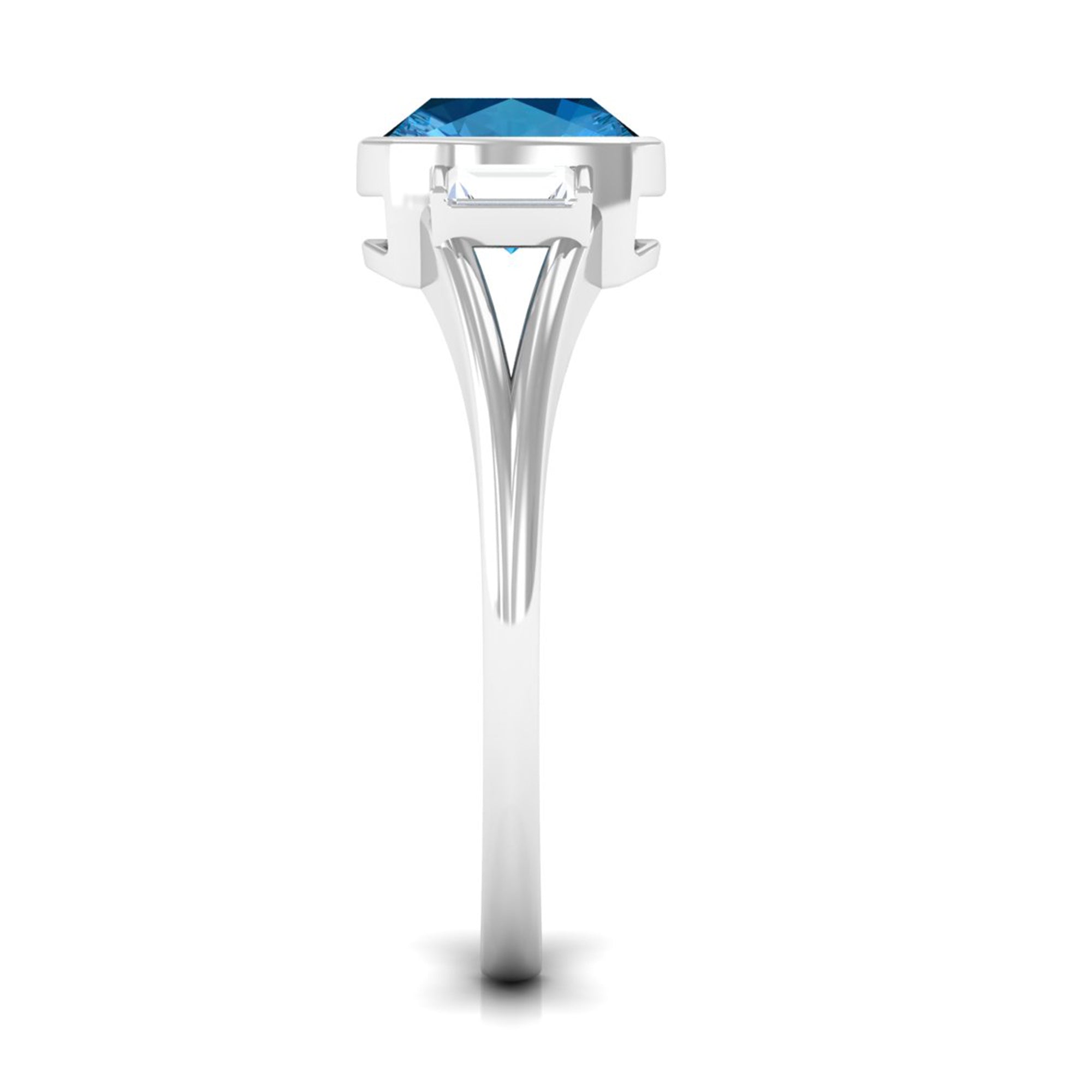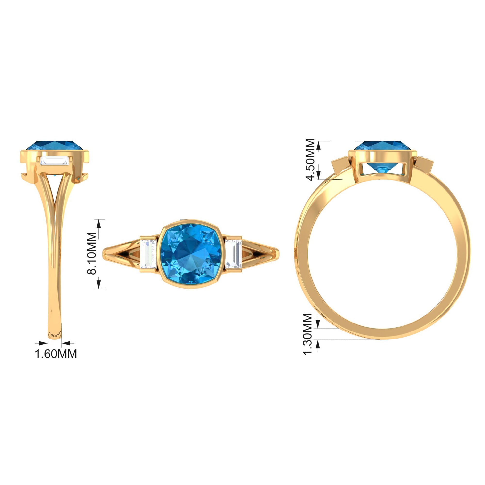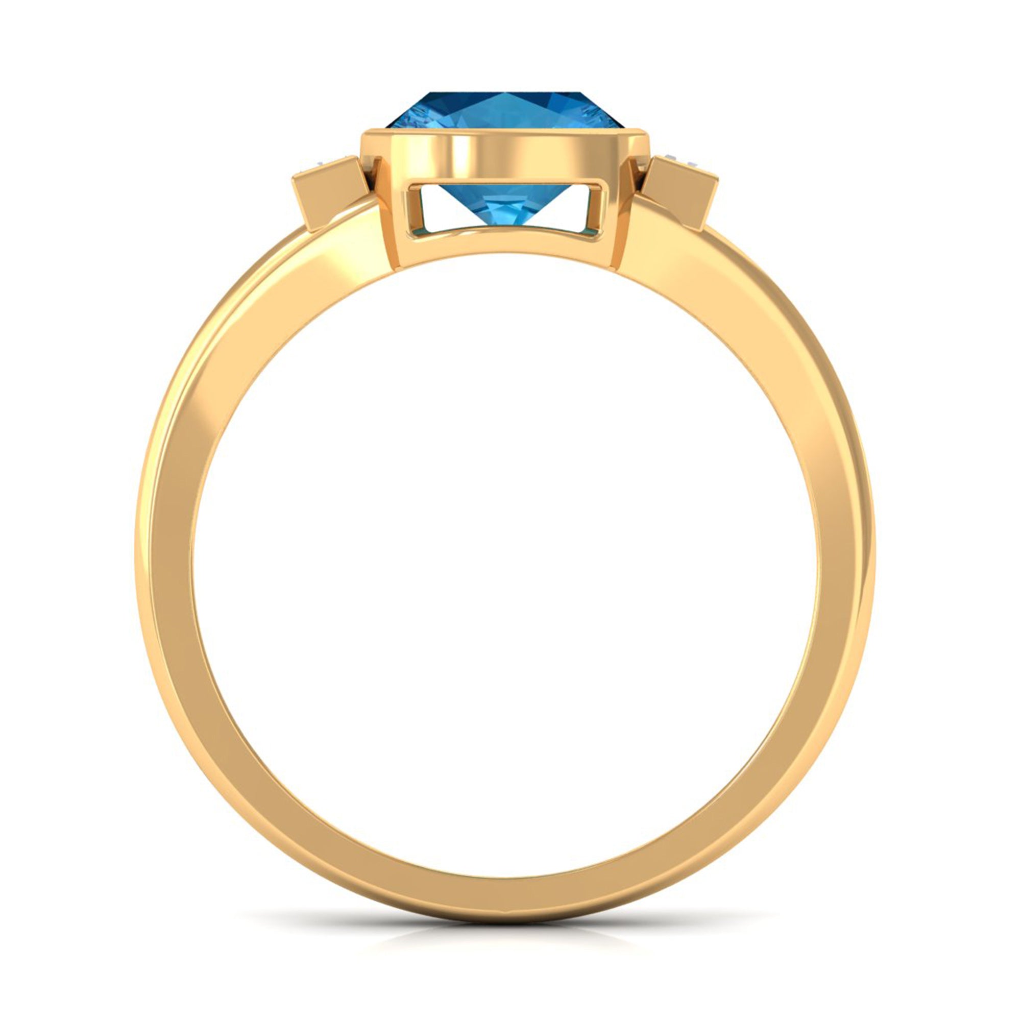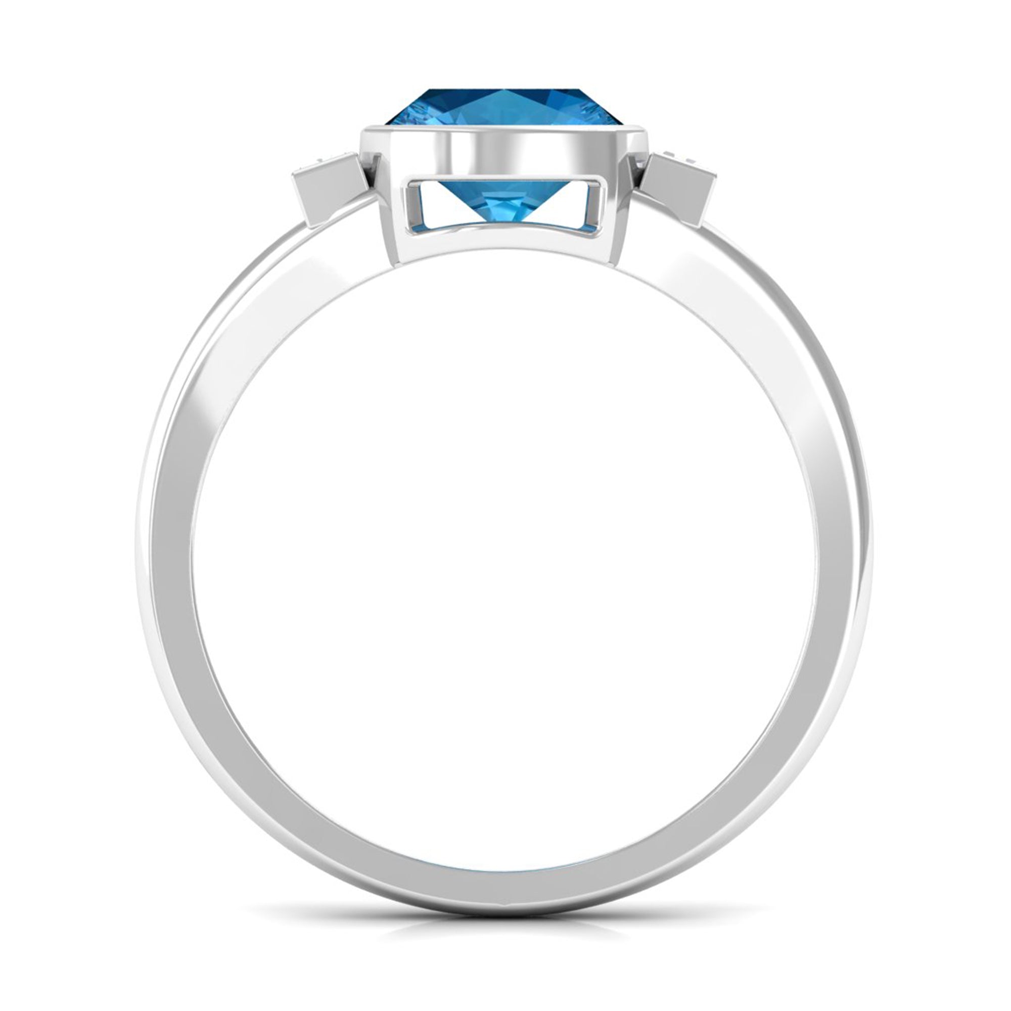 Experience the allure of this Solitaire Ring adorned with a Cushion Cut Swiss Blue Topaz in Bezel Setting over the Split Shank with Diamond on either side.