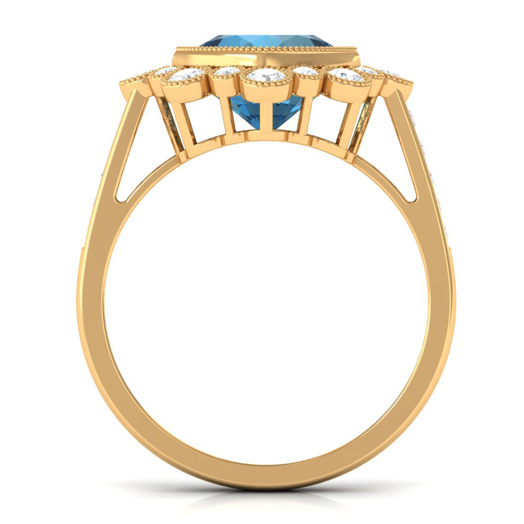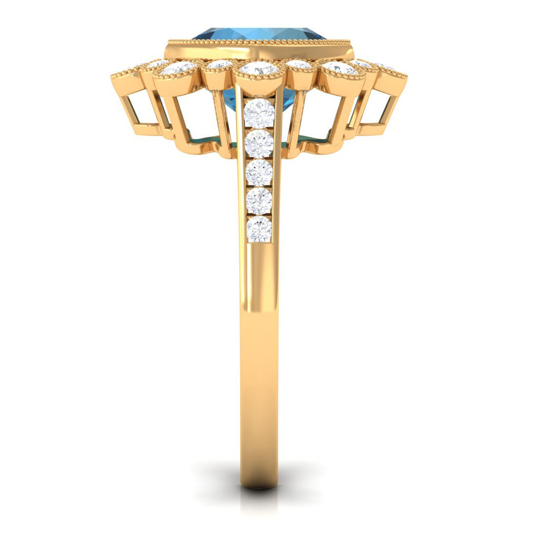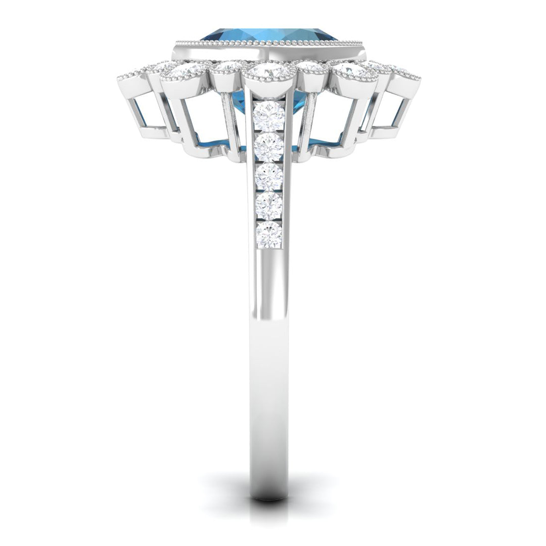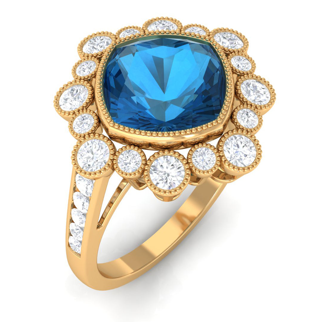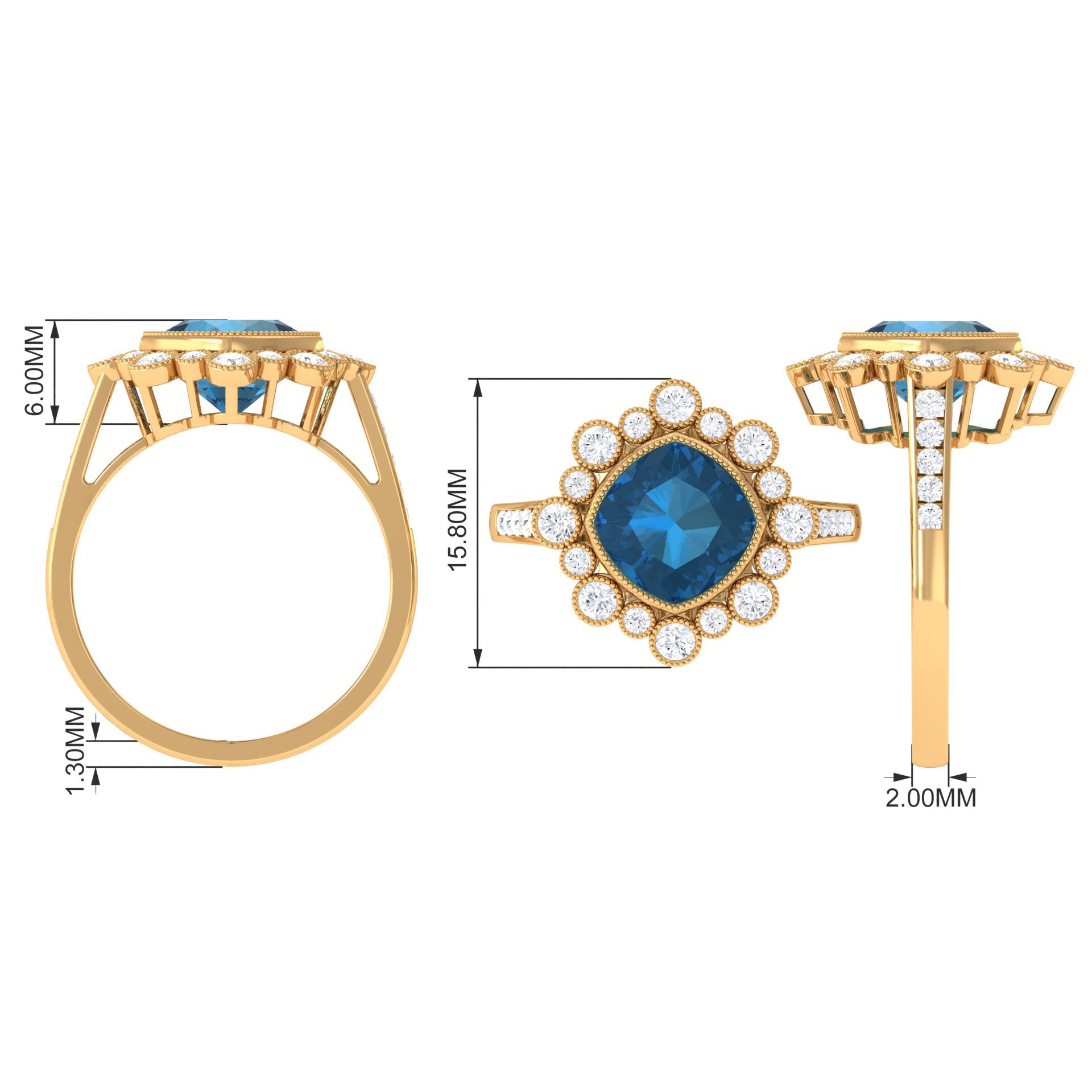 Capture attention with our London Blue Topaz Engagement Ring, designed to be the center of attention. Adorned with a hint of sparkle, this Blue Topaz and Diamond Engagement Ring is a genuine showstopper featuring a distinctive floral-inspired halo. At its core lies a striking 8 MM cushion cut london blue topaz, securely held in a beaded bezel setting that highlights its vibrant blue brilliance. Encircling the blue topaz, a halo of shimmering big and small round shape diamonds is arranged in an alternative pattern in a bezel setting, imparting the Cocktail Ring with a captivating radiance that is rich in significance. The combination of deep blue and bright white stones creates a stunning contrast that feels both contemporary and romantic. The band is adorned with round shape diamonds, ensuring both comfort and elegance on the hand. Whether you are proposing or simply wish to surprise a loved one, this Cocktail Engagement Ring enhances the moment with an extra touch of magic. This Bezel Engagement Ring is ideal for someone who appreciates jewelry with personality—something unique, bold, yet eternally classic. It is intricate in detail but profound in meaning, serving as a beautiful expression of love, admiration, or the importance of someone special in your life. Thoughtfully packaged and ready for gifting, this Natural London Blue Topaz Ring stands as a symbol of love that shines brightly today, tomorrow, and forever.