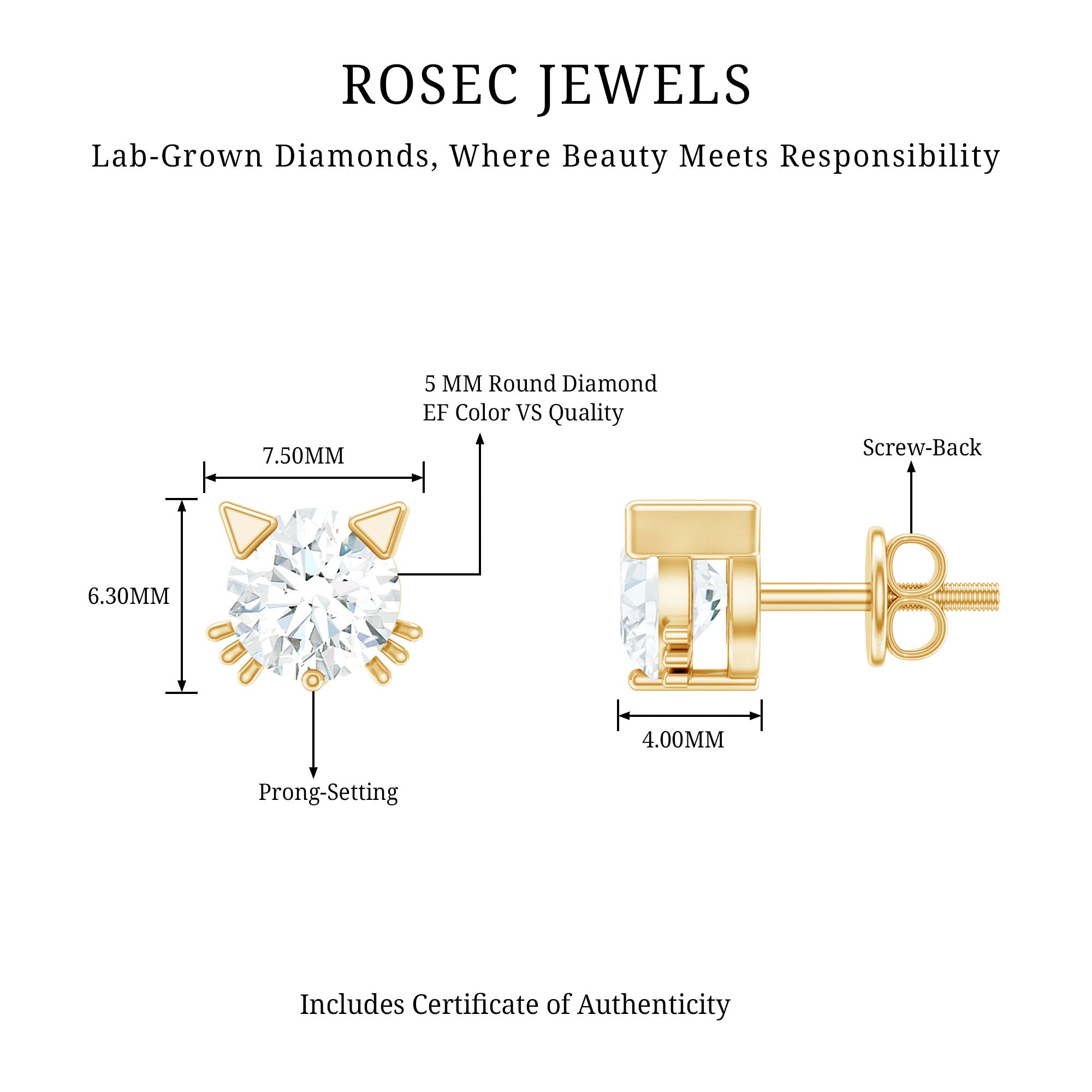 Add a touch of playfulness to your style with these adorable Cat Stud Earrings adorned with a 5 MM Round Shape Lab Grown Diamond gemstone set in Prong Setting. These Kitty Stud Earrings feature ears and whiskers for a touch of feline grace. Secured with Screw Back Closure, these Lab Grown Diamond Earrings are also a perfect Birthday Gift for your daughter. Perfect for anyone who loves cats or enjoys cute accessories, these Diamond Stud Earrings add a playful touch to any look. Their sweet design brings out your fun side and makes everyday outfits feel a little more special. Light and comfortable, they are easy to wear from morning to night. They also make a thoughtful gift for a cat-loving friend, offering a simple way to celebrate their love for furry companions. Designed with care, the Cute Stud Earrings stand out for their charm without being too bold. Cute, meaningful, and full of personality, these earrings are a delightful addition to any jewelry collection.