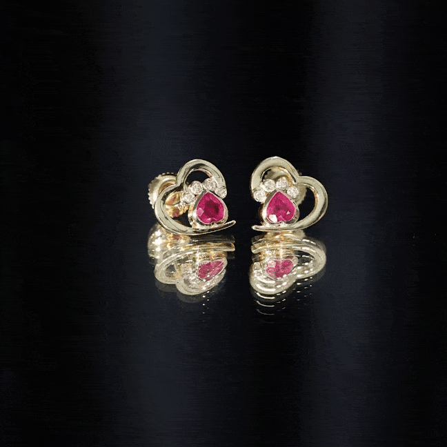 Cute Heart Paw Stud Earrings with Ruby and Diamond