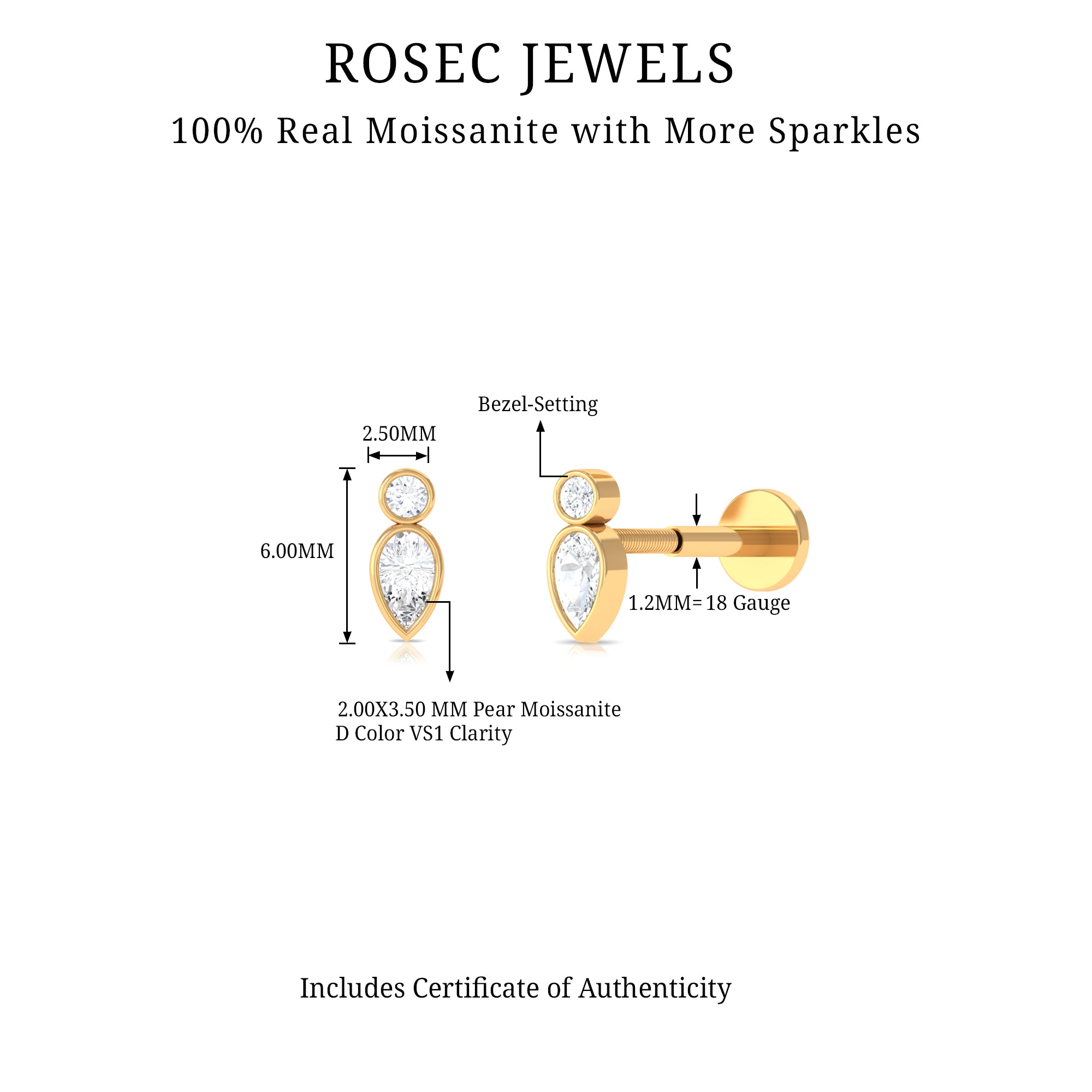 This Moissanite Tragus Earring is embellished with Pear and Round Cut Moissanite secured in Bezel Setting. You can wear this Moissanite Earring on your Helix, Cartilage, Tragus, Conch, or Upper Lobe Piercing. Grab this simple Piercing Earring for your special one as a Birthday or Anniversary Gift and make her heart flutter.