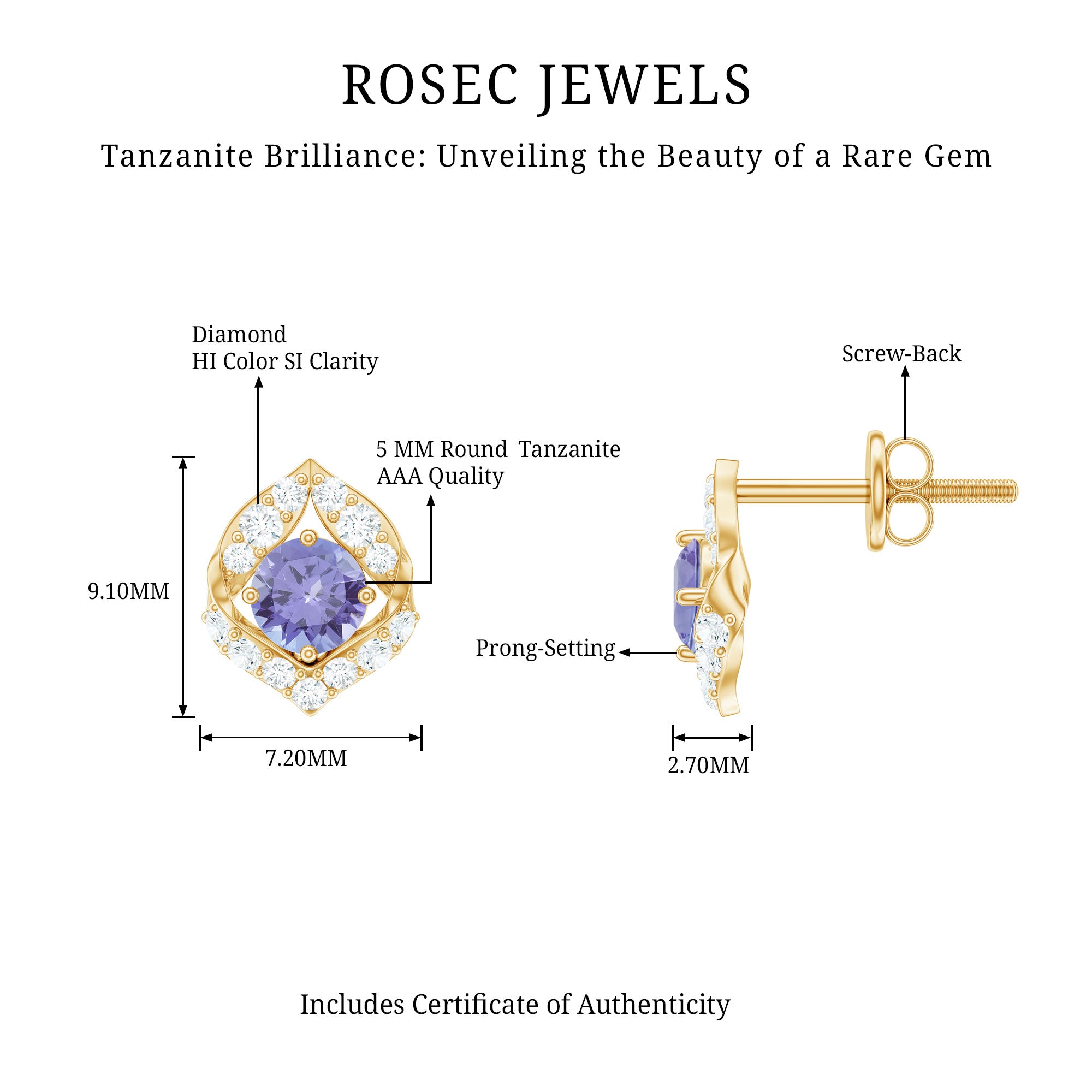 These tanzanite stud earrings are a stunning and unique piece of jewelry. The round tanzanite center stone is surrounded by tiny sparkling diamonds encased in a petal design, adding a touch of luxury and sparkle to the earrings. They can be dressed up or down and will surely add a touch of glamour to any outfit.
