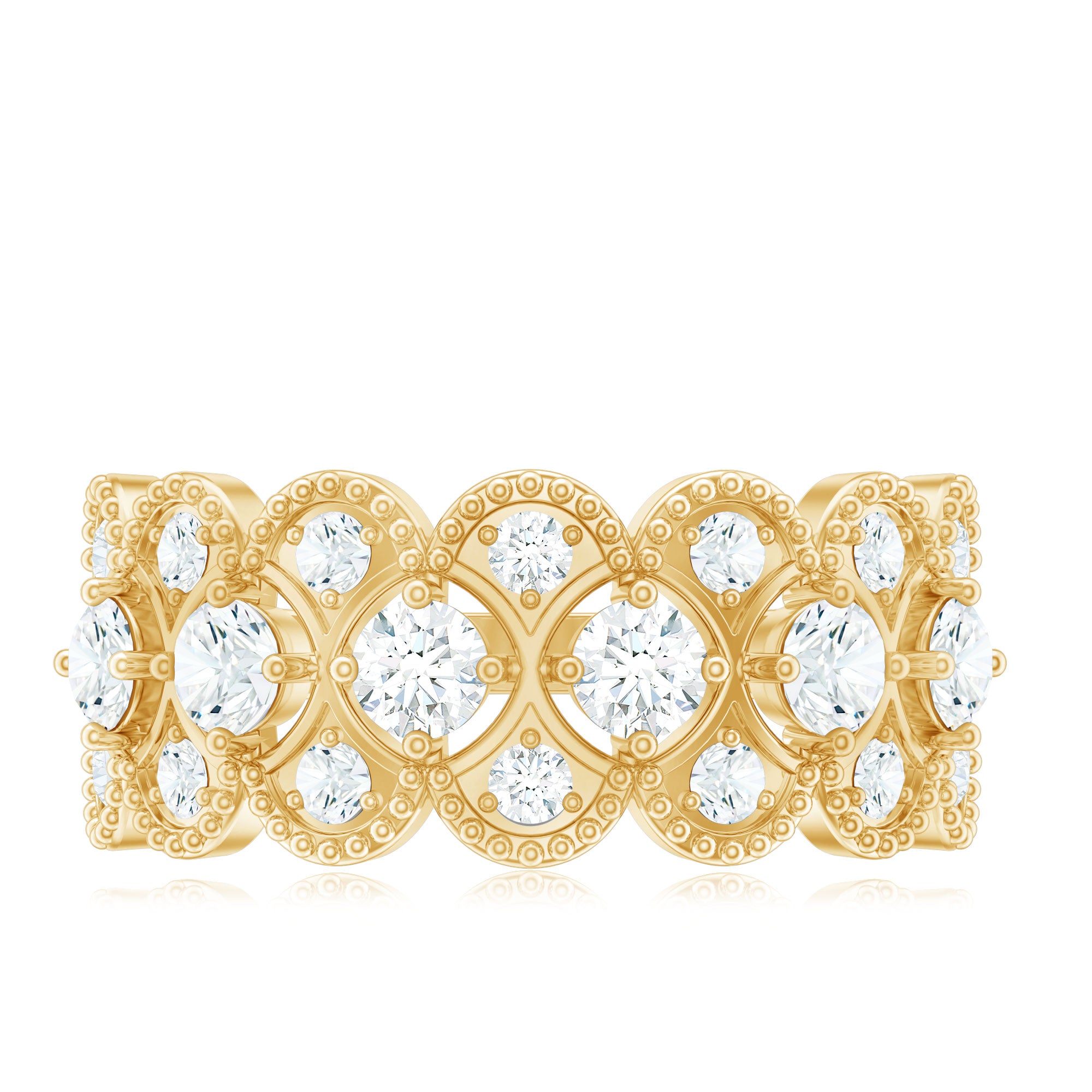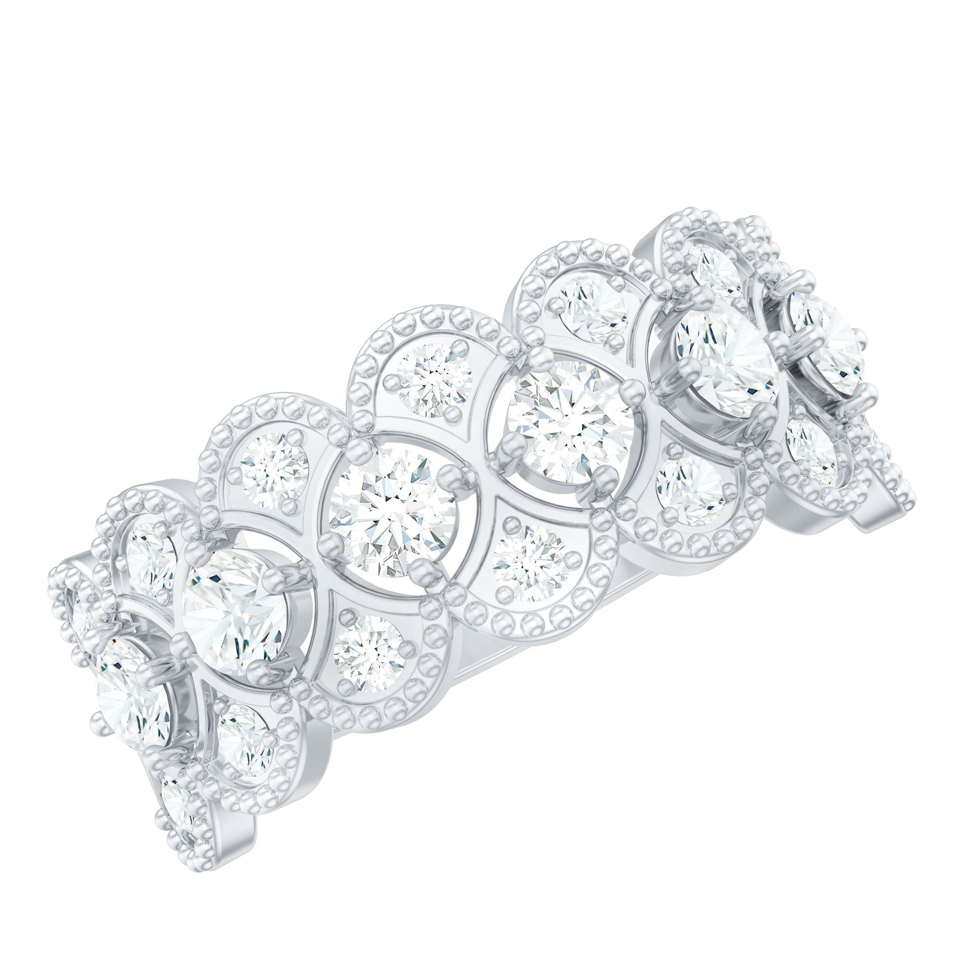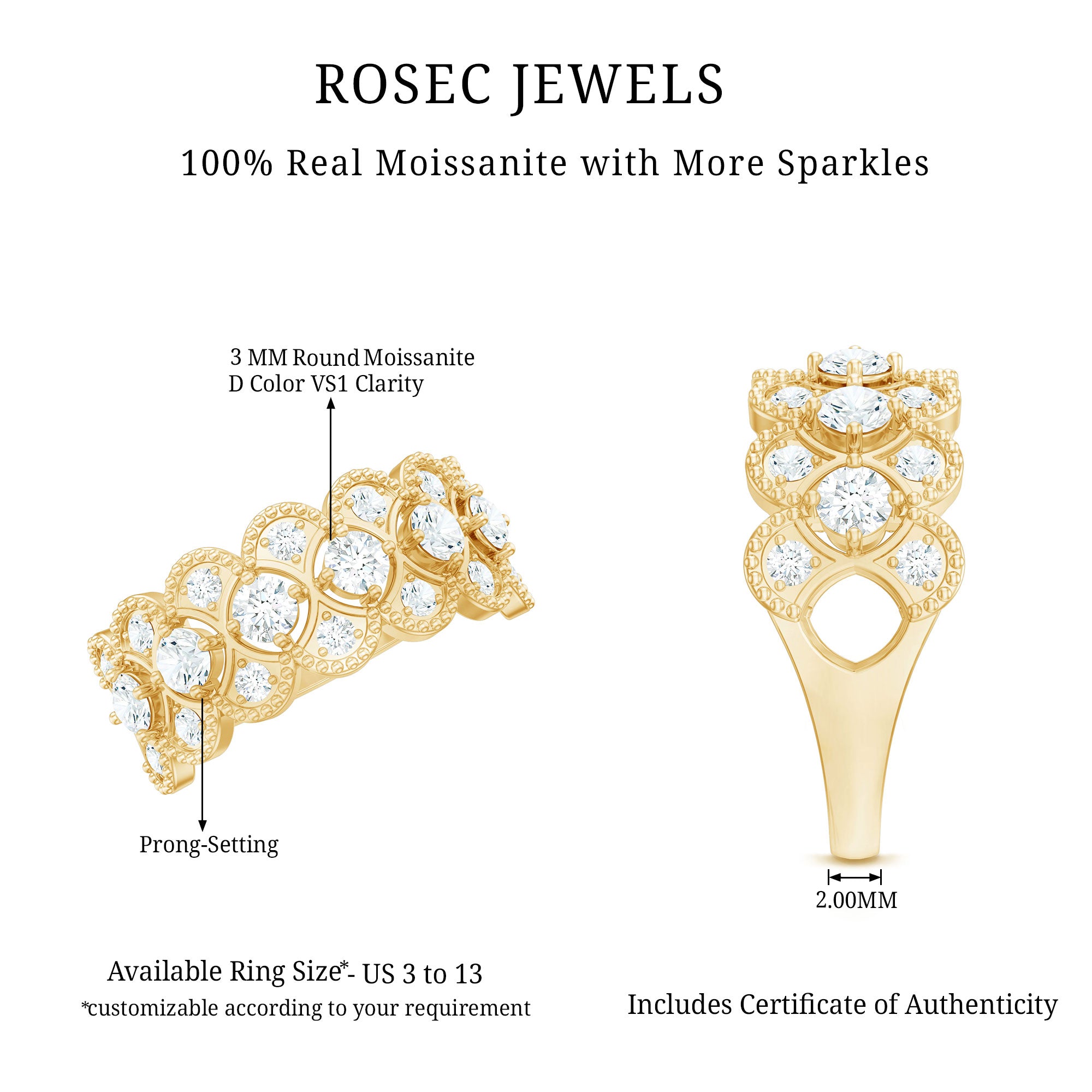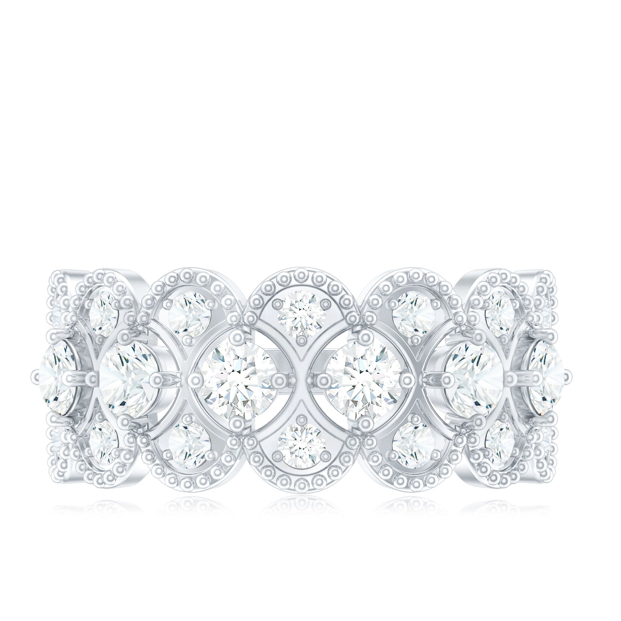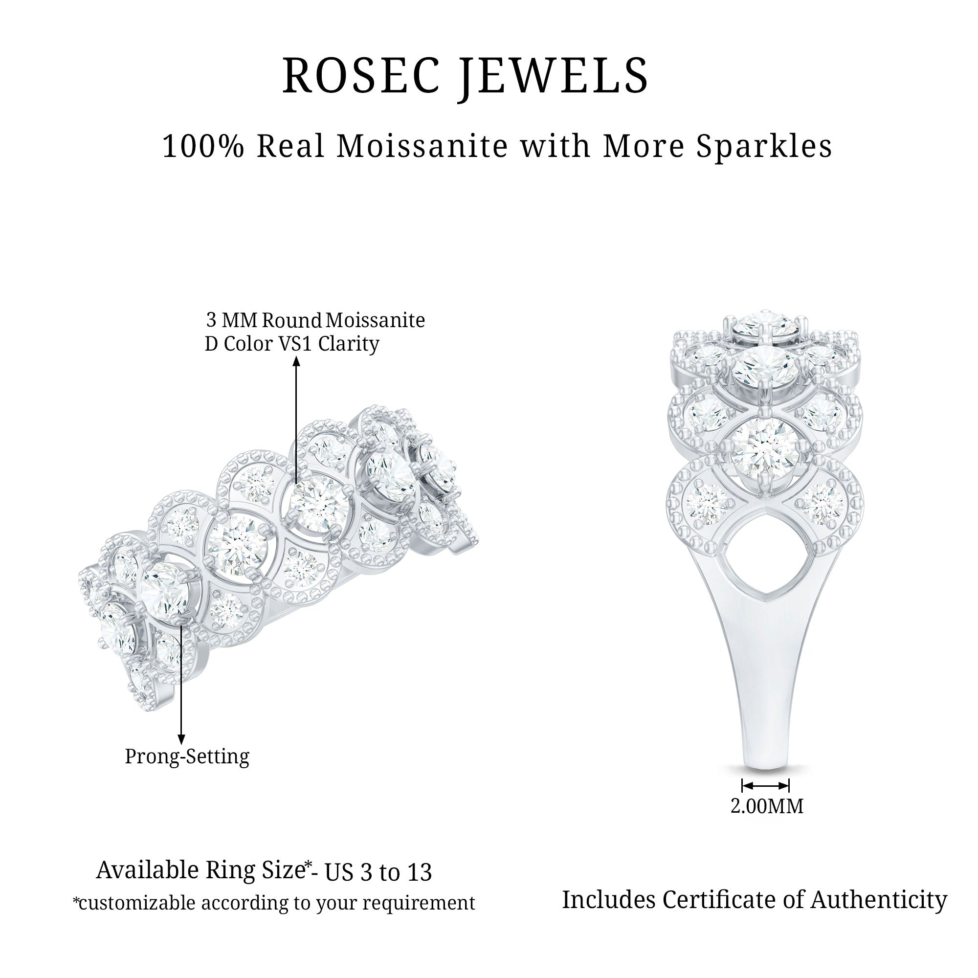 This Moissanite Wedding Band is a celebration of detail, artistry, and radiant beauty. Designed with a creative, eye-catching pattern, it features round cut moissanite stones nestled in a repeating loop design that circles the finger in a half eternity style. The intricate openwork gives the ring a classy charm, while the delicate beaded edges enhance its vintage-inspired feel with a touch of romantic flair. Each D-VS1 quality moissanite is precisely prong set to maximize brilliance, capturing light with every movement. The continuous pattern symbolizes everlasting love, making this Designer Eternity Band an ideal choice for weddings, anniversaries, or milestone celebrations. This is not just a typical eternity band, it is for someone who appreciates thoughtful design and wants something a little more unique. Whether worn on its own or paired with other jewelry pieces, this Wedding Anniversary Band adds charm and sophistication to any look. Its wide band ensures a comfortable fit while making a bold style statement. The craftsmanship is evident in every detail, from the smooth finish to the secure setting of each stone. This Moissanite Half Eternity Band blends vintage allure with modern shine, perfect for those who love jewelry that tells a story and feels special every time its worn.