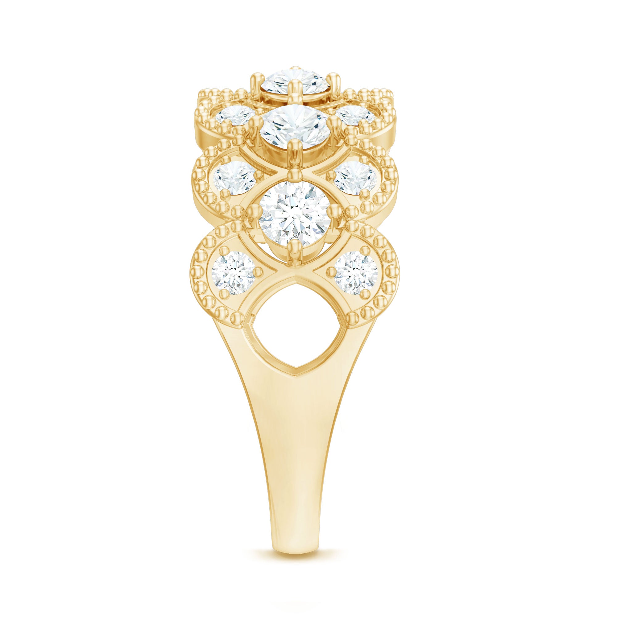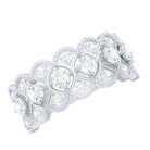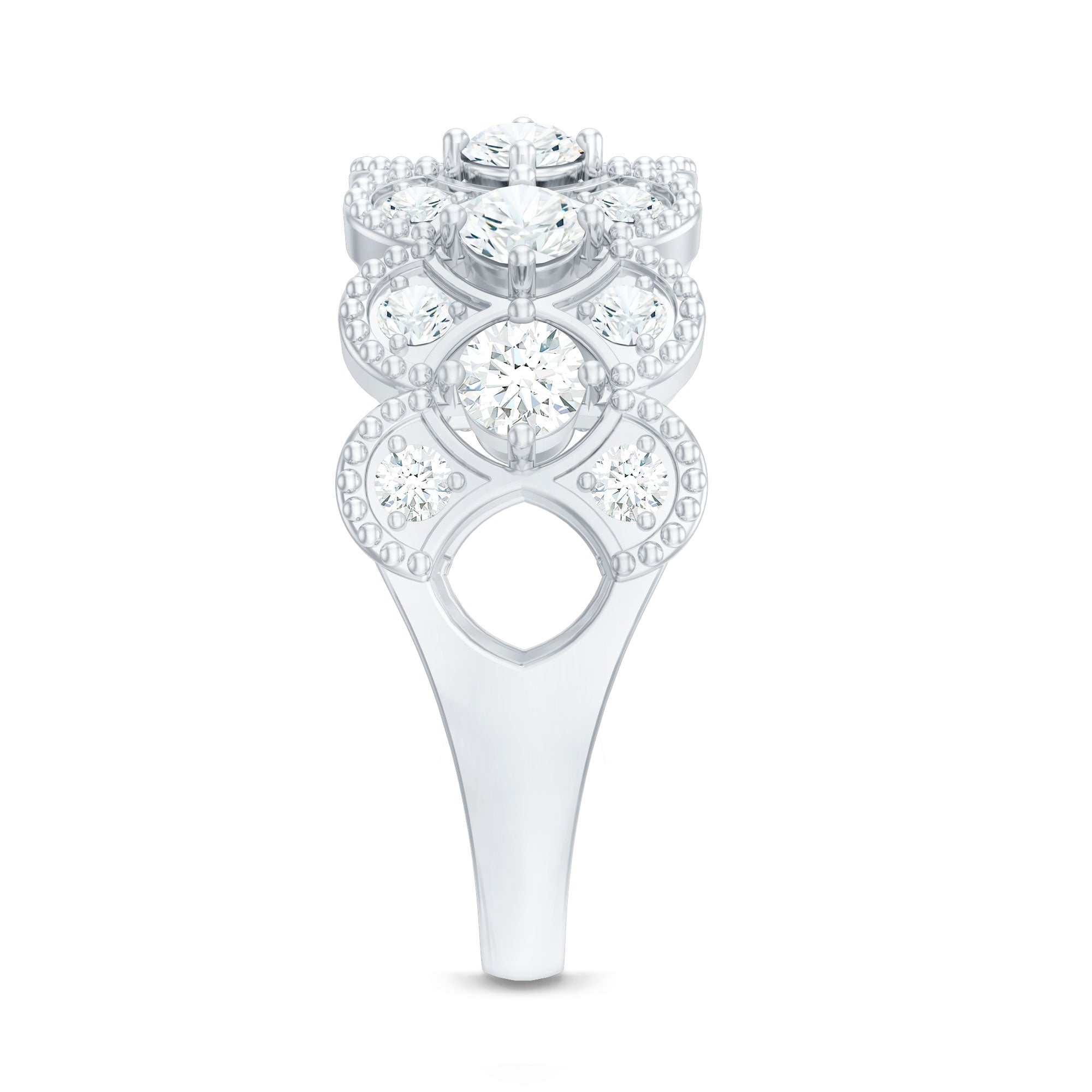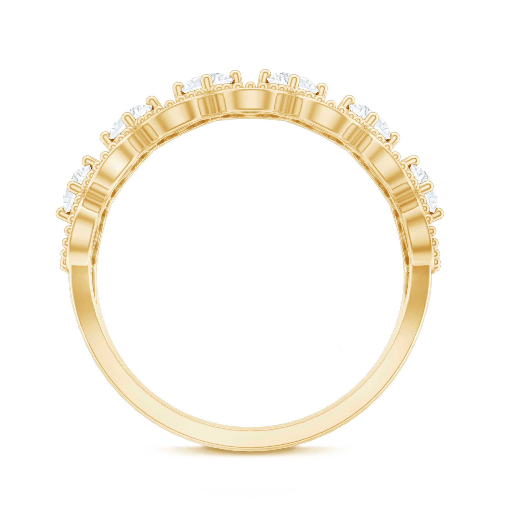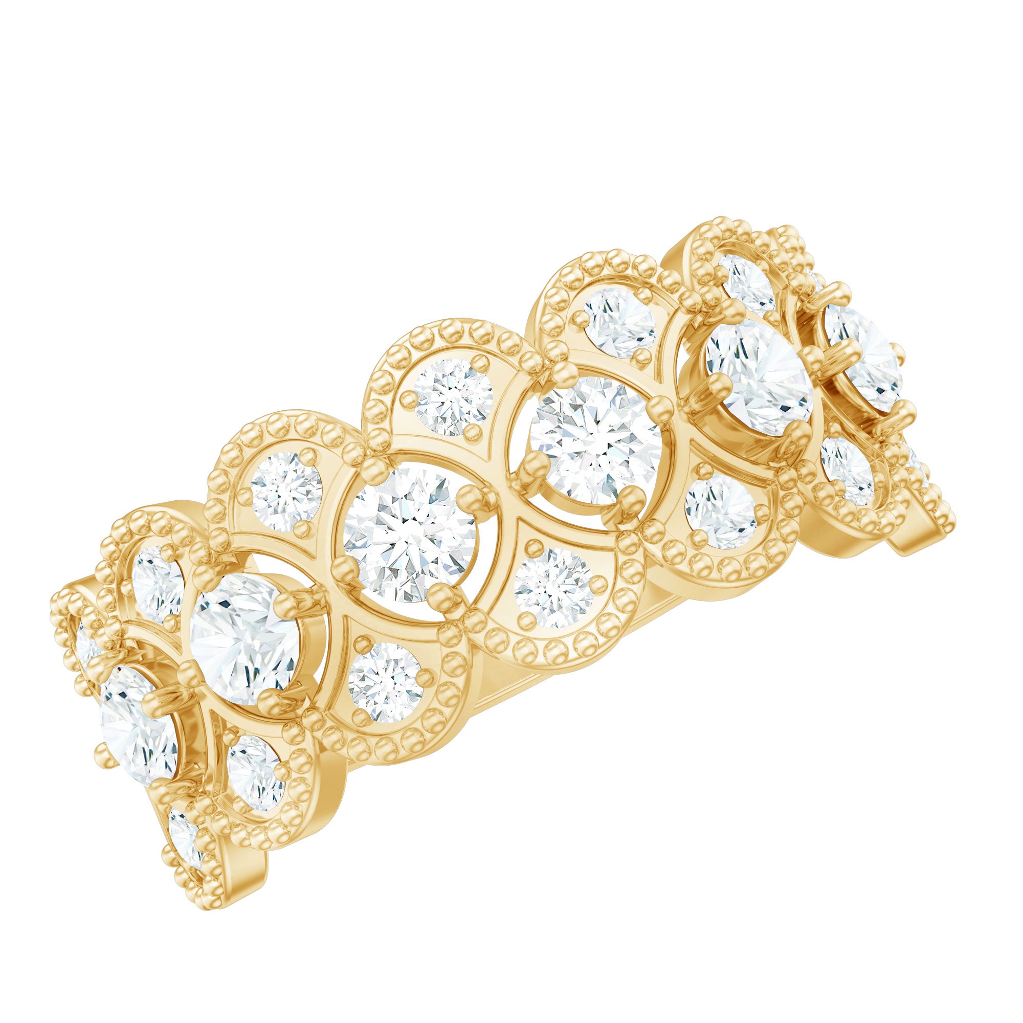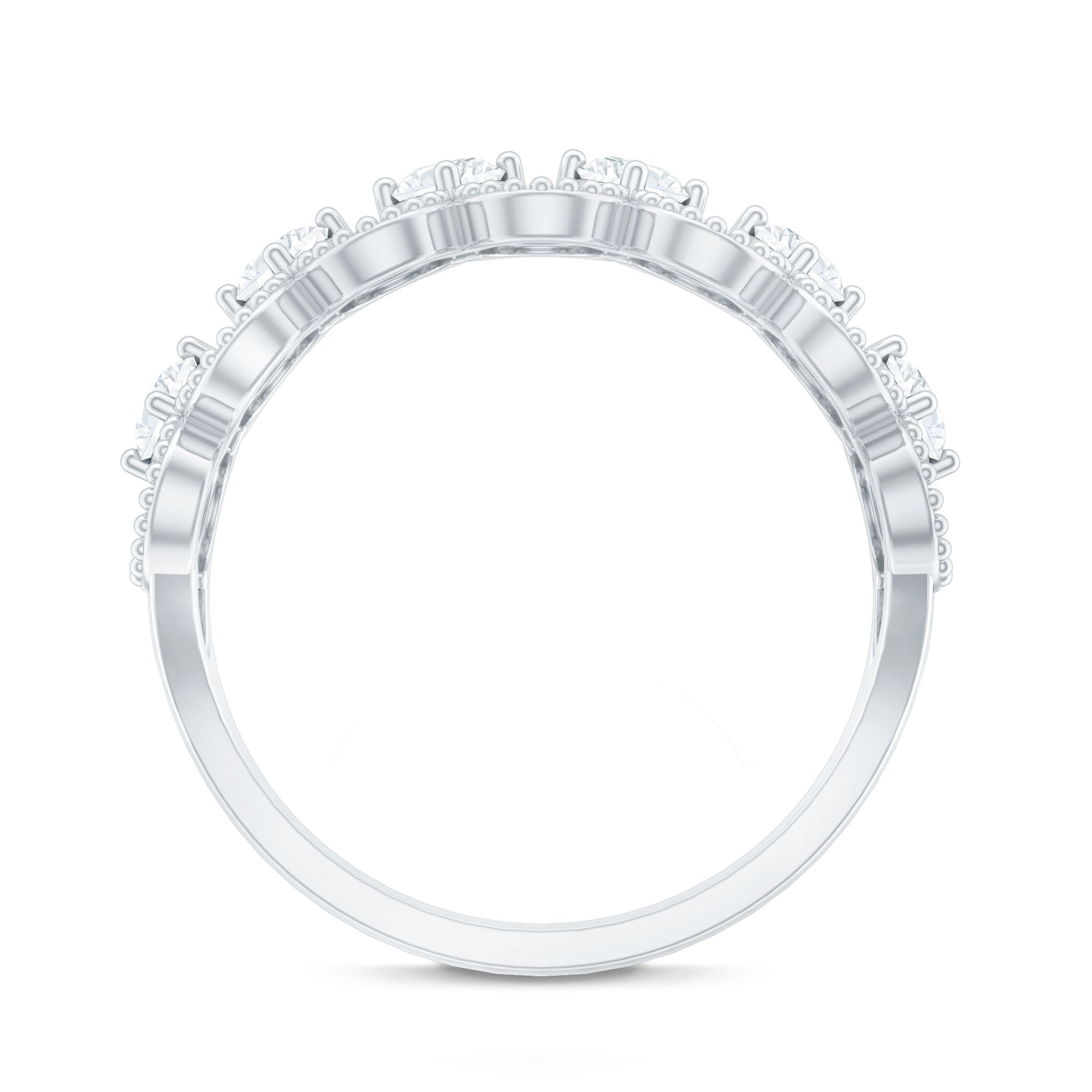 This Moissanite Wedding Band is a celebration of detail, artistry, and radiant beauty. Designed with a creative, eye-catching pattern, it features round cut moissanite stones nestled in a repeating loop design that circles the finger in a half eternity style. The intricate openwork gives the ring a classy charm, while the delicate beaded edges enhance its vintage-inspired feel with a touch of romantic flair. Each D-VS1 quality moissanite is precisely prong set to maximize brilliance, capturing light with every movement. The continuous pattern symbolizes everlasting love, making this Designer Eternity Band an ideal choice for weddings, anniversaries, or milestone celebrations. This is not just a typical eternity band, it is for someone who appreciates thoughtful design and wants something a little more unique. Whether worn on its own or paired with other jewelry pieces, this Wedding Anniversary Band adds charm and sophistication to any look. Its wide band ensures a comfortable fit while making a bold style statement. The craftsmanship is evident in every detail, from the smooth finish to the secure setting of each stone. This Moissanite Half Eternity Band blends vintage allure with modern shine, perfect for those who love jewelry that tells a story and feels special every time its worn.