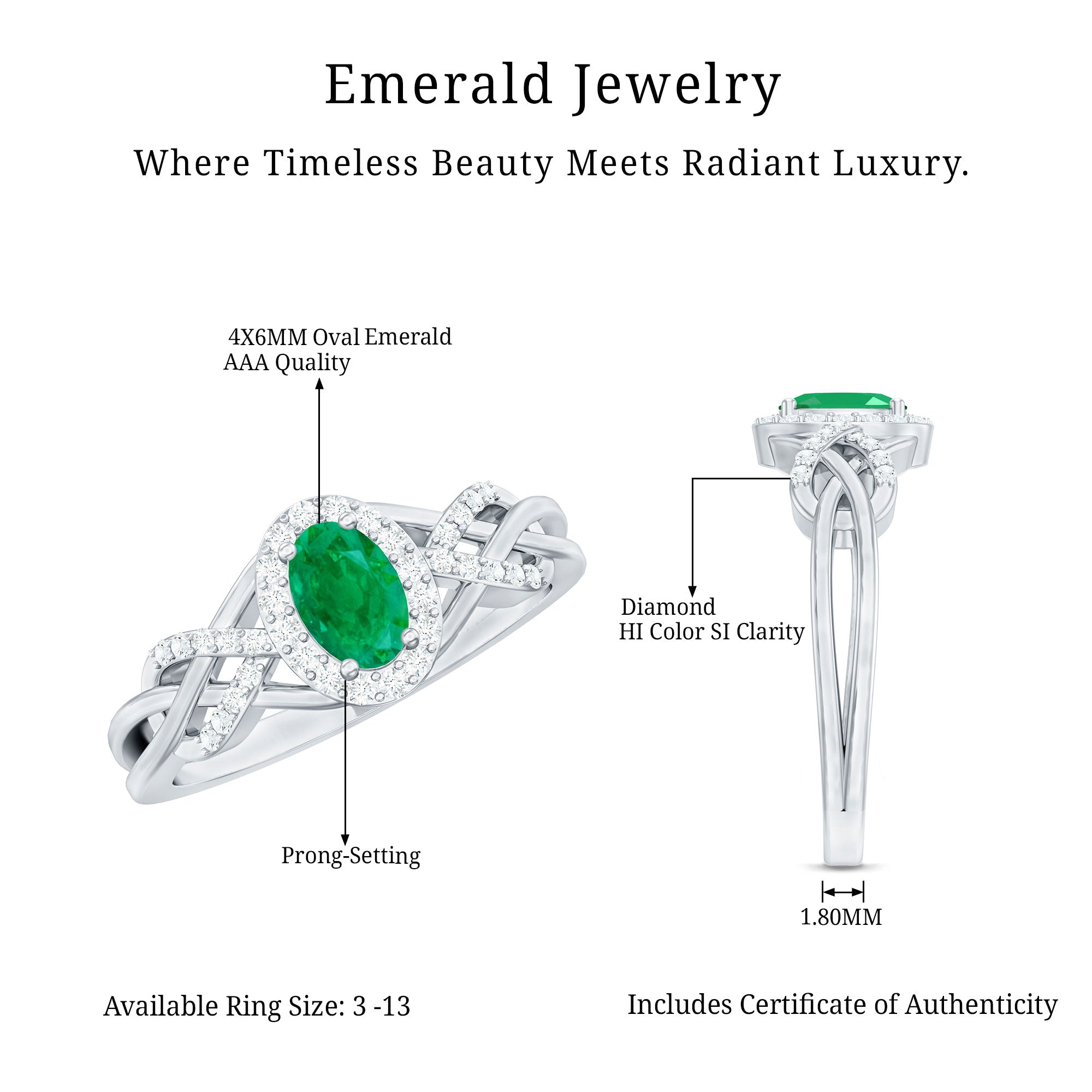 Dare to fall in love all over again with this breathtaking Designer Engagement Ring, a piece where elegance meets artistry. This Fine Engagement Ring features a 4X6 mm Oval Shape Emerald set in Prong Setting, framed by a dazzling Diamond Halo that dances with light from every angle. The band steals the show with a graceful Criss Cross design, adorned with shimmering Diamond stones that wrap around the finger like an embrace you will never want to let go of. This Criss Cross Ring is the kind of ring that catches the light and captures hearts. Handcrafted with care and available in a full range of sizes to ensure a flawless fit, this Oval Engagement Ring with Emerald is a dream come true, presented in a signature jewelry box, ready to mark a forever moment. Whether it is a proposal, a promise or a celebration of everlasting love, this Emerald Diamond Engagement Ring is a masterpiece made for your most unforgettable chapter yet.