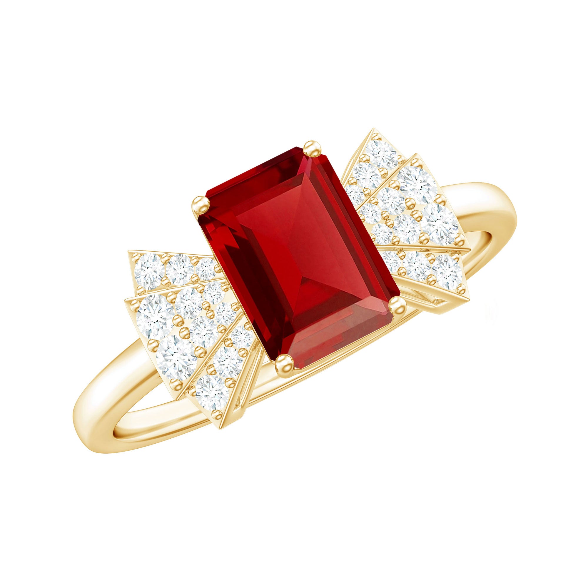 Designer Emerald Cut Lab Grown Ruby Solitaire Ring with Diamond