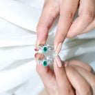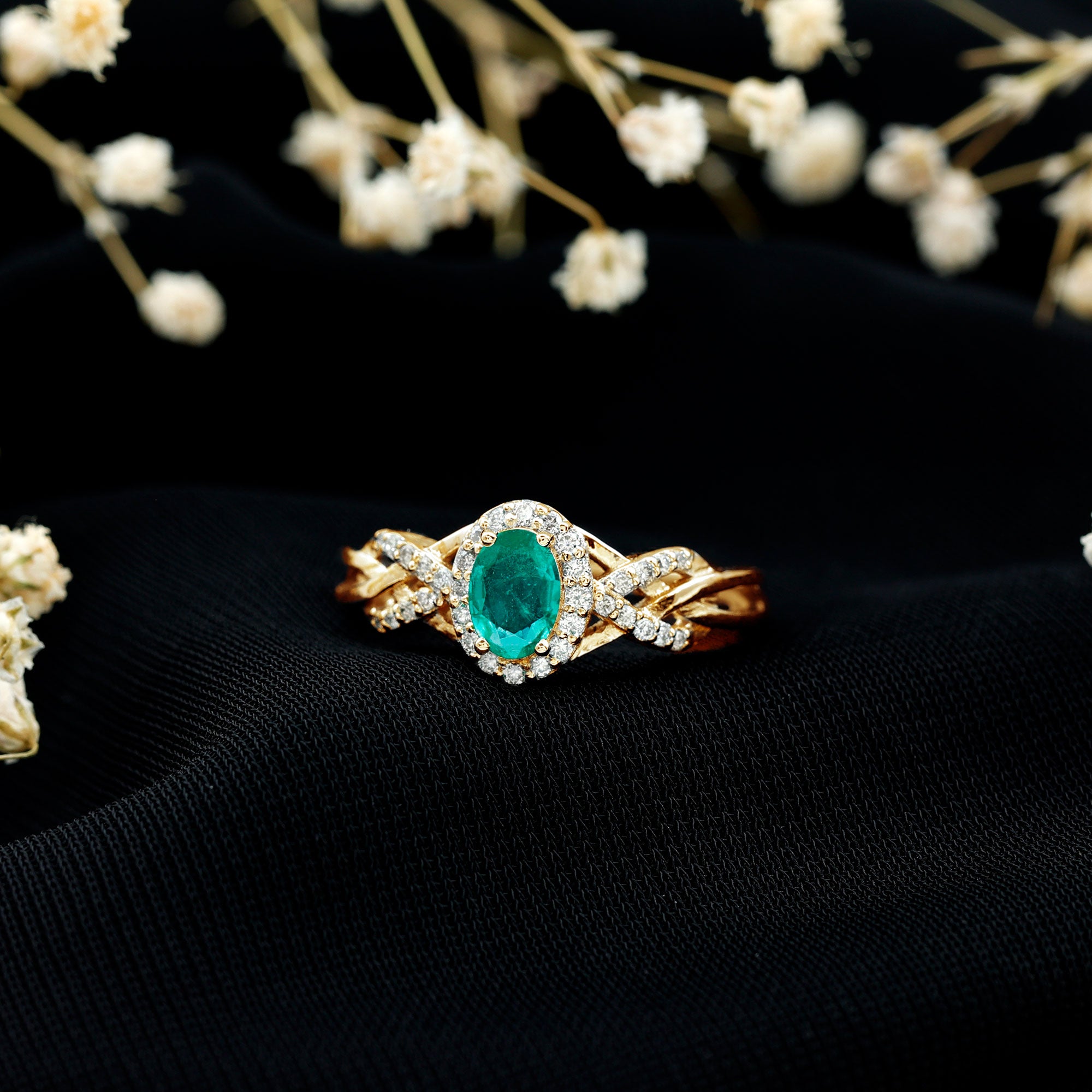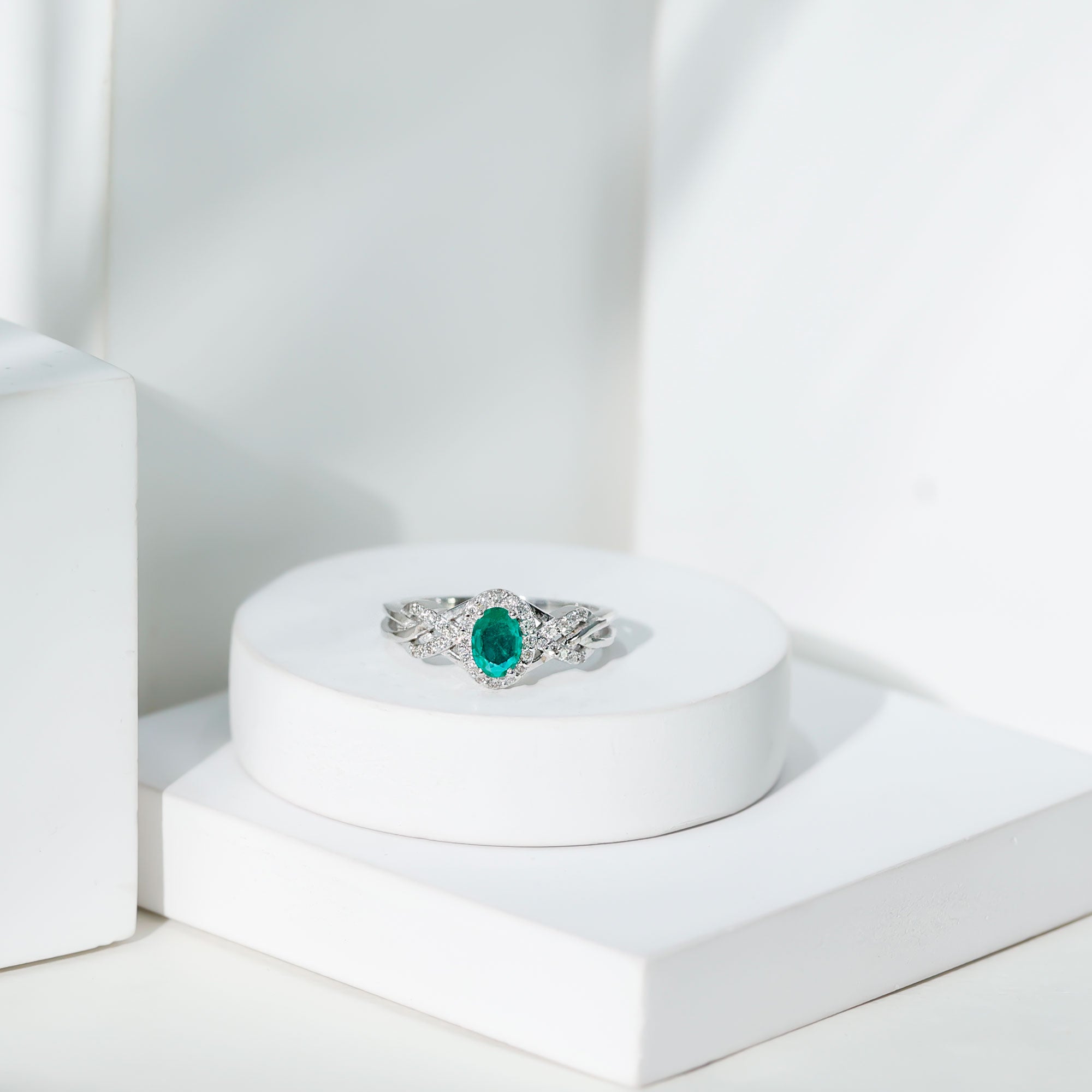 Dare to fall in love all over again with this breathtaking Designer Engagement Ring, a piece where elegance meets artistry. This Fine Engagement Ring features a 4X6 mm Oval Shape Emerald set in Prong Setting, framed by a dazzling Diamond Halo that dances with light from every angle. The band steals the show with a graceful Criss Cross design, adorned with shimmering Diamond stones that wrap around the finger like an embrace you will never want to let go of. This Criss Cross Ring is the kind of ring that catches the light and captures hearts. Handcrafted with care and available in a full range of sizes to ensure a flawless fit, this Oval Engagement Ring with Emerald is a dream come true, presented in a signature jewelry box, ready to mark a forever moment. Whether it is a proposal, a promise or a celebration of everlasting love, this Emerald Diamond Engagement Ring is a masterpiece made for your most unforgettable chapter yet.