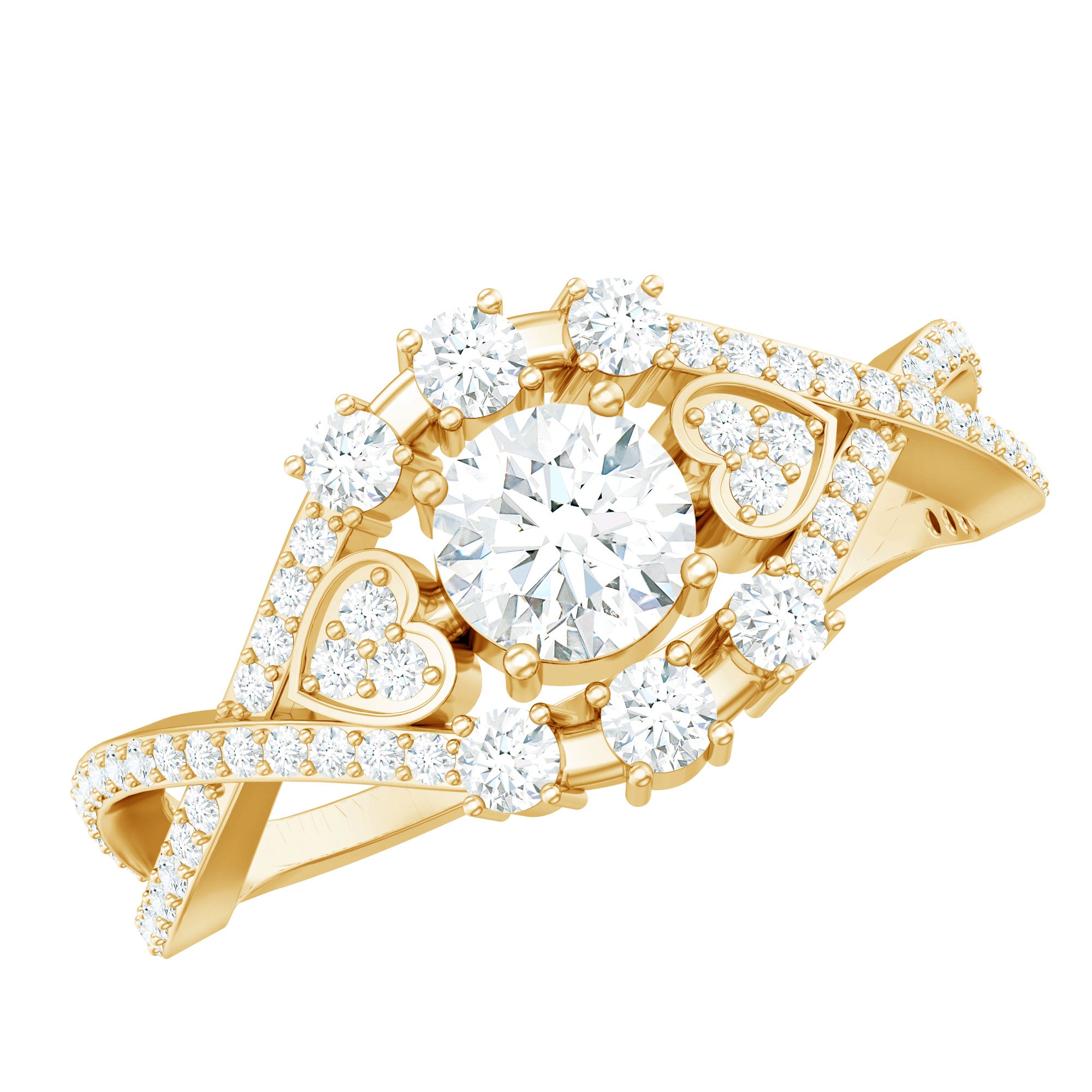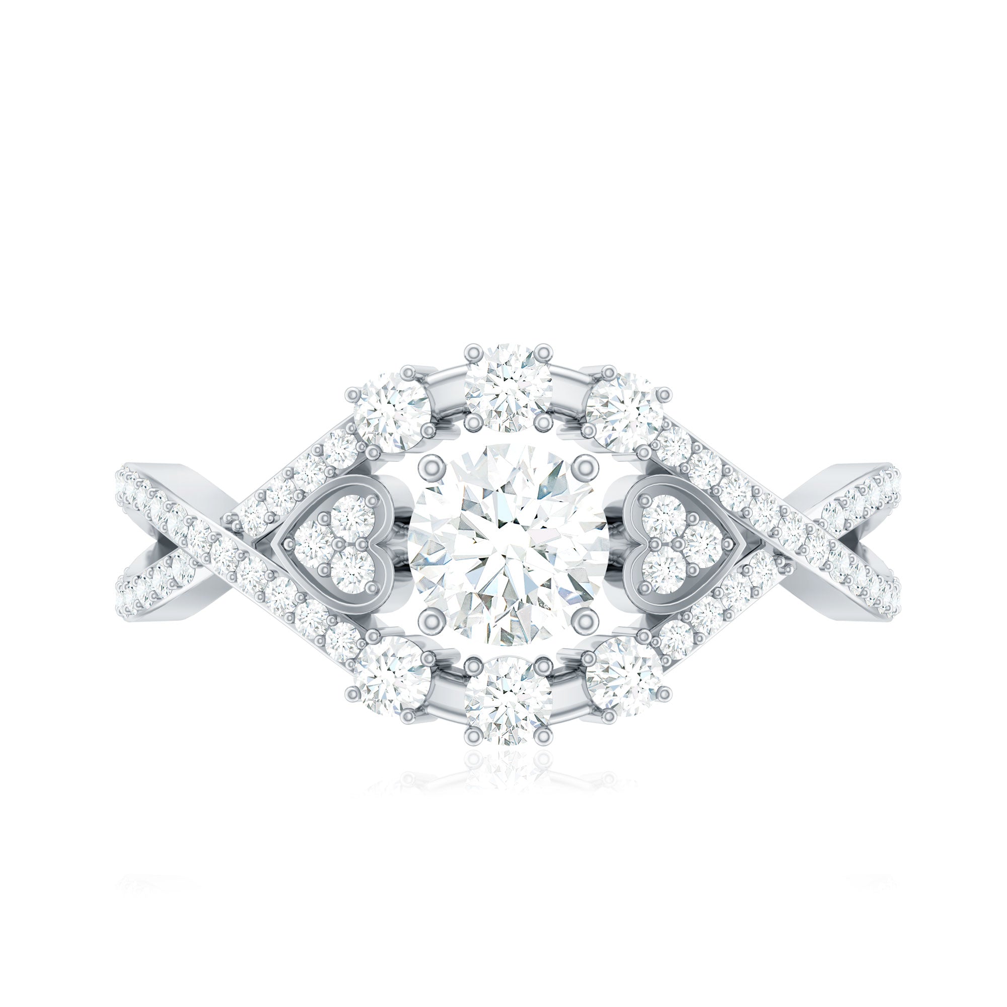 For the one who dares to shine differently. This Designer Moissanite Engagement Ring is a true work of art, where modern glamour meets timeless romance. At its heart lies a 5 MM round cut D-VS1 quality moissanite, expertly set in prong setting to capture maximum brilliance. The sparkling center stone is gracefully framed by a dazzling array of smaller round moissanites, forming a halo that shows its fiery sparkle. What truly sets this Unique Engagement Ring apart is its crossover band design, lined with intricately set moissanites, an elegant symbol of two paths crossing and becoming one. The halo features delicate heart motifs adorned with moissanites, adding a romantic and whimsical touch that makes this Criss Cross Engagement Ring both sentimental and stunning. Whether you are proposing, celebrating a milestone, or making a bold fashion statement, this Moissanite Ring offers versatility and unforgettable presence. More than just jewelry, this Statement Engagement Ring is a symbol of everlasting beauty and passion. It comes with a jewelry box and a certificate of authenticity, ensuring that your moment is as perfect as the ring itself.