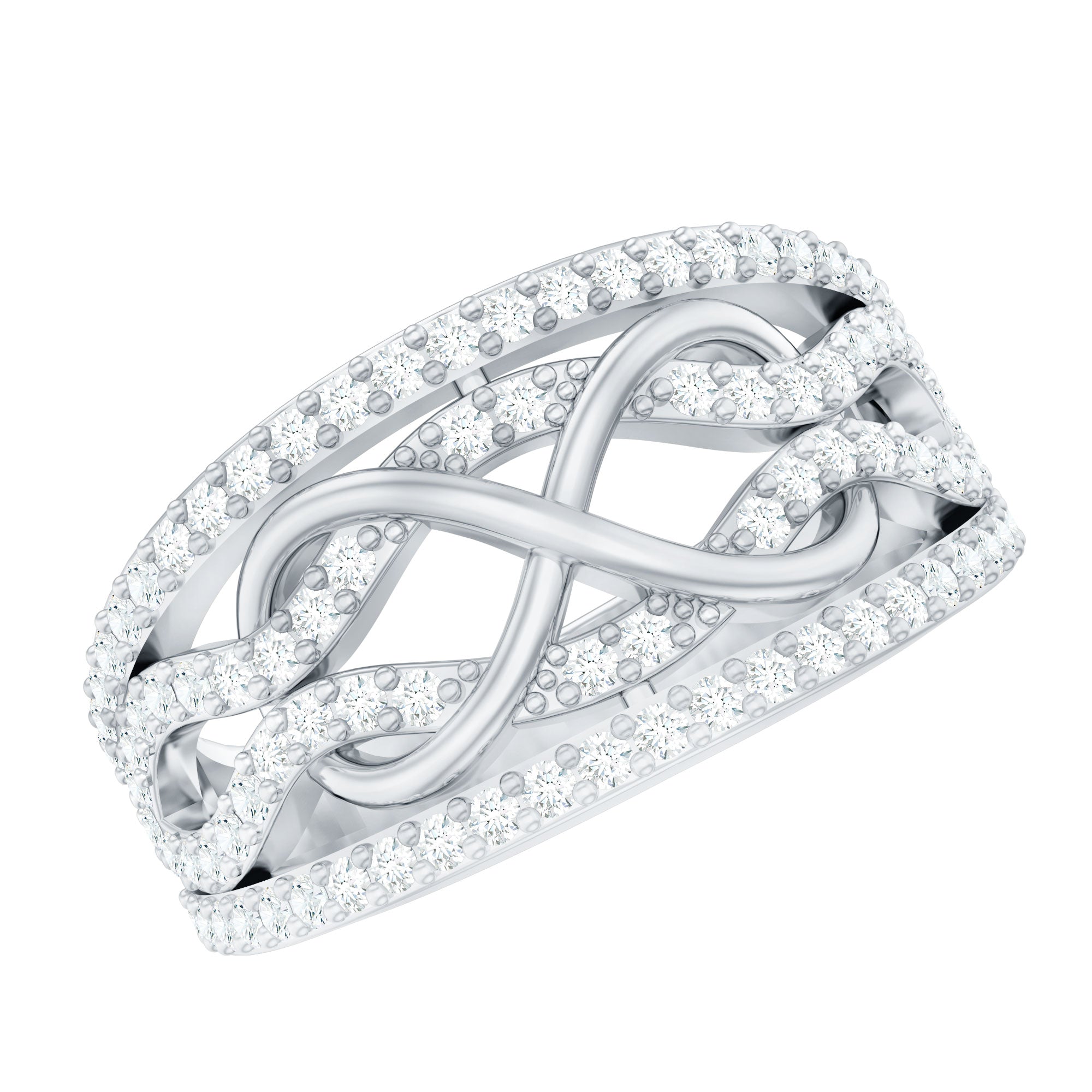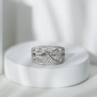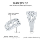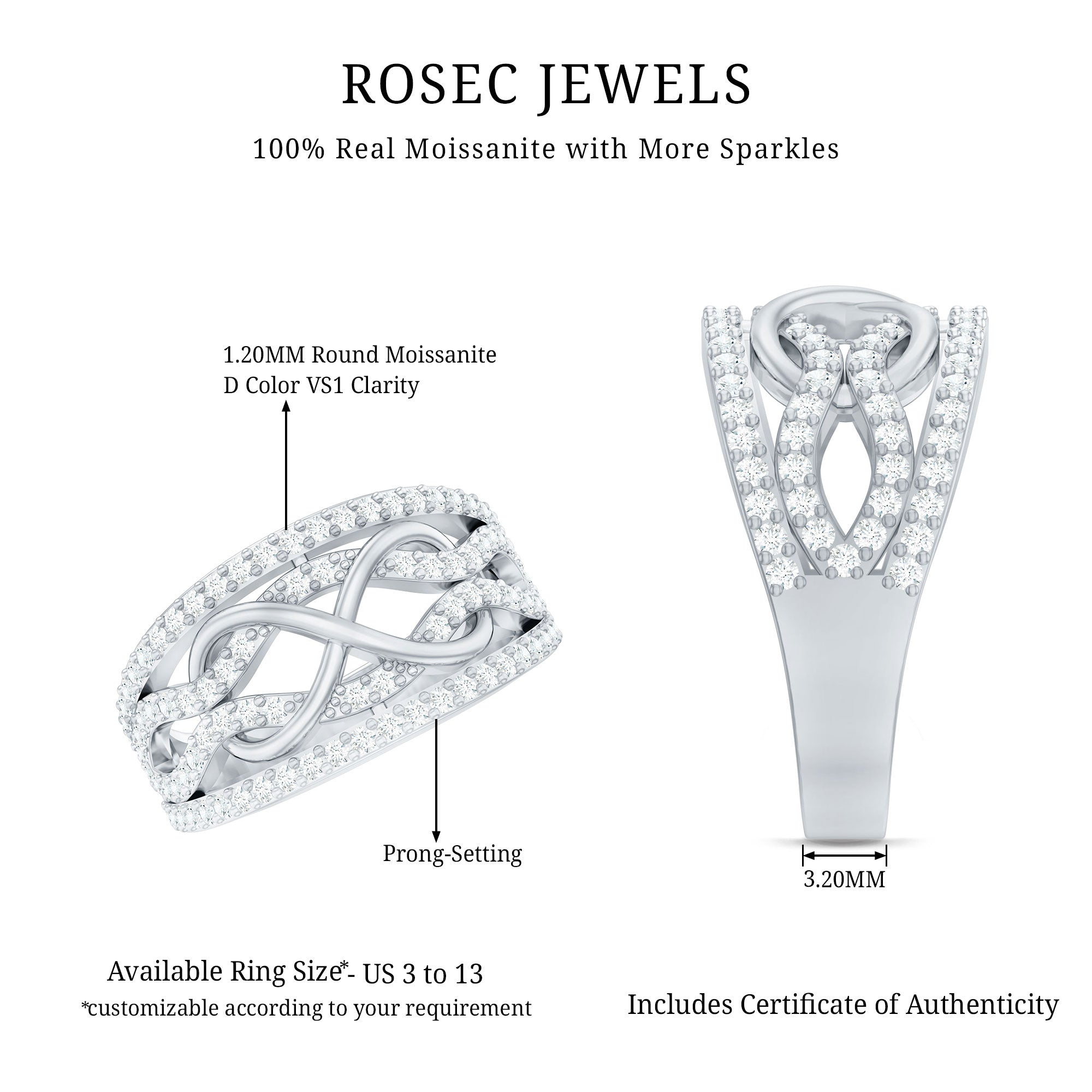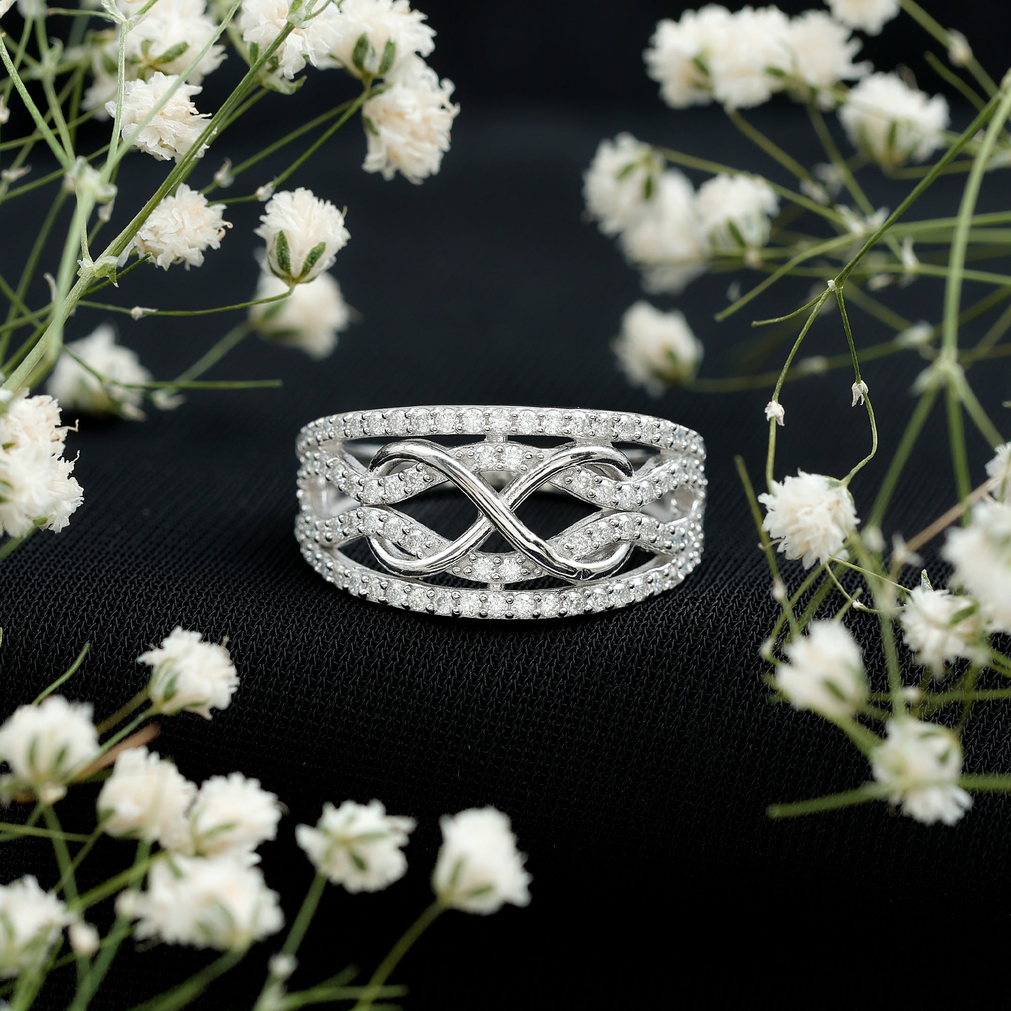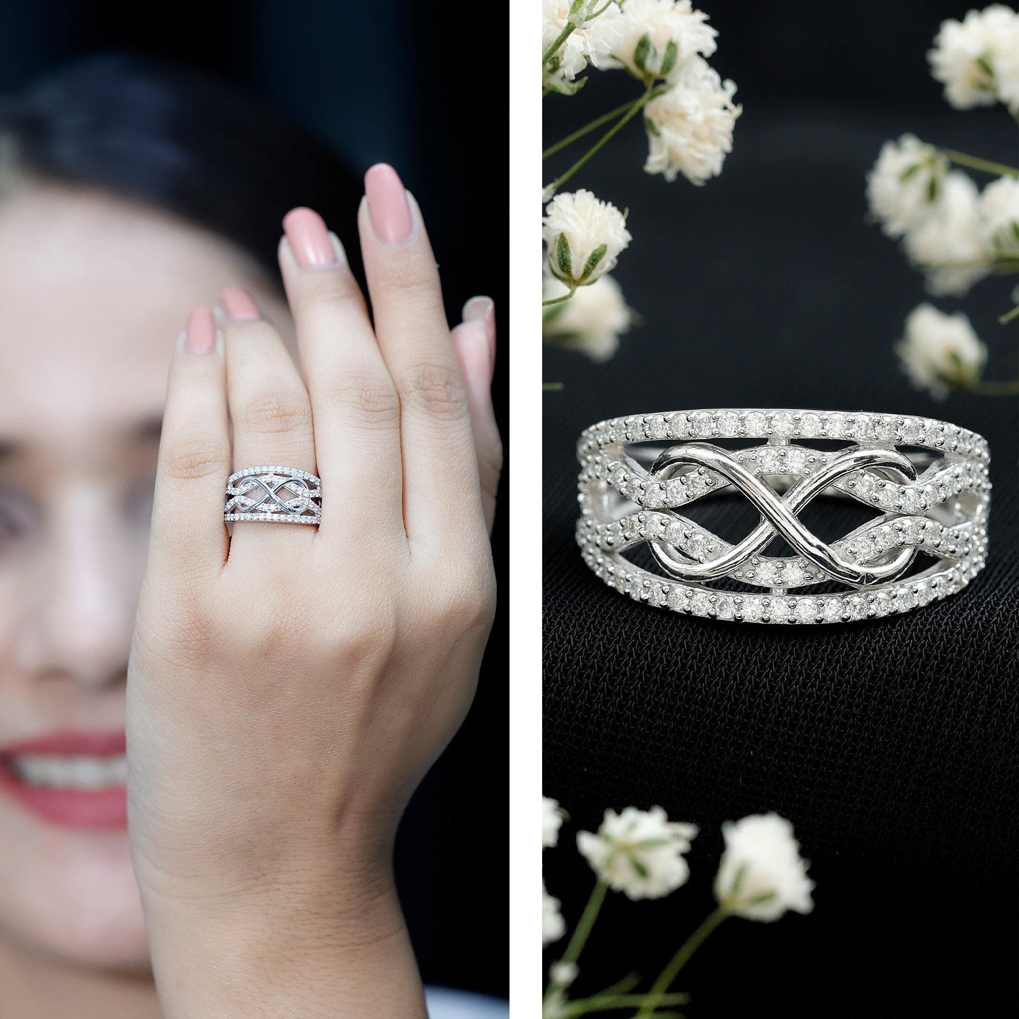 A stunning design with twisting and overlapping elements that exude elegance. Crafted from 14k white gold plated silver and adorned with sparkling white Moissanite stones, this Infinity Ring showcases a breathtaking open design that she will absolutely love. Capture the attention of everyone around you with this piece from Rosec Jewels. Its eye-catching design is a testament to exquisite craftsmanship. The Infinity Band Ring, with Round Moissanite set in Prong Setting throughout the band, is perfect for adorning her finger. The central Infinity symbol makes it a unique jewelry piece. Make every moment memorable with our Moissanite Anniversary Band, a true emblem of your love and commitment. Pair it with any outfit to effortlessly look your best. The classic twists and turns of the design create a gorgeous, sophisticated appearance, making this Forever Symbol Ring an ideal accessory for weddings, engagements or any special event. This chic ring is a fantastic gift for Valentines Day or anniversaries, appealing to women of all ages who love timeless and stylish jewelry. It is both affordable and elegant, perfect for those looking for beautiful jewelry without overspending.