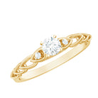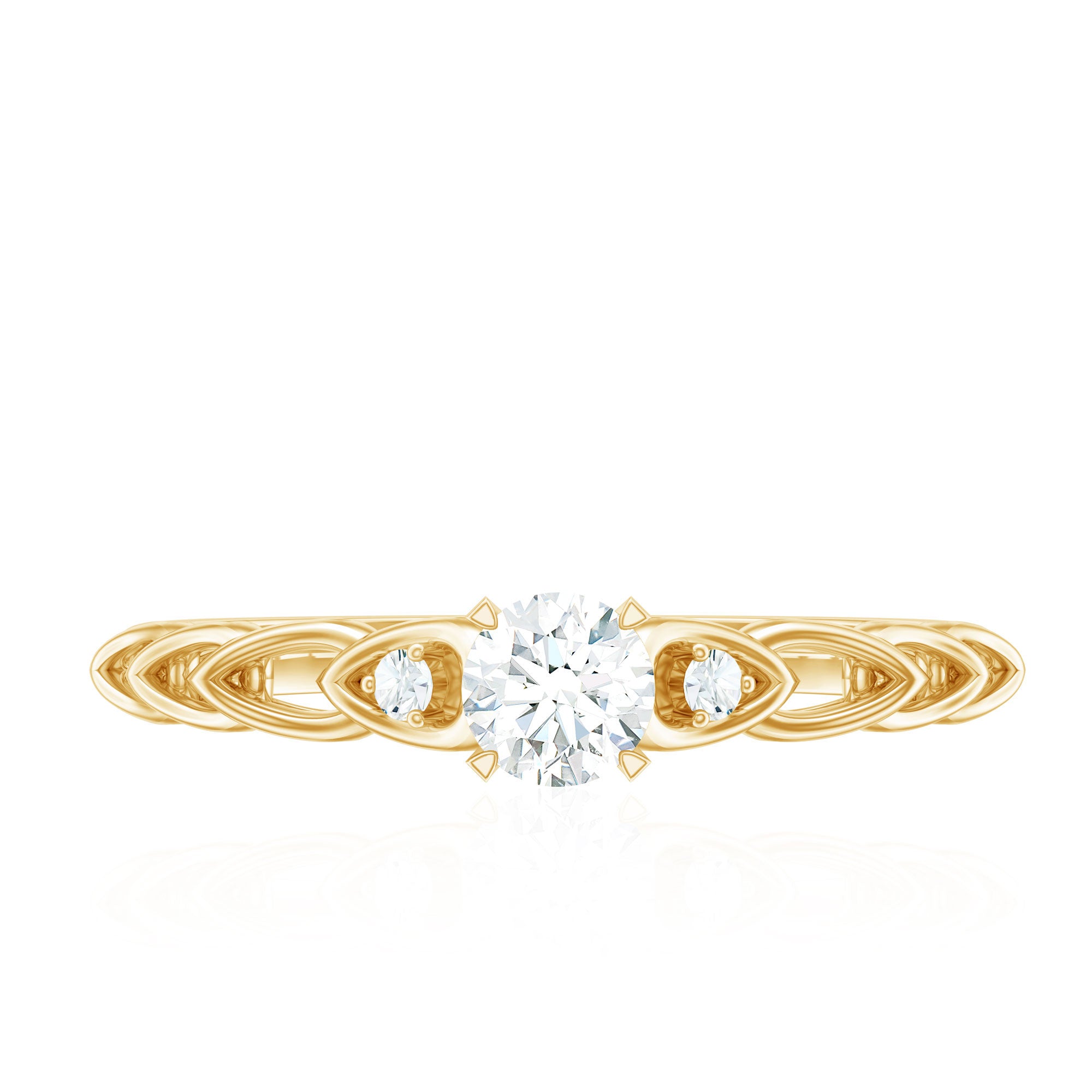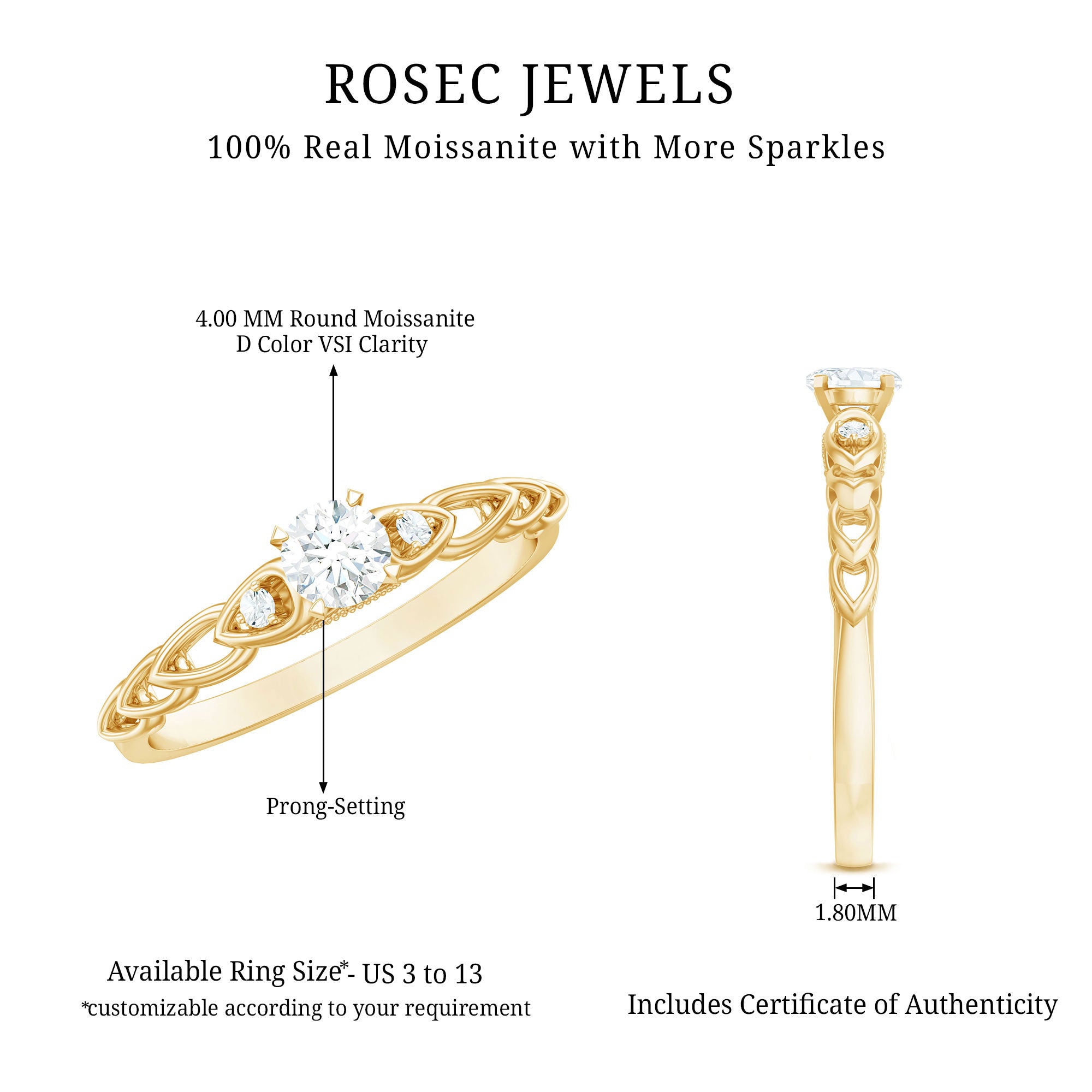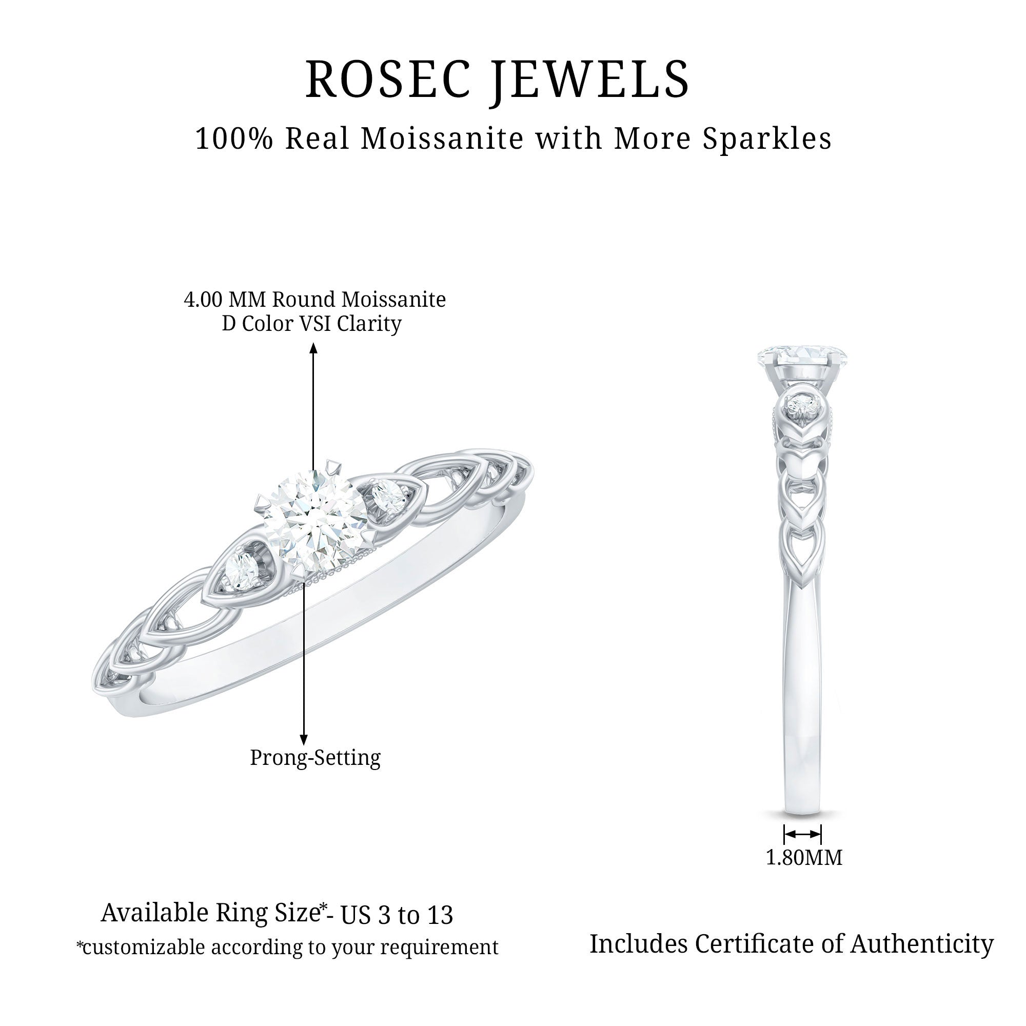 This is not just a piece of jewelry, it is the beginning of all the us moments you will treasure for a lifetime. At the center of this Minimalist Promise Ring is a 4 MM round cut moissanite, held in prong setting. On each side, two smaller moissanites add extra shine, creating a graceful look. The most unique feature is the interlocked band, adding a modern twist to a timeless style. The overlapping design gives the Moissanite Promise Ring a sleek, contemporary feel. It is a perfect choice for those who appreciate both classic beauty and modern details. Crafted with D-VS1 quality moissanites, the stones deliver incredible brilliance while being eco-friendly and ethical, ideal for someone who values beauty with purpose. Whether it is for a proposal, an anniversary, or a personal promise, this Designer Ring is made to be cherished. It is a heartfelt way to show your commitment, remind someone how much they mean to you, or mark an important chapter in your relationship. Available in US sizes 3 to 13 and crafted for a comfortable fit, this Round Moissanite Ring arrives in a luxury jewelry box, ready to be gifted and treasured forever.