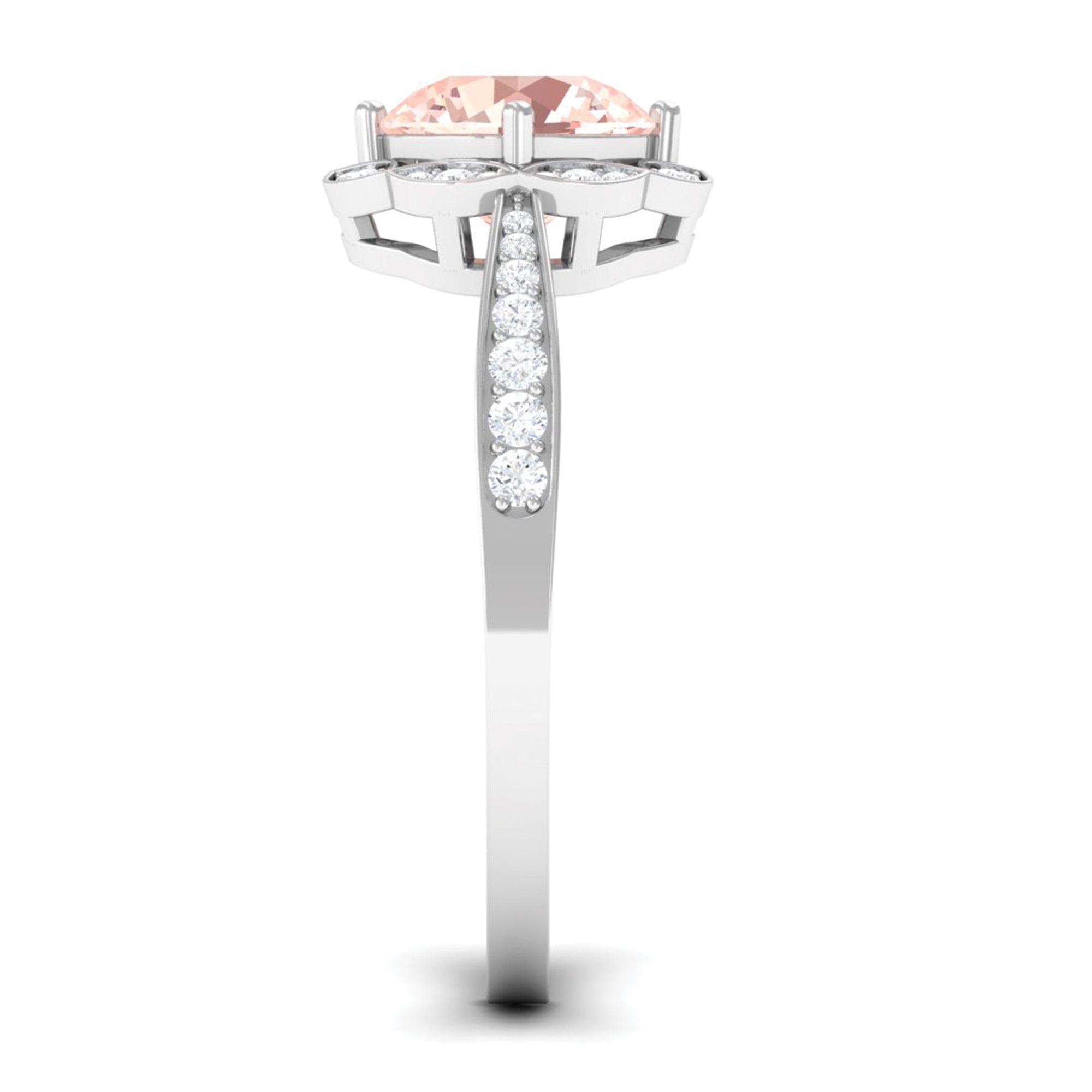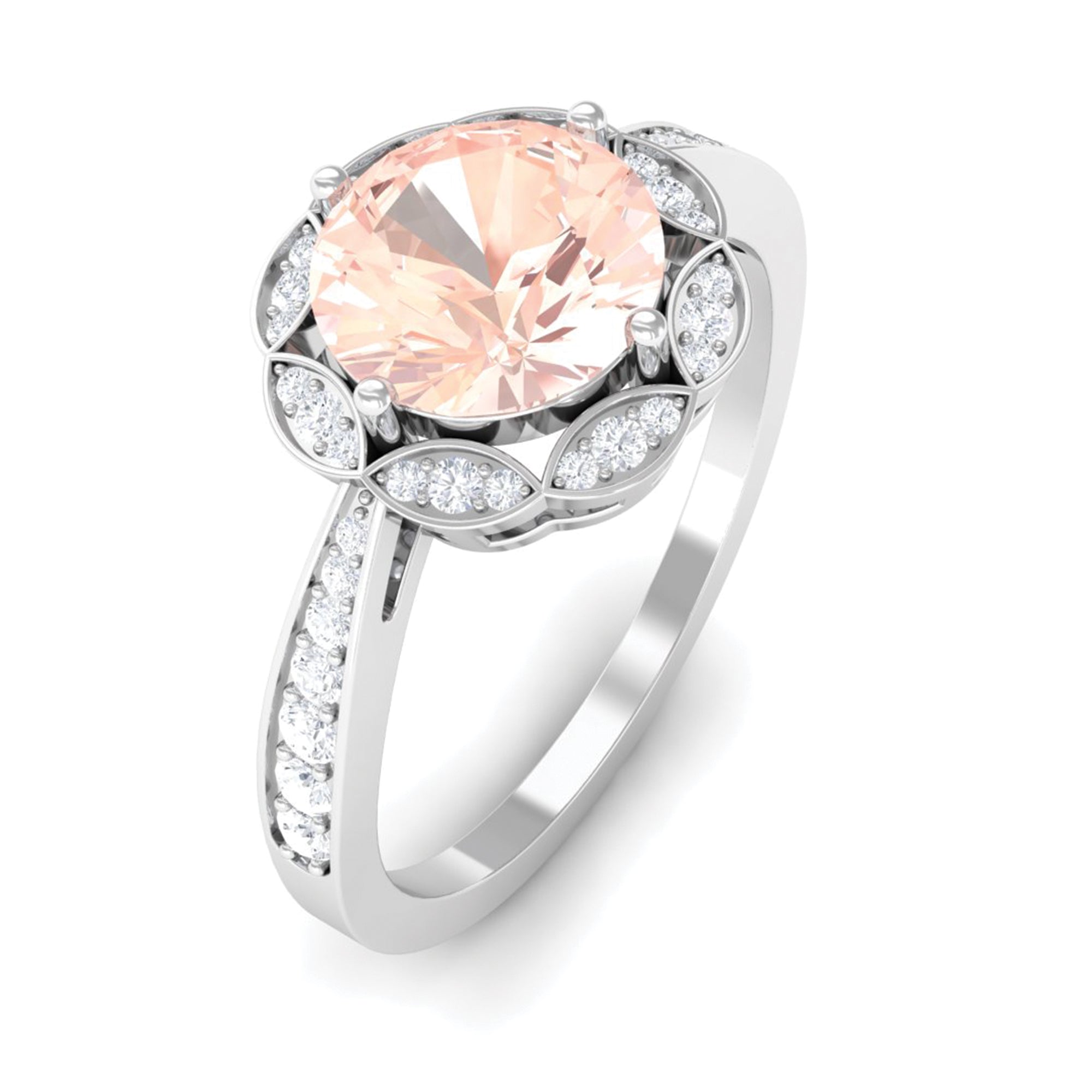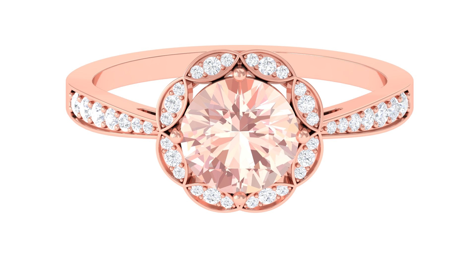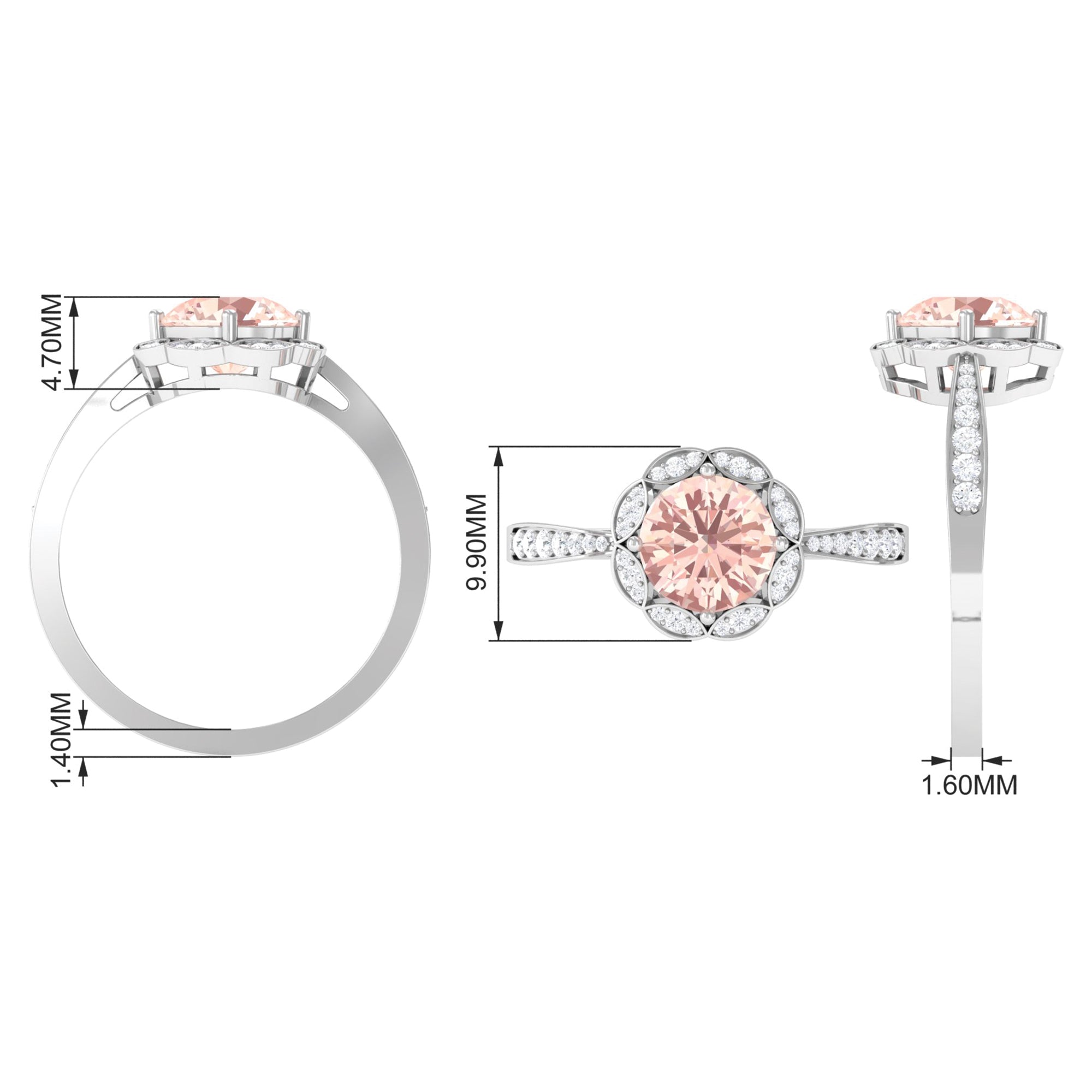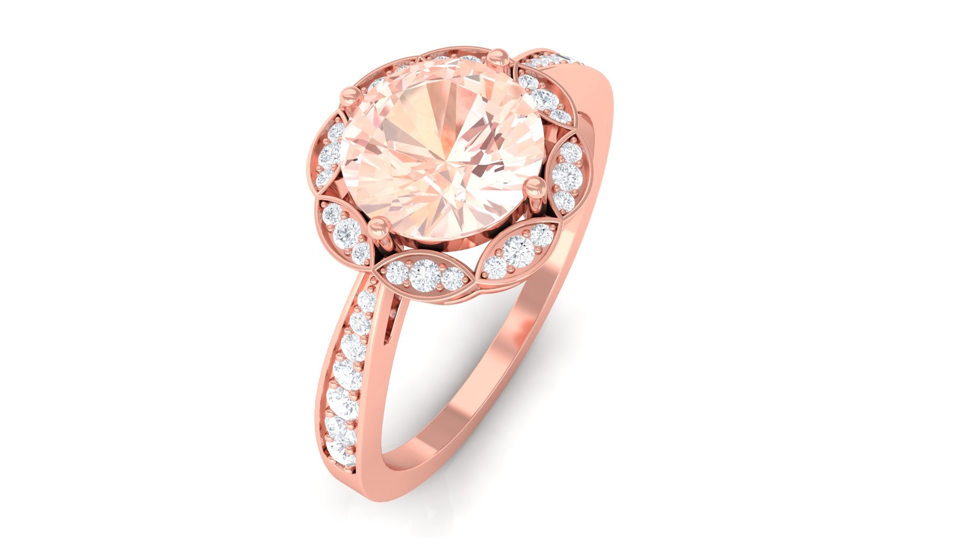 Enveloped by leaf-sequel motifs is a round morganite that mesmerizes with its peach hue in this glitzy halo engagement ring. The centerpiece is held in a prong setting that lends a touch of sophisticated appeal to this morganite ring. Glistening round Diamond adorns the shank for added allure. Wear it as a stand-alone piece for grabbing all the eyeballs.