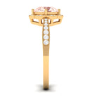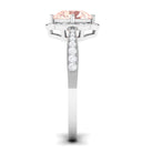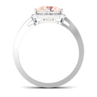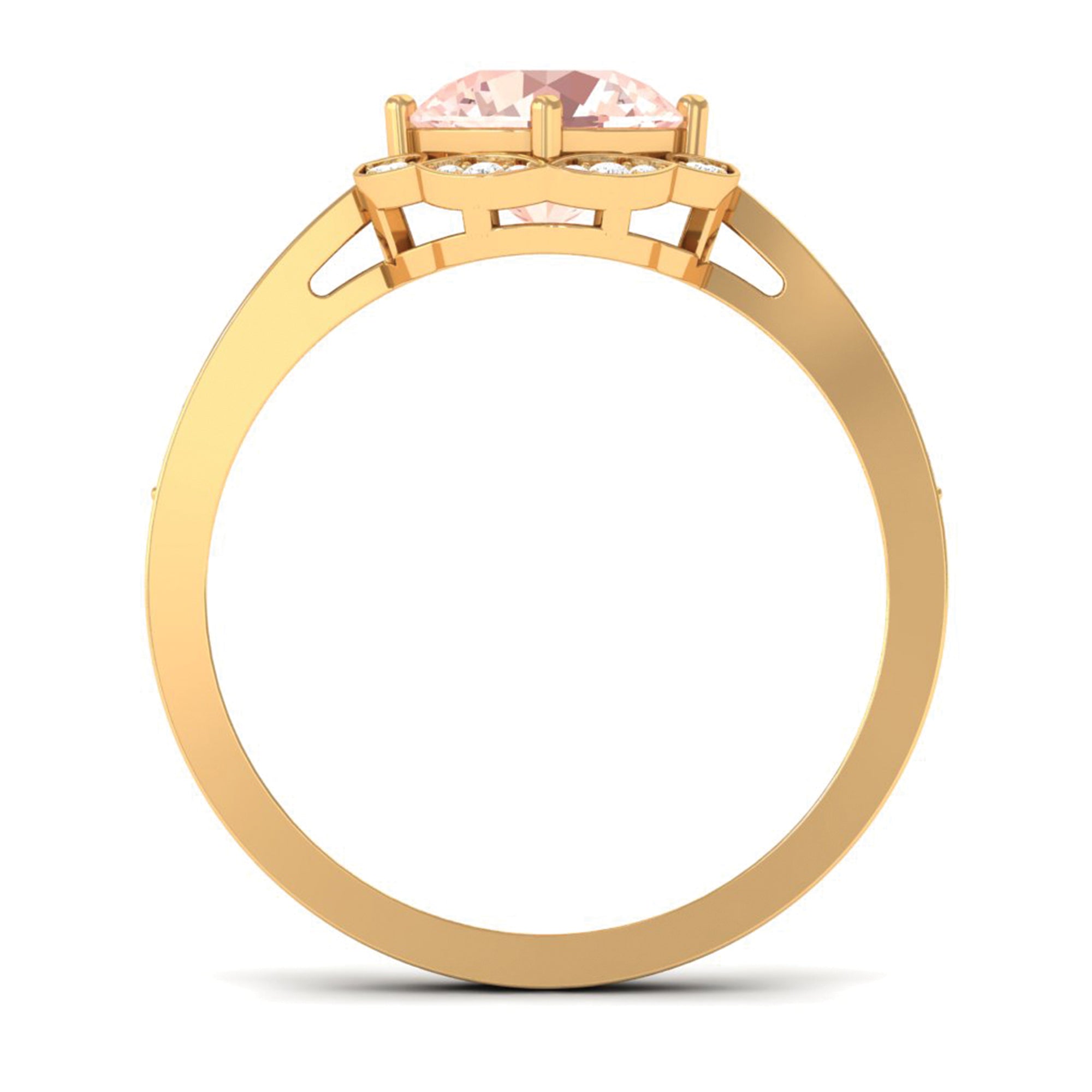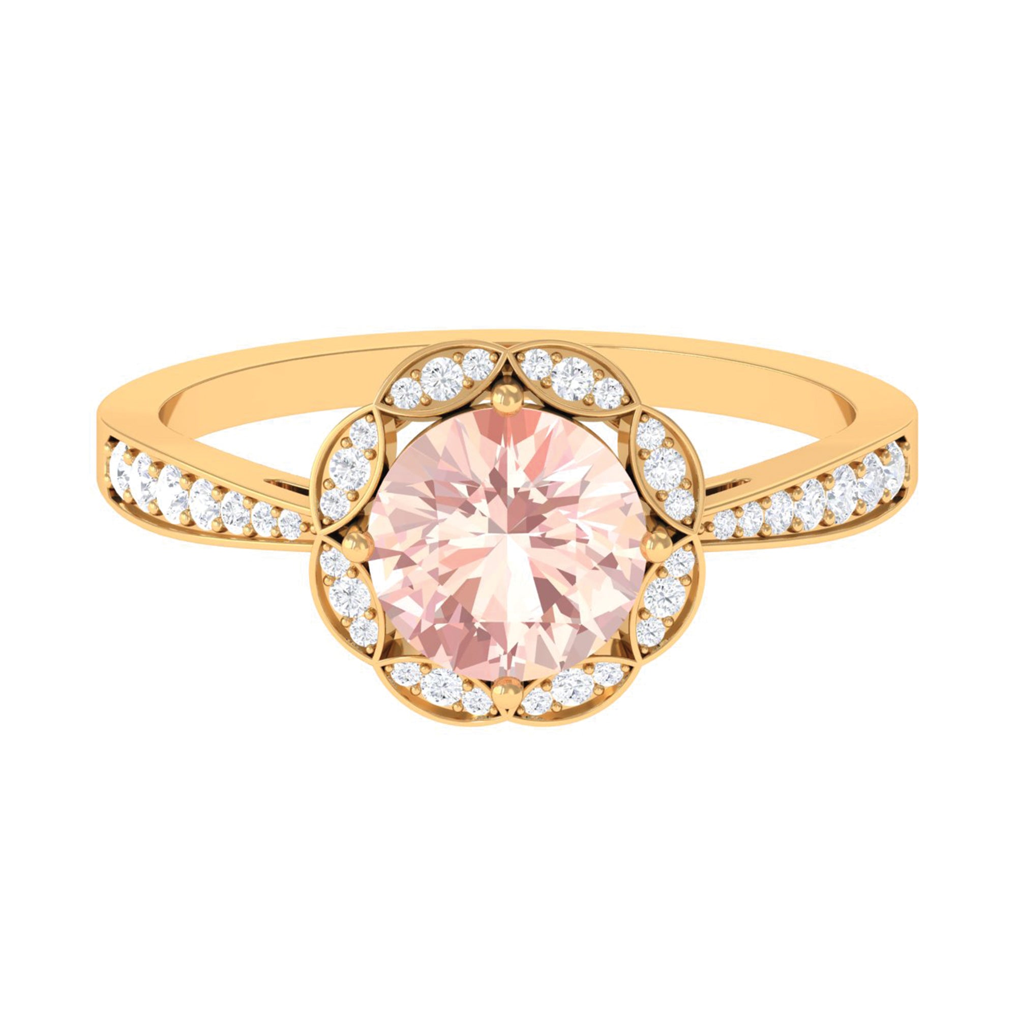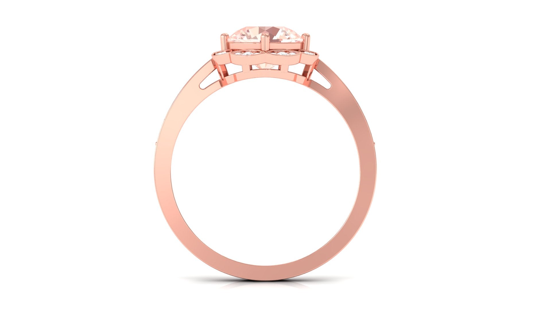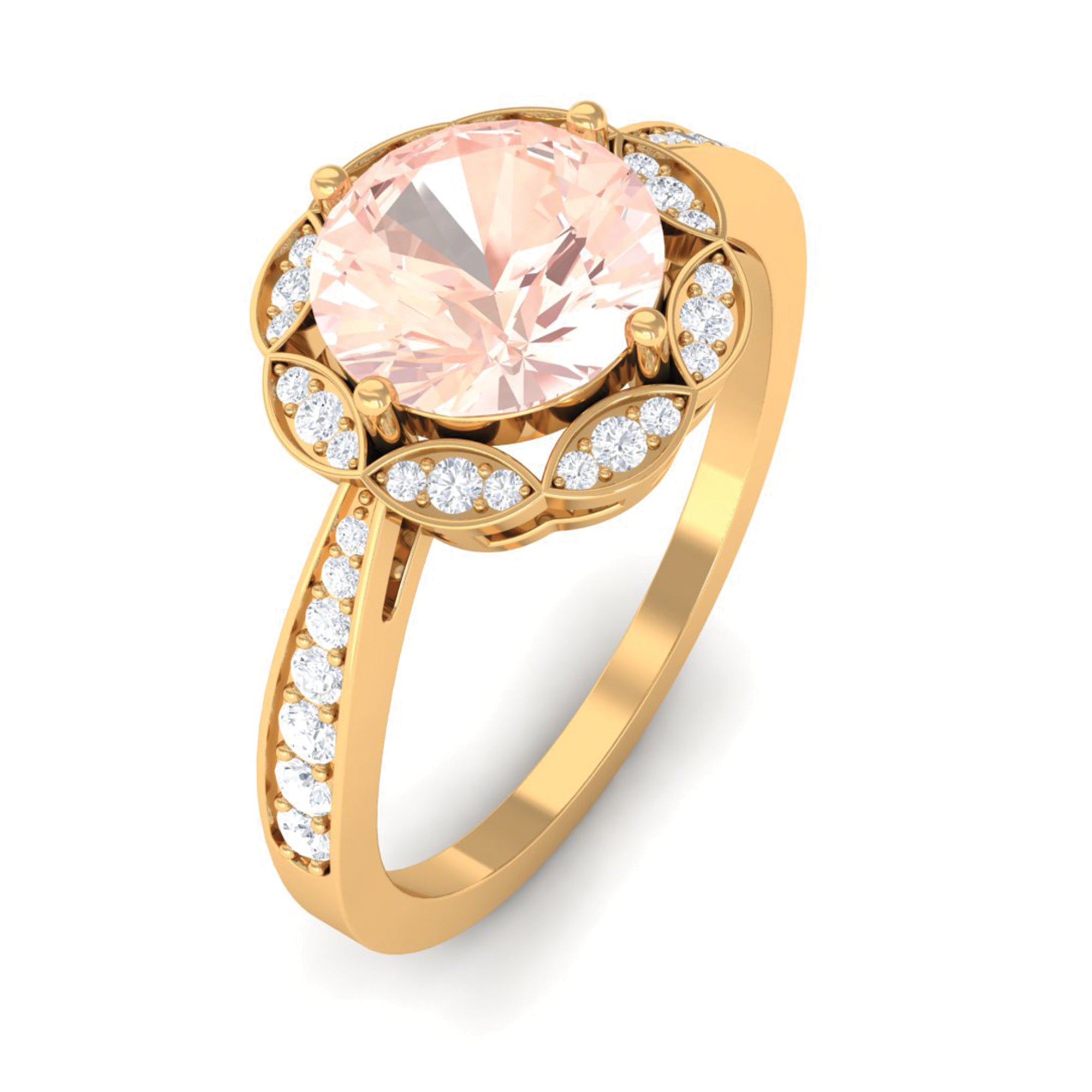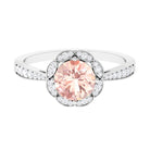 Enveloped by leaf-sequel motifs is a round morganite that mesmerizes with its peach hue in this glitzy halo engagement ring. The centerpiece is held in a prong setting that lends a touch of sophisticated appeal to this morganite ring. Glistening round Diamond adorns the shank for added allure. Wear it as a stand-alone piece for grabbing all the eyeballs.