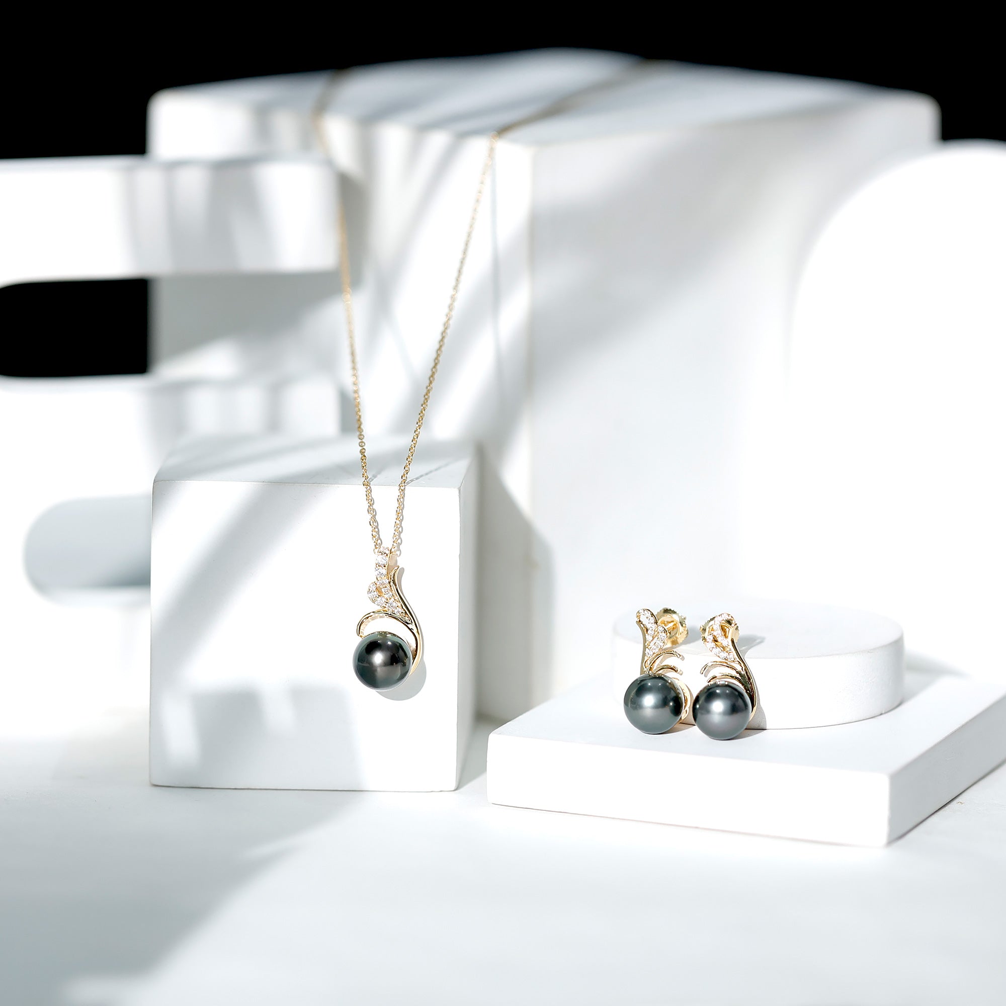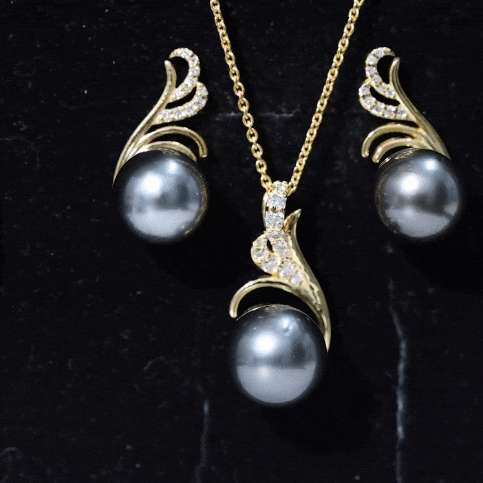 Designer Tahitian Black Pearl Necklace and Earrings Set with Moissanite