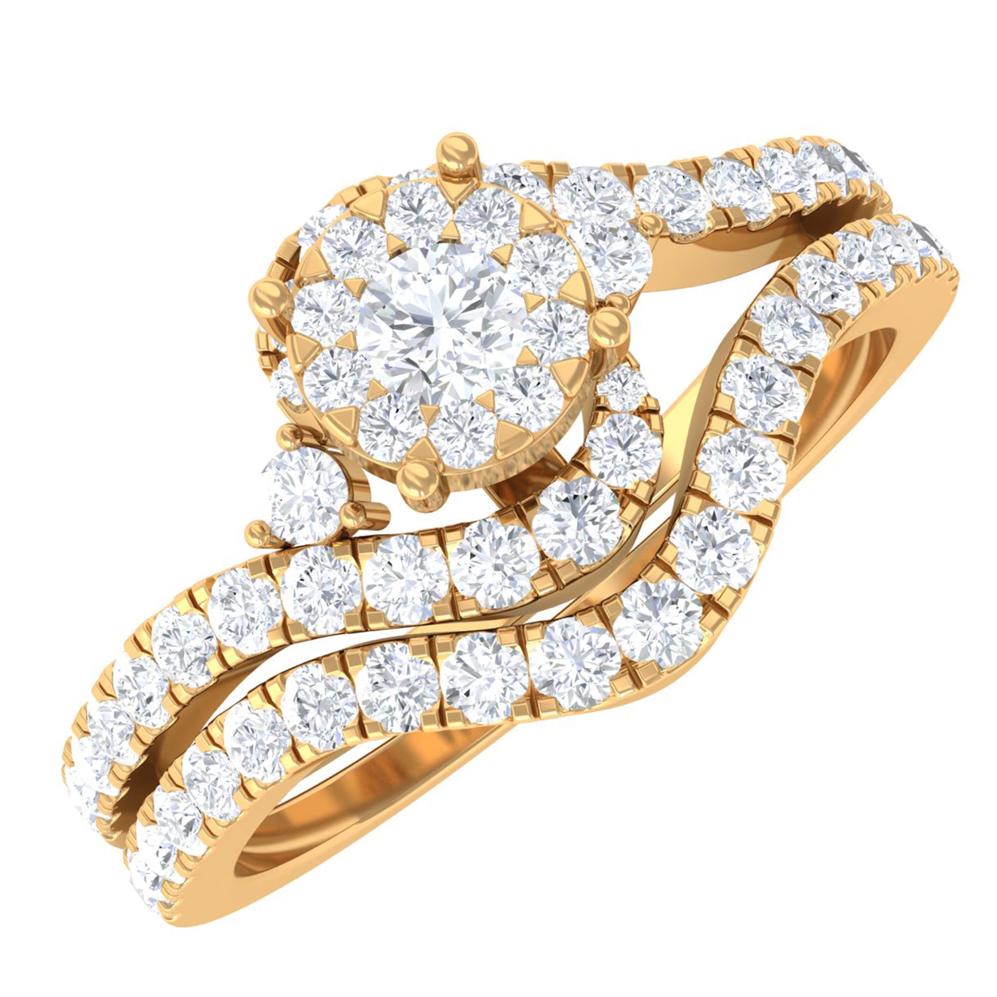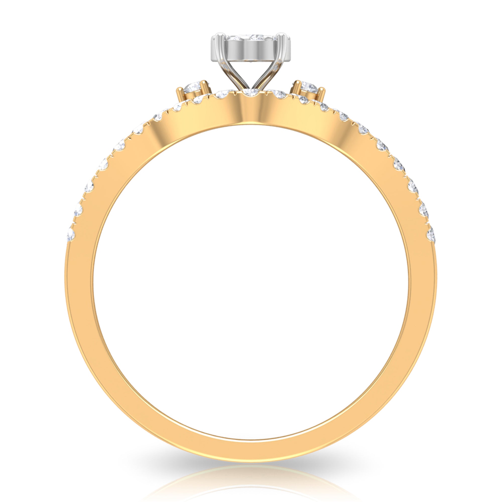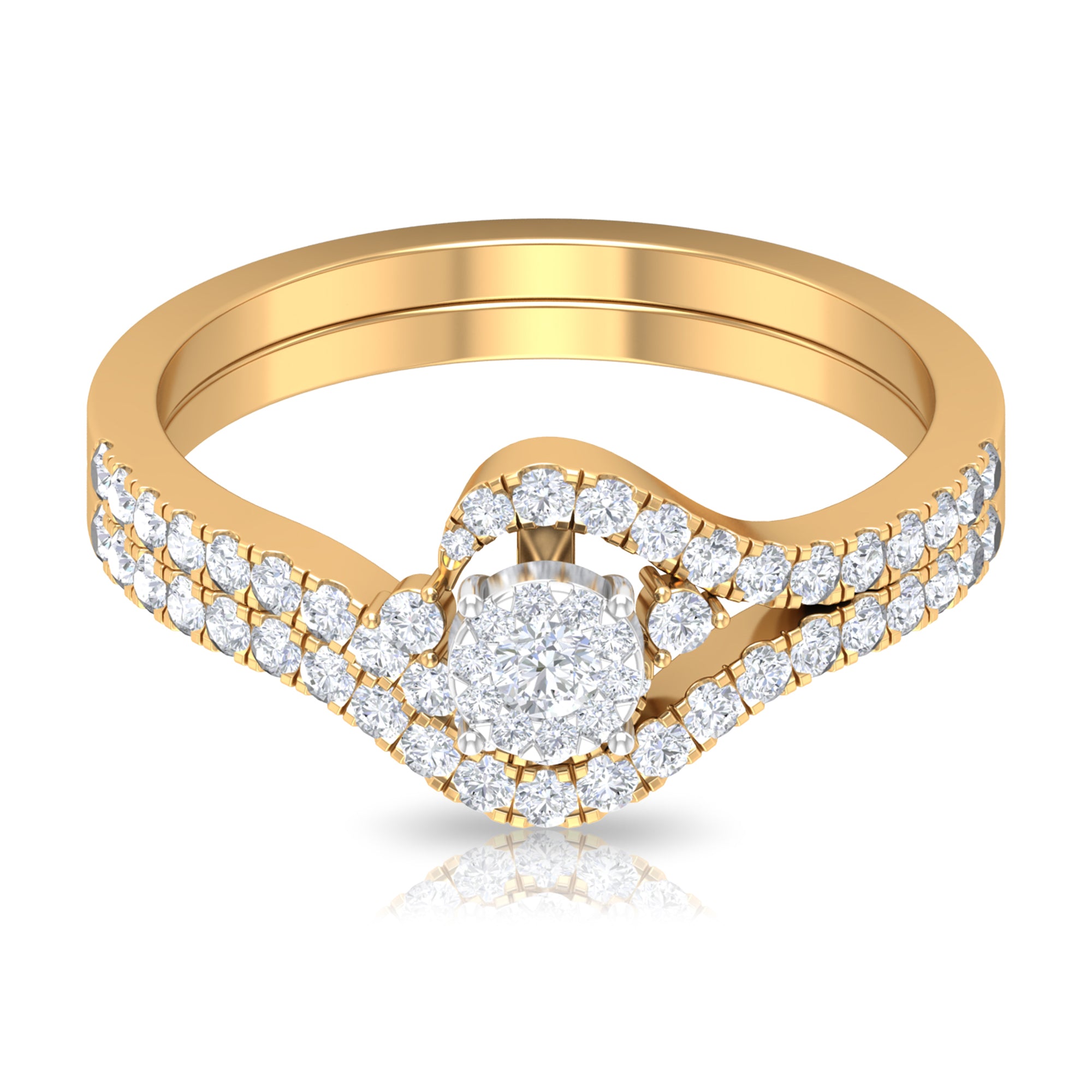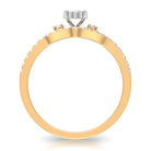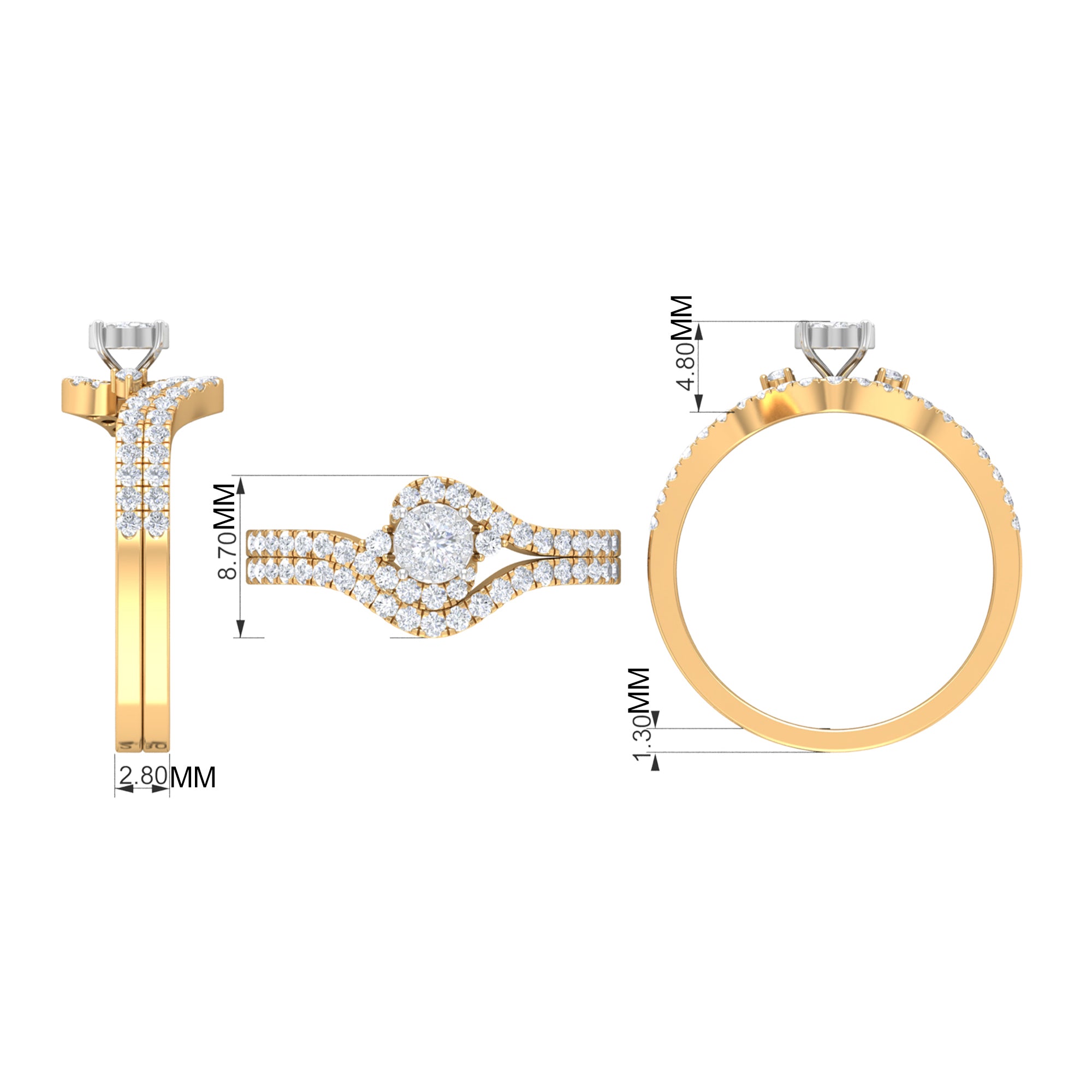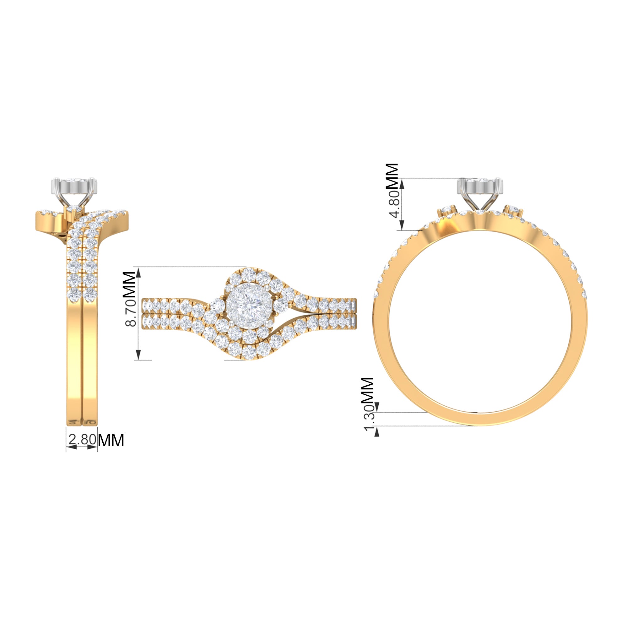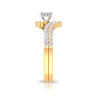 It is a Ring Set for Women, set in Solid Gold and features a Round Cut Diamond as Solitaire embellished in Prong Setting and Round Cut Diamonds as Side Stones embellished in Prong Setting, for you to dazzle like a star.