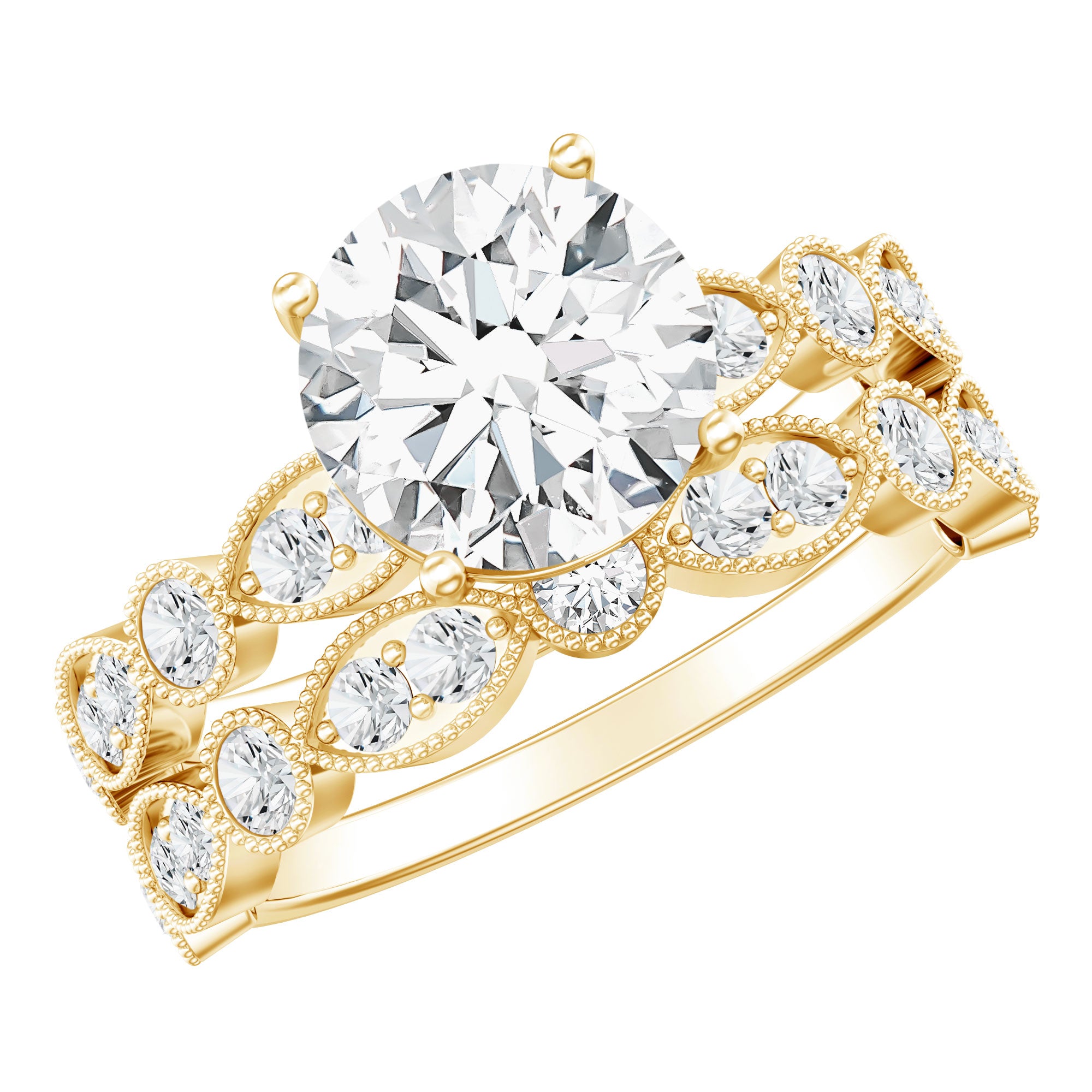 This Lab Created Diamond Wedding Set beautifully combines modern charm with a touch of contemporary elegance, making it a perfect choice for brides who want a mix of classic beauty and modern style. This 2 Piece Ring Set features a Designer Engagement Ring and Band that showcases an 8 MM round cut diamond (lab-grown), securely placed in basket setting with side stones and intricate beaded detailing on a scalloped shank. The matching wedding band is embellished with more diamonds and beaded accents on a scalloped-inspired band, enhancing the overall appeal of this Engagement Ring and Wedding Band Set, creating a textured design that beautifully highlights the diamonds brilliance. This Womens Bridal Ring Set is a thoughtful and budget-friendly way to mark your special day. Made with ethically sourced, lab-grown gemstones, it offers the elegance of fine jewelry while being environmentally friendly. Our talented artisans have designed this stunning and Unique Wedding Ring Set to elevate your bridal style and ensure it remains a cherished piece for years to come. With exquisite details, this Solitaire Ring Set featuring a high-profile base perfectly balances comfort and versatility.