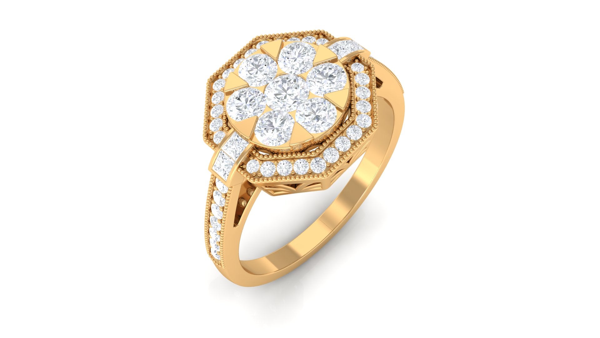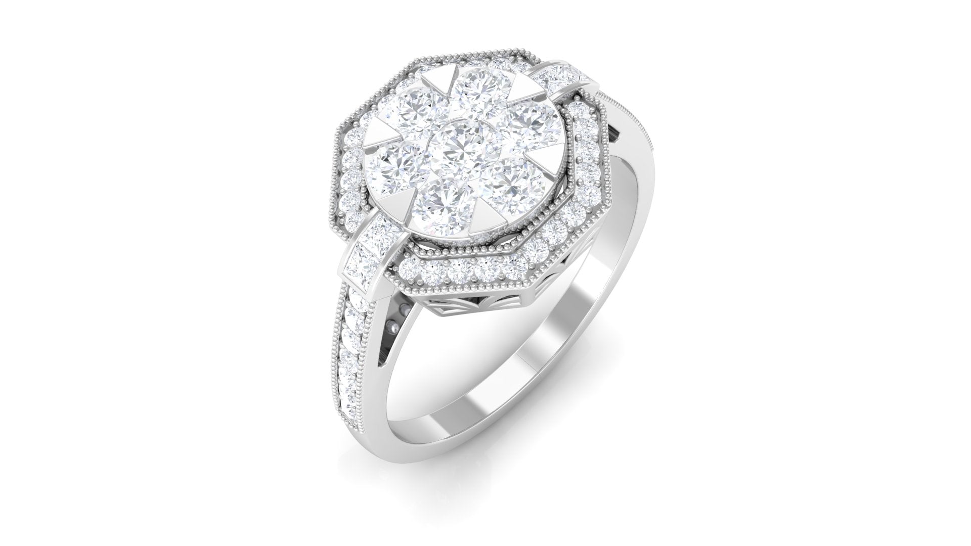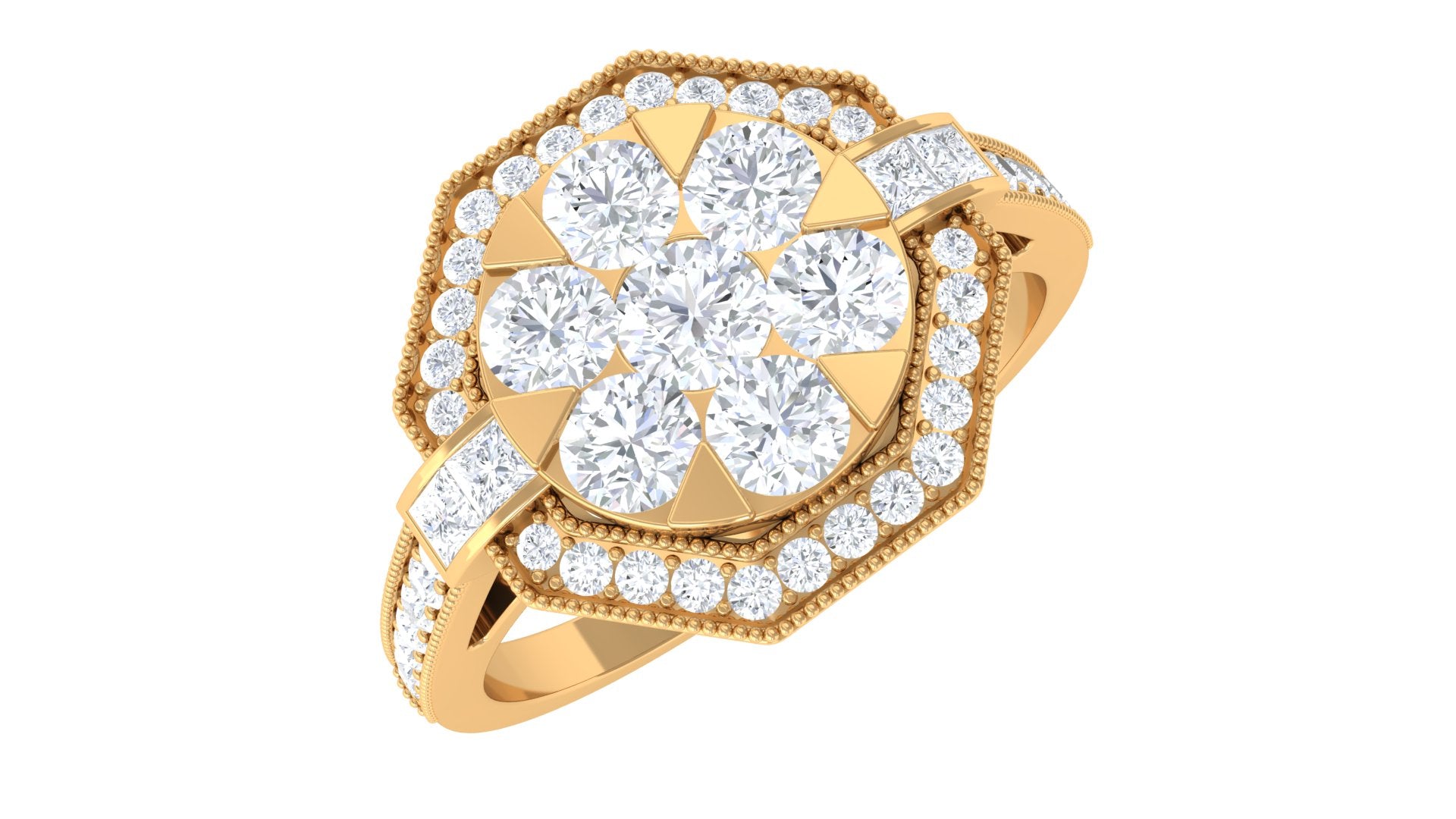 Symbolize the beauty and growth of love with this diamond flower engagement ring. This exquisite ring features a 3 MM diamond in the center supported by a prong setting along with princess-cut diamond side stones. The center stone is flanked by small sparkling diamonds encrusted in a flower style, making this piece more unique and appealing. This is perfect for those who admire beauty with elegance in their style.