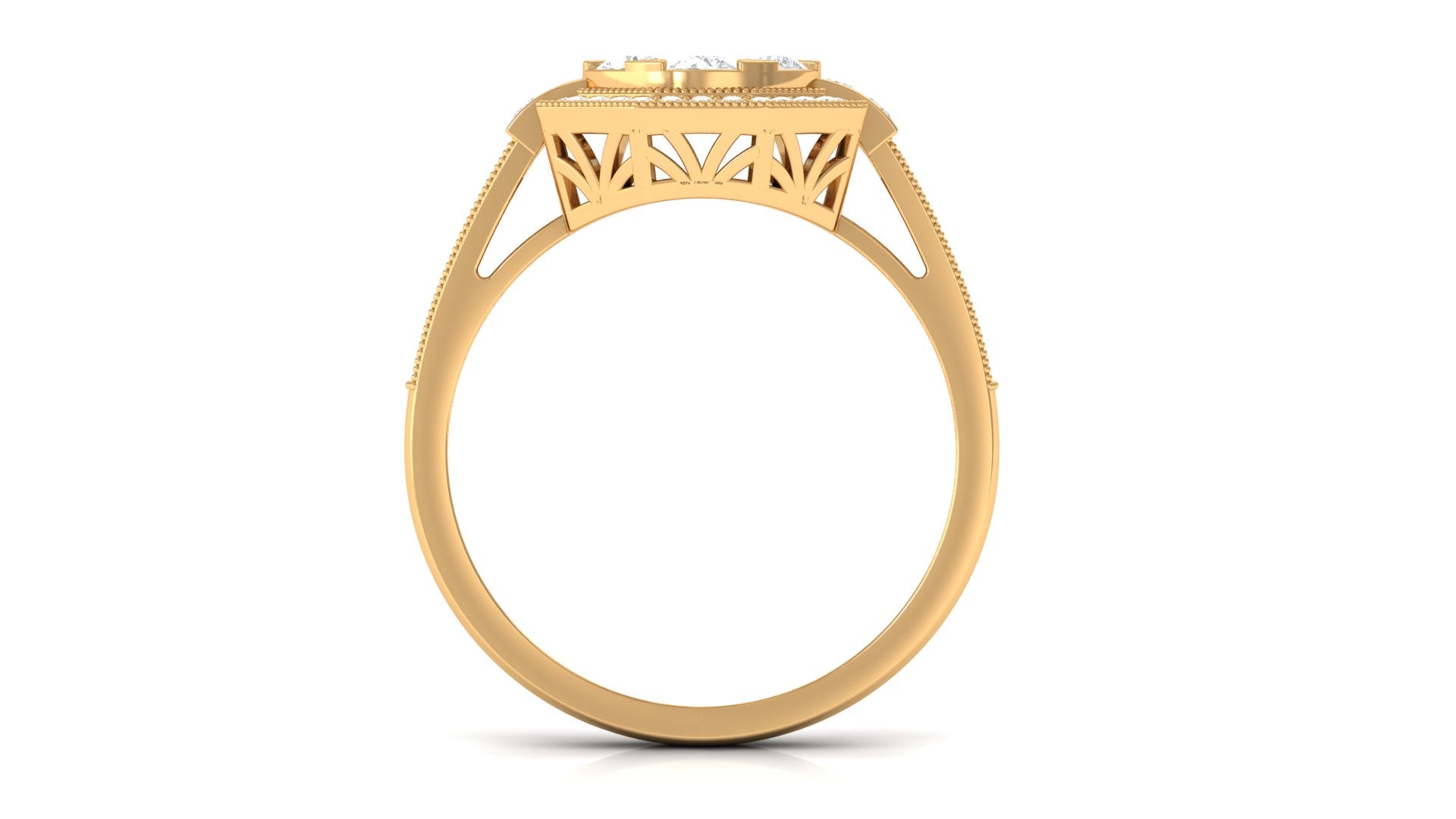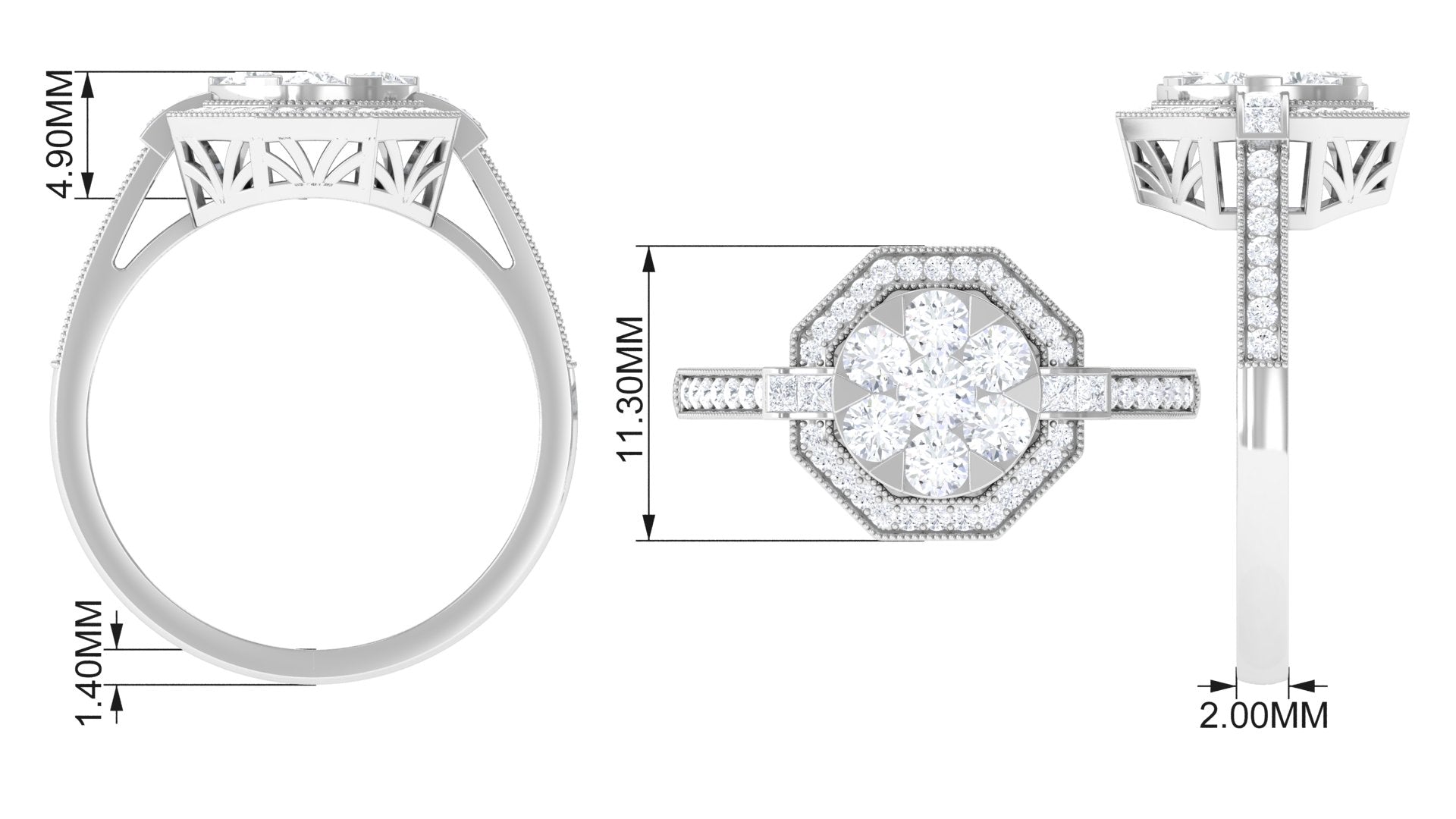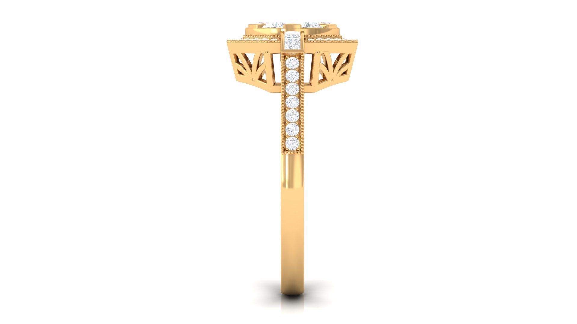 Symbolize the beauty and growth of love with this diamond flower engagement ring. This exquisite ring features a 3 MM diamond in the center supported by a prong setting along with princess-cut diamond side stones. The center stone is flanked by small sparkling diamonds encrusted in a flower style, making this piece more unique and appealing. This is perfect for those who admire beauty with elegance in their style.